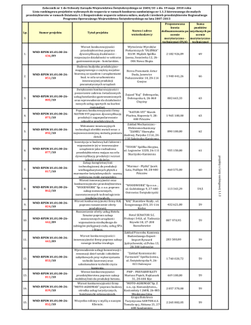 Załacznik nr 1 do Uchwały Zarządu Województwa Świętokrzyskiego nr 2604/10 z dn. 19 maja 2010 roku Lista rankingowa projektów wybranych do wsparcia w ramach konkursu zamkniętego nr 1.1.3 kierowanego do małych przedsiębiorstw w ramach Działania 1.1 Bezpośrednie wsparcie sektora mikro, małych i średnich przedsiębiorstw Regionalnego Programu Operacyjnego Województwa Świętokrzyskiego na lata 2007-2013 Lp. 1. Proponowana Suma kwota punktów dofinansowania po uzyskanych po ocenie ocenie merytoryczno - merytoryczno technicznej (PLN) technicznej Tytuł projektu Nazwa i adres wnioskodawcy WND-RPSW.01.01.00-26436/09 Wzrost konkurencyjności przedsiębiorstwa poprzez dywersyfikację dzałalności rozpoczęcie działalności w sektorze gastronomicznym - hotelarskim. Wytwórnia Wyrobów Piekarniczych "OLEŃKA" B.S.W. Mądzik Spółka Jawna, Sosnówka 12, 26006 Nowa Słupia 2 182 926,89 69 Hercu Pneumatic Artur Duda, Janowice Poduszowskie 10, 28-114 Gnojno 1 948 441,26 66 Zajazd "Raj" Dobrzączka, Dobrzączka 6, 26-060 Chęciny 802 663,33 63 "NATUR-VIT" Marek Płachta, Kopernia 9, 28400 Pińczów 1 965 100,00 63 890 100,00 62 935 150,00 61 460 575,00 60 113 343,29 59,5 432 621,00 59 2. WND-RPSW.01.01.00-26051/10 3. WND-RPSW.01.01.00-26085/10 4. WND-RPSW.01.01.00-26073/10 5. WND-RPSW.01.01.00-26092/10 6. WND-RPSW.01.01.00-26077/10 7. WND-RPSW.01.01.00-26017/10 8. WND-RPSW.01.01.00-26062/10 9. WND-RPSW.01.01.00-26024/10 10. WND-RPSW.01.01.00-26442/09 11. WND-RPSW.01.01.00-26443/09 12. WND-RPSW.01.01.00-26053/10 13. WND-RPSW.01.01.00-26011/10 14. WND-RPSW.01.01.00-26039/10 15. WND-RPSW.01.01.00-26052/10 Budowa budynku produkcyjnomagazynowego z częścią socjalnobiurową ze zjazdem i urządzeniami bud. w celu uruchomienia innowacyjnej produkcji pneumatycznych urządzeń budowlanych. Zwiększenie konkurencyjności i poszerzenie zakresu świadczonych usług hotelarsko-gastronomicznych oraz wprowadzenie do działalności nowych usług opartych na kuchni regionalnej. Poprawa konkurencyjności firmy NATUR-VIT poprzez dywersyfikację produkcji i zagospodarowanie odpadów produkcyjnych. Zakład Mechaniczno Wdrażanie innowacyjnych Elektromechaniczny technologii obróbki metali wraz z "ZAMEL" Skorupka najnowoczesniejszą metodą pomiaru Andrzej, Paryska 111A, 26detali. 110 Sakrżysko-Kamienna Inwestycja w budowę hali lakierni i wyposażenie jej w innowacyjne "TEVOR" Spółka Akcyjna, urządzenie jako rozbudowa ul. Legionów 122D, 26-111 przedsiębiorstwa mająca na celu Skarżysko-Kamienna dywersyfikację produkcji i wzrost jakości produktów. Zakup kompletnej linii "Marmur - Płytki" Jacek technologicznej do produkcji Łata, Podłęże 48, 28-400 wielkogabarytowych płytek z Pińczów marmurów świętokrzyskich - szansą wejścia na rynki europejskie. Wzrost innowacyjności oraz konkurencyjności przedsiębiorstwa "WOODWORK" Sp.z o.o. , "WOODWORK" Sp. z o.o. poprzez ul. Gulińskiego 9, 27-400 zakup nowoczesnych, Ostrowiec Świętokrzyski zaawansowanych technologicznie środków trwałych. Wzrost konkurencyjności firmy KAJ "KAJ" Stanisław Kajdy , ul. poprzez rozszerzenie oferty Ściegiennego 255, 25-116 produktowej. Kielce Rozszerzenie oferty usług Hotelu Hotel SENATOR S.C. Senator poprzez zakup Prokop i S-KA, ul. Tadeusza nowoczesnych urządzeń i Krywki 18, 27-200 wyposażenia niezbędnego do Starachowice zabiegów pielęgnacji ciała, usług SPA i fitness. Zakład Przerobu Kamienia Wzrost konkurencyjności i Budowlanego Exportinnowacyjności firmy poprzez zakup Import Ryszard nowego środka trwałego. Jędrychowski, ul.Polna 13, 28-300 Jędrzejów Wprowadzenie usługi konserwacji i "Zakład Kamieniarski renowacji dzieł sztuki i obiektów Furmanek" Społka Jawna, zabytkowych przy wykorzystaniu ul. Świętokrzyska 9, 26techniki laserowej oraz 021 Daleszyce udoskonalenie techniki cięcia kamienia. Wzrost konkurencyjności PMP - PREFABRYKATY przedsiębiorstwa poprzez zakup Mariusz Piątek, Hajdaszek mobilnej linii do produkcji betonu. 31, 28-404 Kije Wzrost konkurencyjności firmy "MOTO-AGROMAX"Sp. Z "MOTO-AGROMAX" poprzez budowę o.o., sp. Komandytowa,, ośrodka usług turystycznych, Kostomłoty I 260B, 26-085 hotelowychi rekreacyjnych. Miedziana Góra Grupa Hotelowo Wszystko robimy z myślą o naszym Turystyczna SANTUR A.S. Kliencie. Tomala sp.j., Różana 21, 27600 Sandomierz 807 970,95 59 283 500,00 59 1 740 020,72 59 449 100,00 59 2 057 370,00 59 2 265 802,05 59 projekty z Listy rankingowej 1.1.3 Numer projektu 16. WND-RPSW.01.01.00-26438/09 Poprawa innowacyjności przedsiebiorstwa poprzez utworzenie Laboratorium Badań Emisji Lotnych Związków Organicznych oraz Powłok Adhezyjnych. 17. WND-RPSW.01.01.00-26007/10 Uruchomienie produkcji pieczywa metodami tradycyjnymi. 18. WND-RPSW.01.01.00-26091/10 WND-RPSW.01.01.00-26008/10 20. WND-RPSW.01.01.00-26021/10 21. WND-RPSW.01.01.00-26031/10 22. WND-RPSW.01.01.00-26058/10 23. WND-RPSW.01.01.00-26449/09 24. WND-RPSW.01.01.00-26003/10 25. WND-RPSW.01.01.00-26032/10 26. WND-RPSW.01.01.00-26023/10 27. WND-RPSW.01.01.00-26047/10 28. WND-RPSW.01.01.00-26452/09 29. WND-RPSW.01.01.00-26096/10 30. WND-RPSW.01.01.00-26001/10 31. WND-RPSW.01.01.00-26009/10 32. WND-RPSW.01.01.00-26448/09 452 362,50 58 Piekarnia "BIAŁOGON" Jacek Iwanowski, Pańska 30A, 25-811 Kielce 463 710,69 58 P.P.H.U."ATRA"Deroń Andrzej, ul. Kilińskiego 59, 27-400 Ostrowiec Świętokrzyski 208 350,00 58 Przedsiębiorstwo Produkcyjno-UsługowoHandlowe "TAWOL", ul. Radkowska 37, 26-060 Chęciny 900 706,94 58 "KAR" Konrad Zych, Elżbiecin 17, 28-100 Busko - Zdrój 539 079,58 58 Przedsiębiorstwo Drogowe "WOJTRANS", Głowackiego 93, 28-300 Jędrzejów 1 283 355,00 58 RASTER R. Nowak i S-ka spółka jawna, ul. Domaszowska 97 A, 25320 Kielce 263 249,46 57,5 Przedsiębiorstwo Wielobranżowe MARCOTERM, UL. Wspólna 8a, 25-003 Kielce 75 921,65 57 147 208,25 57 1 057 077,00 57 405 000,00 57 445 000,00 57 TRANZIT Sp. Zo.o., Michał Kozłowski, Lubachowy 68, 29-130 Moskorzew 2 207 088,00 57 