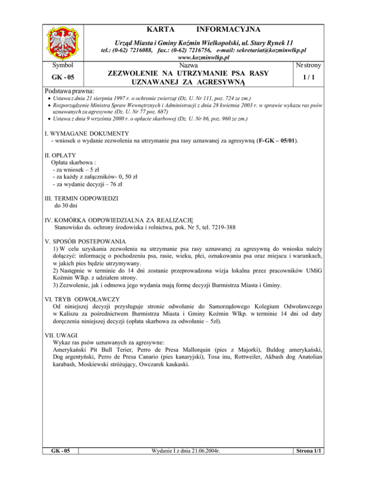 KARTA INFORMACYJNA Urząd Miasta i Gminy Koźmin Wielkopolski, ul. Stary Rynek 11 tel.: (0-62) 7216088, fax.: (0-62) 7216756, e-mail: [email protected] www.kozminwlkp.pl Symbol Nazwa Nr strony GK - 05 ZEZWOLENIE NA UTRZYMANIE PSA RASY UZNAWANEJ ZA AGRESYWNĄ 1/ 1 Podstawa prawna: · Ustawa z dnia 21 sierpnia 1997 r. o ochronie zwierząt (Dz. U. Nr 111, poz. 724 ze zm.) · Rozporządzenie Ministra Spraw Wewnętrznych i Administracji z dnia 28 kwietnia 2003 r. w sprawie wykazu ras psów uznawanych za agresywne (Dz. U. Nr 77 poz. 687) · Ustawa z dnia 9 września 2000 r. o opłacie skarbowej (Dz. U. Nr 86, poz. 960 ze zm.) I. WYMAGANE DOKUMENTY - wniosek o wydanie zezwolenia na utrzymanie psa rasy uznawanej za agresywną (F-GK – 05/01). II. OPŁATY Opłata skarbowa : - za wniosek – 5 zł - za każdy z załączników- 0, 50 zł - za wydanie decyzji – 76 zł III. TERMIN ODPOWIEDZI do 30 dni IV. KOMÓRKA ODPOWIEDZIALNA ZA REALIZACJĘ Stanowisko ds. ochrony środowiska i rolnictwa, pok. Nr 5, tel. 7219-388 V. SPOSÓB POSTEPOWANIA 1) W celu uzyskania zezwolenia na utrzymanie psa rasy uznawanej za agresywną do wniosku należy dołączyć: informację o pochodzeniu psa, rasie, wieku, płci, oznakowaniu psa oraz miejscu i warunkach, w jakich pies będzie utrzymywany. 2) Następnie w terminie do 14 dni zostanie przeprowadzona wizja lokalna przez pracowników UMiG Koźmin Wlkp. z udziałem strony. 3) Zezwolenie, jak i odmowa jego wydania mają formę decyzji Burmistrza Miasta i Gminy. VI. TRYB ODWOŁAWCZY Od niniejszej decyzji przysługuje stronie odwołanie do Samorządowego Kolegium Odwoławczego w Kaliszu za pośrednictwem Burmistrza Miasta i Gminy Koźmin Wlkp. w terminie 14 dni od daty doręczenia niniejszej decyzji (opłata skarbowa za odwołanie – 5zł). VII. UWAGI Wykaz ras psów uznawanych za agresywne: Amerykański Pit Bull Terier, Perro de Presa Mallorquin (pies z Majorki), Buldog amerykański, Dog argentyński, Perro de Presa Canario (pies kanaryjski), Tosa inu, Rottweiler, Akbash dog Anatolian karabash, Moskiewski stróżujący, Owczarek kaukaski. GK - 05 Wydanie I z dnia 21.06.2004r. Strona 1/1