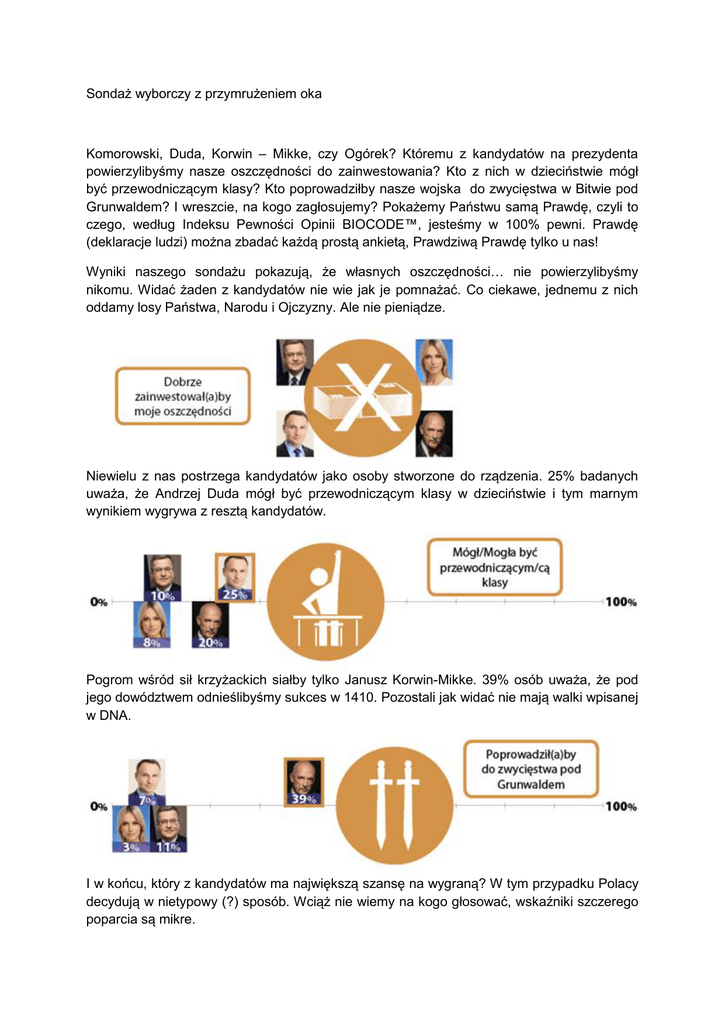 Sondaż wyborczy z przymrużeniem oka Komorowski, Duda, Korwin – Mikke, czy Ogórek? Któremu z kandydatów na prezydenta powierzylibyśmy nasze oszczędności do zainwestowania? Kto z nich w dzieciństwie mógł być przewodniczącym klasy? Kto poprowadziłby nasze wojska do zwycięstwa w Bitwie pod Grunwaldem? I wreszcie, na kogo zagłosujemy? Pokażemy Państwu samą Prawdę, czyli to czego, według Indeksu Pewności Opinii BIOCODE™, jesteśmy w 100% pewni. Prawdę (deklaracje ludzi) można zbadać każdą prostą ankietą, Prawdziwą Prawdę tylko u nas! Wyniki naszego sondażu pokazują, że własnych oszczędności… nie powierzylibyśmy nikomu. Widać żaden z kandydatów nie wie jak je pomnażać. Co ciekawe, jednemu z nich oddamy losy Państwa, Narodu i Ojczyzny. Ale nie pieniądze. Niewielu z nas postrzega kandydatów jako osoby stworzone do rządzenia. 25% badanych uważa, że Andrzej Duda mógł być przewodniczącym klasy w dzieciństwie i tym marnym wynikiem wygrywa z resztą kandydatów. Pogrom wśród sił krzyżackich siałby tylko Janusz Korwin-Mikke. 39% osób uważa, że pod jego dowództwem odnieślibyśmy sukces w 1410. Pozostali jak widać nie mają walki wpisanej w DNA. I w końcu, który z kandydatów ma największą szansę na wygraną? W tym przypadku Polacy decydują w nietypowy (?) sposób. Wciąż nie wiemy na kogo głosować, wskaźniki szczerego poparcia są mikre. Za to wiemy kogo hejtować. Z marzeniami o fotelu prezydenckim mogą się pożegnać Magdalena Ogórek, Andrzej Duda i Janusz Korwin-Mikke. Ponad połowa osób zdecydowanie i pewnie odrzuca ich kandydaturę. Najmniejszy hejt dostaje Bronisław Komorowski (14%) i tym samym wygrywa z resztą kandydatów. Mili Państwo, wygląda na to, że wybieramy mniejsze zło. Bądźmy szczerzy, żaden z kandydatów nie jest ideałem, żadnego z nich nie jesteśmy pewni. Wniosek z tego taki mamy wakat! Może jest ktoś chętny? 2020 już nie długo!