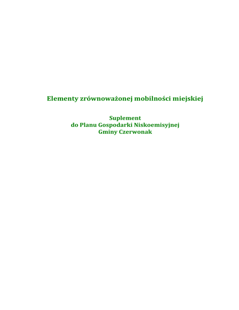 Elementy zrównoważonej mobilności miejskiej Suplement do Planu Gospodarki Niskoemisyjnej Gminy Czerwonak Elementy zrównoważonej mobilności miejskiej SPIS TREŚCI 1. Wstęp. Zakres i cel opracowania ............................................................................................. 3 2. Ogólna diagnoza zrównoważonej mobilności na terenie gminy Czerwonak i określenie obszarów interwencji ............................................................................................ 6 2.1. Ogólna charakterystyka gminy Czerwonak ....................................................................... 6 2.2...Zagospodarowanie przestrzenne .......................................................................................... 7 2.3...Sieć drogowa .................................................................................................................................. 9 2.4...Motoryzacja indywidualna .................................................................................................... 11 2.5...Sieć parkingowa ......................................................................................................................... 12 2.6...Drogowy transport zbiorowy ............................................................................................... 13 2.7...Transport kolejowy .................................................................................................................. 15 3. Cel główny i cele szczegółowe planu w zakresie mobilności ................................... 17 4. Działania w zakresie mobilności miejskiej ....................................................................... 19 4.1. Szczegóły opis działań w zakresie mobilności .............................................................. 21 4.1.1. Transport niezmotoryzowany rowerowy i pieszy .................................................. 21 4.1.2. Publiczny transport zbiorowy .......................................................................................... 23 4.1.3. Transport indywidualny ..................................................................................................... 25 4.1.4. Wzrost intermodalności ...................................................................................................... 27 4.1.5. Wdrażanie nowych wzorców zachowań komunikacyjnych ................................ 29 4.1.6. Zarządzanie mobilnością .................................................................................................... 30 4.1.7. Logistyka miejska ................................................................................................................... 31 4.1.8. Inteligentne systemy transportowe ............................................................................... 31 4.2. Proces wdrażania elementów zrównoważonej mobilności miejskiej ................ 32 4.3. Zgodność działań związanych z mobilnością miejską zawartych w Planie Gospodarki Niskoemisyjnej z działaniami zawartymi w strategii kraju, województwa, aglomeracji i gminy ................................................................................ 33 5. Działania wynikające z programu ochrony powietrza dla strefy wielkopolskiej .............................................................................................................................................................. 38 2 Suplement do Planu Gospodarki Niskoemisyjnej Gminy Czerwonak 1. Wstęp. Zakres i cel opracowania Niniejszy dokument stanowi suplement do Planu Gospodarki Niskoemisyjnej Gminy Czerwonak i określa wpływ działań zawartych w planie, na mobilność mieszkańców gminy w miejskim obszarze funkcjonalnym Poznania. Dokument został przygotowany zgodnie z wymaganiami zawartymi w dokumencie Komisji Europejskiej COM(2013) 913 z dnia 17.12.2013 r. pt. „Koncepcja dotycząca planów mobilności w miastach zgodnej z zasadami zrównoważonego rozwoju”, stanowiącym załącznik nr 1 do Komunikatu Komisji do Parlamentu Europejskiego, Rady, Europejskiego Komitetu Ekonomiczno-Społecznego i Komitetu Regionów „Wspólne dążenie do osiągnięcia konkurencyjnej i zasobooszczędnej mobilności w miastach”. Głównym celem działań w zakresie mobilności jest zwiększenie dostępności wszystkich obszarów gminy, stanowiących element miejskiego obszaru funkcjonalnego Poznania oraz zapewnienie wysokiej jakości przemieszczania się zgodnymi z zasadami zrównoważonego rozwoju, które obejmuje: • dojazd do miejskiego obszaru funkcjonalnego, • przejazd przez ten obszar, jak również • przemieszczanie się w jego obrębie. Główny cel działań mobilnościowych jest ściśle powiązany z głównym celem Planu Gospodarki Niskoemisyjnej który zakłada transformację gminy w kierunku gospodarki niskoemisyjnej, poprzez: • • • • ograniczenie emisji gazów cieplarnianych, poprawę efektywności energetycznej, wzrost wykorzystania energii ze źródeł odnawialnych i poprawę jakości powietrza. Realizacja tych celów pod względem mobilnościowym zakłada: • preferencję różnorodnych środków transportu zbiorowego w podróżach zewnętrznych oraz pomiędzy najbardziej odległymi miejscowościami gminy, • preferencję ruchu pieszego i rowerowego wewnątrz gminy, zwłaszcza na obszarze sąsiadujących miejscowości, • podejmowanie działań do pełnego wykorzystania pojemności używanych środków transportu, • modernizację układu drogowego tak, aby minimalizować przebiegi pojazdów na terenie gminy, • modernizację skrzyżowań ułatwiających włączanie się do ruchu z dróg gminnych na drogę wojewódzką i drogi powiatowe o dużym natężeniu ruchu (skrzyżowania z ruchem okrężnym i skrzyżowania skanalizowane), • wspieranie działań pozostałych interesariuszy umożliwiających tworzenie sieci drogowej, w ramach której możliwe jest rozdzielenie ruchu tranzytowego od lokalnego na terenie gminy, zwłasz
