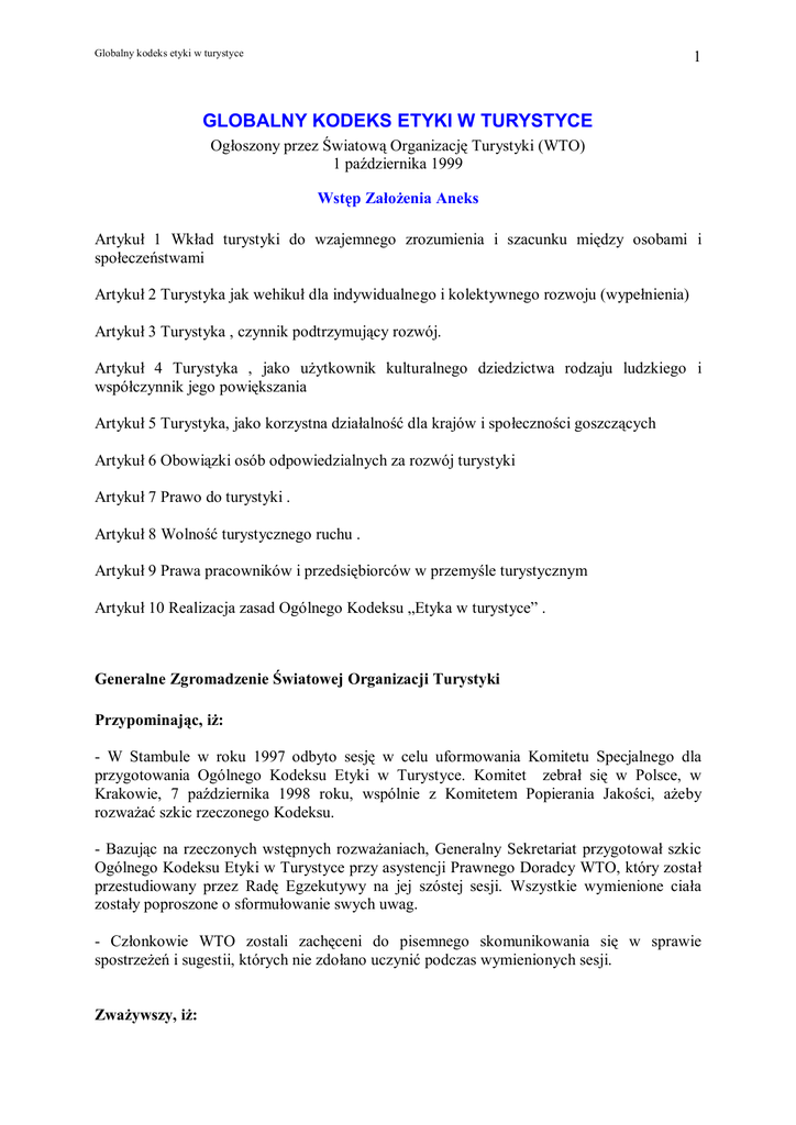 Globalny kodeks etyki w turystyce 1 GLOBALNY KODEKS ETYKI W TURYSTYCE Ogłoszony przez Światową Organizację Turystyki (WTO) 1 października 1999 Wstęp Założenia Aneks Artykuł 1 Wkład turystyki do wzajemnego zrozumienia i szacunku między osobami i społeczeństwami Artykuł 2 Turystyka jak wehikuł dla indywidualnego i kolektywnego rozwoju (wypełnienia) Artykuł 3 Turystyka , czynnik podtrzymujący rozwój. Artykuł 4 Turystyka , jako użytkownik kulturalnego dziedzictwa rodzaju ludzkiego i współczynnik jego powiększania Artykuł 5 Turystyka, jako korzystna działalność dla krajów i społeczności goszczących Artykuł 6 Obowiązki osób odpowiedzialnych za rozwój turystyki Artykuł 7 Prawo do turystyki . Artykuł 8 Wolność turystycznego ruchu . Artykuł 9 Prawa pracowników i przedsiębiorców w przemyśle turystycznym Artykuł 10 Realizacja zasad Ogólnego Kodeksu „Etyka w turystyce” . Generalne Zgromadzenie Światowej Organizacji Turystyki Przypominając, iż: - W Stambule w roku 1997 odbyto sesję w celu uformowania Komitetu Specjalnego dla przygotowania Ogólnego Kodeksu Etyki w Turystyce. Komitet zebrał się w Polsce, w Krakowie, 7 października 1998 roku, wspólnie z Komitetem Popierania Jakości, ażeby rozważać szkic rzeczonego Kodeksu. - Bazując na rzeczonych wstępnych rozważaniach, Generalny Sekretariat przygotował szkic Ogólnego Kodeksu Etyki w Turystyce przy asystencji Prawnego Doradcy WTO, który został przestudiowany przez Radę Egzekutywy na jej szóstej sesji. Wszystkie wymienione ciała zostały poproszone o sformułowanie swych uwag. - Członkowie WTO zostali zachęceni do pisemnego skomunikowania się w sprawie spostrzeżeń i sugestii, których nie zdołano uczynić podczas wymienionych sesji. Zważywszy, iż: Globalny kodeks etyki w turystyce 2 - zasady Ogólnego Kodeksu Etyki w Turystyce wzbudziły duże zainteresowanie wśród delegacji, które uczestniczyły w siódmej sesji Komisji Rozwoju (Commision on Sustainable Development - CSD) odbytej w Nowym Jorku w kwietniu 1999 roku, - po sesji CSD, Sekretariat Generalny podjął dodatkowe konsultacje z instytucjami reprezentującymi przemysł turystyczny oraz pracowników sektora, jak też z poza rządowymi organizacjami zainteresowanymi niniejszym procesem redakcyjnym, - w rezultacie rzeczonych dyskusji i konsultacji, Sekretariat Generalny otrzymał szereg pism, które zostały, na tyle na ile to było możliwe, poddane refleksji oraz przedstawione w skrócie pod rozwagę Zgromadzeniu; Potwierdzając, iż celem Ogólnego Kodeksu Etyki w Turystyce jest ustalenie syntezy rozmaitych dokumentów, kodeksów i deklaracji obejmujących tę samą dziedzinę, a które w ostatnich latach zostały wydane w podobnych intencjach, jak też porównania ich z nowym namysłem nad rozwojem naszych społeczeństw oraz uczynienia go dokumentem służącym jako ramowe odniesienie dla osób odpowiedzialnych za światową turystykę u progu nowego wieku i milenium. Przyjmuje Ogólny Kodeks Etyki w Turystyce, który brzmi następująco: PREAMBUŁA My , Członkowie Światowej Organizacji Turystyki ( WTO) reprezentanci światowego przemysłu turystycznego, delegacje państw, terytoriów, inicjatyw, instytucji i innych ciał, zebrani na Generalnym Zgromadzeniu w Santiago, Chile w pierwszym dniu października 1999 r. W ścisłej łączności z celami nakreślonymi w 3 artykule statutu WTO, świadomi „decyzyjnej i centralnej roli” tej Organizacji, jak to rozpoznała Generalna Ambasada Narodów Zjednoczonych, w celu promocji i rozwoju turystyki, zamierzając współpracować dla ekonomicznego rozwoju, międzynarodowego zrozumienia, pokoju, pomyślności i zapewnienia powszechnego szacunku oraz przestrzegania praw ludzkich i podstawowych wolności bez względu na rasę, płeć, język i religię; Mocno wierząc, że przez bezpośrednie, spontaniczne i nie medialne kontakty, zrodzone między mężczyznami i kobietami, kulturami i sposobami życia, oraz to że turystyka reprezentuje żywotną siłę dla pokoju i jest czynnikiem przyjaźni oraz wzajemnego zrozumienia między ludźmi na całym świecie; Mając na uwadze racjonalną troskę o zachowanie środowiska, ekonomicznego rozwoju, walkę przeciw przemocy w stosunku do człowieka, jak to sformułowały Narody Zjednoczone w deklaracji podczas "Szczytu Ziemi" w 1992 roku w Rio de Janeiro i wyraziły w Agendzie nr 21, adoptując do sytuacji; Biorąc w rachubę szybki i ciągły wzrost (oba obserwowane w przeszłości i do przewidzenia w przyszłości) aktywności turystycznej, czy to przeznaczonego dla wolnego czasu, biznesu, kultury, religii bądź zdrowia, oraz znamienne skutki tegoż wzrostu, pozytywne bądź Globalny kodeks etyki w turystyce 3 negatywne, w środowisku, ekonomii i społeczeństwie (krajów pochodzenia i przyjmujących turystów), wpływu zaznaczającego się wśród lokalnych społeczności i tubylczej ludności, zarówno w międzynarodowych stosunkach jak i handlu; Dążąc do promowania odpowiedzialnej, stale rozwijającej się i powszechnie dostępnej turystyki w ramach prawa wszystkich osób do korzystania z wartości wolnego czasu celem wypoczynku bądź podróży, respektując prawo wyboru przysługującego społeczeństwom całego świata; W przekonaniu, że światowy przemysł turystyczny jako całość ma dużo do uzyskania przez działalność w otoczeniu, które faworyzuje rynkową ekonomię, prywatną przedsiębiorczość i wolny handel oraz służy optymalizowaniu korzystnych skutków w tworzeniu zamożności i miejsc pracy; Mocno przekonani, iż przez dostarczenie pewnej ilości zasad i reguł postępowania, odpowiedzialna i rozwijająca się turystyka nie stanie w żadnej sprzeczności z rozwijającą się liberalizacją warunków handlu i usług, pod której egidą znajdują się przedsięwzięcia tegoż sektora oraz przekonani, iż jest możliwe pogodzenie w tym sektorze ekonomii i ekologii, środowiska i rozwoju, otwarcia dla 