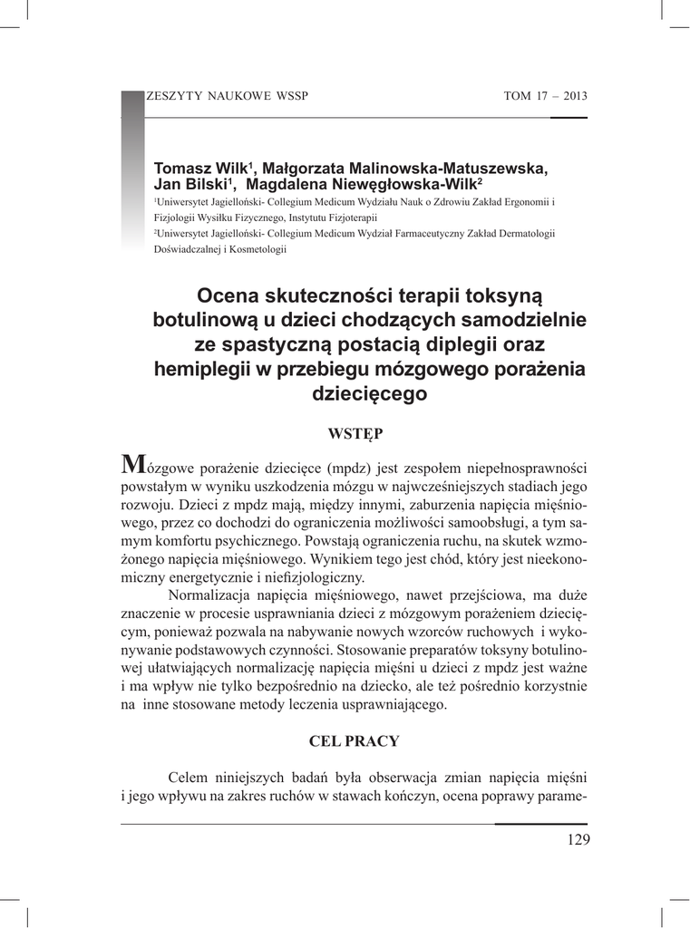 ZESZYTY NAUKOWE WSSP TOM 17 – 2013 Tomasz Wilk1, Małgorzata Malinowska-Matuszewska, Jan Bilski1, Magdalena Niewęgłowska-Wilk2 Uniwersytet Jagielloński- Collegium Medicum Wydziału Nauk o Zdrowiu Zakład Ergonomii i Fizjologii Wysiłku Fizycznego, Instytutu Fizjoterapii 2 Uniwersytet Jagielloński- Collegium Medicum Wydział Farmaceutyczny Zakład Dermatologii Doświadczalnej i Kosmetologii 1 Ocena skuteczności terapii toksyną botulinową u dzieci chodzących samodzielnie ze spastyczną postacią diplegii oraz hemiplegii w przebiegu mózgowego porażenia dziecięcego WSTĘP Mózgowe porażenie dziecięce (mpdz) jest zespołem niepełnosprawności powstałym w wyniku uszkodzenia mózgu w najwcześniejszych stadiach jego rozwoju. Dzieci z mpdz mają, między innymi, zaburzenia napięcia mięśniowego, przez co dochodzi do ograniczenia możliwości samoobsługi, a tym samym komfortu psychicznego. Powstają ograniczenia ruchu, na skutek wzmożonego napięcia mięśniowego. Wynikiem tego jest chód, który jest nieekonomiczny energetycznie i niefizjologiczny. Normalizacja napięcia mięśniowego, nawet przejściowa, ma duże znaczenie w procesie usprawniania dzieci z mózgowym porażeniem dziecięcym, ponieważ pozwala na nabywanie nowych wzorców ruchowych i wykonywanie podstawowych czynności. Stosowanie preparatów toksyny botulinowej ułatwiających normalizację napięcia mięśni u dzieci z mpdz jest ważne i ma wpływ nie tylko bezpośrednio na dziecko, ale też pośrednio korzystnie na inne stosowane metody leczenia usprawniającego. CEL PRACY Celem niniejszych badań była obserwacja zmian napięcia mięśni i jego wpływu na zakres ruchów w stawach kończyn, ocena poprawy parame- 129 T. WILK, M. MALINOWSKA-MATUSZEWSKA, J. BILSKI, M.NIEWĘGŁOWSKA-WILK trów chodu u dzieci z diplegią oraz hemiplegią po kolejnych wstrzyknięciach toksyny botulinowej typu A oraz ocena wpływu zastosowanego leczenia na ogólny rozwój dziecka. MATERIAŁY I METODY Badania przeprowadzono w Dziale Rehabilitacji Uniwersyteckiego Szpitala Dziecięcego Collegium Medicum UJ w Krakowie, w latach 2004-2006. Do badań zakwalifikowano 24 pacjentów w wieku od 10 do 17 lat (x= 14 lat) według przyjętych kryteriów. Do terapii wykorzystano preparat BTX-A Dysport. Wszyscy pacjenci byli jednocześnie usprawniani według neurofizjologicznych zasad stymulacji rozwoju psychoruchowego (NDT-Bobath). Analizy dokonano, porównując wyniki badania wstępnego, przeprowadzonego w dniu pierwszego podania BTX-A z wynikami uzyskanymi w kolejnych badaniach. W ocenie rehabilitacyjno-ortopedycznej uwzględniono pomiary długości i obwodów kończyn dolnych oraz zakresy ruchów w stawach kończyn dolnych za pomocą goniometru. Do oceny wzorca chodu zastosowano 4-pkt. Zmodyfikowaną Skalę Porządkową (ZSP). Napięcie mięśniowe oceniano wg skali Ashworth. WYNIKI Ocena napięcia mięśniowego u dzieci z hemiplegią wykazała poprawę u 66,7% dzieci, a największe zmiany zauważono u dzieci, które w badaniu wstępnym miały duże napięcie mięśniowe (3 lub 4 punkty w skali Ashworth). Wyniki oceny napięcia mięśniowego w grupie dzieci z diplegią nie wykazały żadnej poprawy u jednego dziecka, u 33,3% dzieci poprawa nie nastapiła tylko w przypadku jednej kończyny dolnej. U 66,7% dzieci zaobserwowano poprawę, a istotne zmniejszenie napięcia miało miejsce u 20,8% dzieci. Analiza zmian wzorca chodu w grupie dzieci z hemiplegią wykazała brak poprawy u 16,7% badanych. Reszta badanych uzyskała poprawę (83,3%). Natomiast w badaniu końcowym 33,3% dzieci osiągnęło chód prawidłowy z propulsją. Analiza zmian wzorca chodu w drugiej grupie wykazała, że 8,3% dzieci z diplegią osiągnęło w badaniu końcowym wzorzec „palce-palce”, 33,3% – wzorzec „palce lub cała stopa”, 54,2% – chód na całej stopie z obciążaniem, lecz bez propulsji, a 4,2% badanych dzieci chodziło w sposób prawidłowy z propulsją. 130 OCENA SKUTECZNOŚCI TERAPII TOKSYNĄ BOTULINOWĄ Stwierdzono również, że w 90 % przypadków po zastosowanym leczeniu uzyskano poprawę w ocenie subiektywnej dzieci i rodziców. DYSKUSJA Porażenie mózgowe po raz pierwszy opisał w 1861 roku William Little, angielski chirurg ortopeda. Opisywał on zaburzenie dotykające dzieci w pierwszym roku życia i charakteryzujące się spastycznością kończyn dolnych, a w mniejszym stopniu również kończyn górnych. Dzieci te miały trudności z chwytaniem rzeczy oraz z raczkowaniem. Później pojawiały się problemy z chodzeniem[1]. Przez wiele lat opisywane nieprawidłowości określano wspólnym mianem choroby Little’a. Obecnie ta postać porażenia mózgowego nazywa się porażeniem obustronnym spastycznym (diplegia spastica) [2]. U dzieci z diplegią charakterystyczne jest występowanie porażenia obustronnego spastycznego kończyn dolnych oraz niewielkich zmian w kończynach górnych. Spastyczne napięcie mięśni brzuchatych podudzi powoduje zgięcie podeszwowe stóp. Taki układ kończyn dolnych jest przyczyną ich krzyżowania się w trakcie próby uniesienia dziecka (dodatni objaw scyzorykowy). Nieprawidłowe automatyzmy dotyczą również kończyn górnych, które zwykle dziecko układa lekko zgięte we wszystkich stawach[3]. Skuteczna okazała się więc toksyna boltulinowa BTX-A, która jest silnym jadem pochodzenia organicznego[4]. Lek ten jest białkiem produkowanym przez Gram (+) laseczki Clostririum Botulinum. Badania mechanizmu działania toksyny botulinowej przeprowadzone w 1949 roku wykazały, że wpływa ona na połączenia nerwowo-mięśniowe. Zainteresowanie leczeniem botuliną wzrosło po opublikowaniu w roku 1973 badań amerykańskiego okulisty Allana Scotta, który uzyskał pozytywne wyniki w leczeniu zeza [5]. W latach 80. wskazania do stosowania botuliny rozszerzyły się do leczenia dystonii ogniskowych (kurcz powiek, kręcz karku, dystonia krtaniowa, dystonie kończyn). W Polsce lek ten stosowany jest od ponad 10 lat.