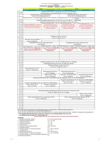 Semestr składa się z 15 tygodni zajęć (tygodnie nieparzyste i parzyste liczymy od 1 tygodnia zajęć) PLAN ZAJĘĆ ZARZĄDZANIE I INŻYNIERIA PRODUKCJI INŻYNIERSKIE Studia I stopnia stacjonarne SEMESTR VI, r.ak. 2013/2014 grupa 1 grupa 2 grupa 1 lab./proj. P 815-900 O 915-1000 grupa 2 lab./proj. grupa 3 lab./proj. grupa 4 lab./proj. Kontrola procesu wykł. tyg. nieparzyste, OZ 6, dr inż. Zb. Wiśniewski Podstawy ekonom. wykł. tyg.parzyste OZ 6, dr hab. M. Marczak, prof. PŁ I 1115-1200 Kontrola procesu ćw.tyg. nieparzyste K-4, Kontrola procesu ćw.tyg. parzyste K-4, dr hab. inż. Zb. Wiśniewski, prof. PŁ dr hab. inż. Zb. Wiśniewski, prof. PŁ Podstawy ekonom. ćw. tyg.parzyste OZ 125B, dr hab. M. Marczak, prof. Podstawy ekonom. ćw. tyg.nieparzyste OZ 125B, dr hab. M. Marczak, PŁ prof. PŁ E 1215-1300 Podstawy zarządzania jakością wykł. I poł. sem. OZ 13, prof. dr hab. inż. J. Lewandowski D 1315-1400 Z 1415-1500 I 1515-1600 A 1615-1700 Ł 1715-1800 E 1815-1900 K 1915-2000 N 1015-1100 Żywnośc funkcjonalna wykł. II poł. sem. OZ 125B, prof. dr hab. inż. B. Król Chemia przemysłowa lab.** zajęcia od 2 tyg.zajęć szczegółowe informacje nt. organizacji zajęć laboratoryjnych będą podane na pierwszym wykładzie Chemia przemysłowa lab.** zajęcia od 2 tyg.zajęć szczegółowe informacje nt. organizacji zajęć laboratoryjnych będą podane na pierwszym wykładzie Chemia przemysłowa lab.** zajęcia od 2 tyg.zajęć szczegółowe informacje nt. organizacji zajęć laboratoryjnych będą podane na pierwszym wykładzie Chemia przemysłowa lab.** zajęcia od 2 tyg.zajęć szczegółowe informacje nt. organizacji zajęć laboratoryjnych będą podane na pierwszym wykładzie 815-900 915-1000 Zarządzanie kadrami wykł. OZ 2 W 1015-1100 T 1115-1200 O 1215-1300 Zarz.prod. i usł. proj.,OZ 228 R 1315-1400 mgr inż. K.Rybińska E 1415-1500 K 1515-1600 1615-1700 1715-1800 1815-1900 1915-2000 dr hab. E. Jędrych, prof. PŁ Przedsiębiorczość ćw.tyg. nieparzyste OZ 126, Przedsiębiorczość ćw.tyg. parzyste OZ 126, dr B. Mazurek dr B. Mazurek Żywność funkcj. lab.* w godz. 16.15- Żywność funkcj. lab.* w godz. 16.15- Żywność funkcj. lab.* w godz. 16.15Żywność funkcj. lab.* w godz. 16.1517.45 i 18.00-20.15 (3x 5 godz. zajęć 17.45 i 18.00-20.15 (3x 5 godz. zajęć 17.45 i 18.00-20.15 (3x 5 godz. zajęć 17.45 i 18.00-20.15 (3x 5 godz. zajęć = = 15 godz.) II poł. sem. UWAGA! Od = 15 godz.) II poł. sem. UWAGA! Od = 15 godz.) II poł. sem. UWAGA! Od 15 godz.) II poł. sem. UWAGA! Od I I zajęć obowiązkowe I zajęć obowiązkowe I zajęć obowiązkowe zajęć obowiązkowe FARTUCHY!!!! FARTUCHY!!!! FARTUCHY!!!! FARTUCHY!!!! 815-900 915-1000 Ś 1015-1100 R 1115-1200 O 1215-1300 D 1315-1400 A 1415-1500 Chemia przemysłowa wykł. I pol sem. OZ 125B, dr hab. inż. I. Witońska 1515-1600 Przedsiębiorczość wykł. II poł. sem. OZ 125B, dr B. Mazurek 1615-1700 Zarządz. produkcją i usługami wykł. OZ 13 dr hab. inż. A. Szymonik, prof. PŁ 1715-1800 1815-1900 Komp.wspom.prod. lab. K-4 1915-2000 mgr inż. P. Wolankiewicz 815-900 Komp.wspom.prod. lab. K-1 C 915-1000 dr inż. M. Bielecki Komp.wspom.prod. lab. K-5 dr inż. K. Boczkowska Z 1015-1100 Dokum. inż.proj. OZ 25 Zarz.prod. i usł. proj.,OZ 124A W 1115-1200 A 1215-1300 R 1315-1400 T 1415-1500 E 1515-1600 K 1615-1700 Dokum. inż.proj. OZ 13 Zarz.prod. i usł. proj.,OZ 3 1715-1800 mgr inż. K. Kozieł dr inż. H. Ziółkowski Komp.wspom.prod. lab. K-5 dr inż. D. Piotrowska dr inż. I. Jałmużna dr inż. K. Boczkowska Ergonomia przemysłowa wykł. dla wszystkich grup, tyg. nieparzyste, OZ 13, dr inż. A.Polak-Sopińska Erg. przem. tyg. parzyste ćw. dla 1 gr. OZ 25,dr inż. A.Polak-Sopińska Erg. przem. tyg. parzyste ćw. dla 1 gr. OZ 25,dr inż. A.Polak-Sopińska Dokum. inż.proj. OZ 13 Zarz.prod. i usł. proj.,OZ 3 mgr inż. K. Kozieł dr inż. H. Ziółkowski 1815-1900 1915-2000 815-900 Kierowanie zespołami produkcyjnymi wykł. w I poł. sem. OZ 1, w II poł. sem. OZ 2 915-1000 dr hab. E. Jędrych, prof. PŁ, dr J. Lendzion P 1015-1100 I 1115-1200 Ą 1215-1300 T 1315-1400 E 1415-1500 K 1515-1600 Dokum. inż.proj. OZ 332 dr inż. A. Walaszczyk Podst. zarządz.jakością ćw. tyg. nieparzyste, OZ 332 dr inż. A. Walaszczyk Podst. zarządz.jakością ćw. tyg. parzyste, OZ 332 dr inż. A. Walaszczyk 1615-1700 1715-1800 1815-1900 1915-2000 OZ-1, OZ-2, OZ-3, OZ-4, OZ-6, OZ-7, OZ-39 (dawna czytenia) - Wydział OiZ ul. Piotrkowska 266 (budynek D1) K1, K2, K3, K4, K5, Wydział OiZ ul. Piotrkowska 266 (budynek D4) AULA, OZ-125A, OZ-125B, OZ-126, OZ-124A, OZ-124B,OZ-282, OZ-13, OZ-25, OZ-32a, OZ-32b, OZ-332 - LODEX ul. Wólczańska 215 (budynek B 9) * - lab. Wydziału Biotechnologii i Nauk o Żywności, wejście od ul. B. Stefanowskiego 4/10, sala s-516 ** - lab. Wydziału Chemicznego PŁ ul. Żeromskiego 116 UWAGA! PODZIAŁ NA GRUPY PROJ. BĘDZIE DOSTEPNY NA STRONIE INTERNETOWEJ WYDZIAŁU PROGRAM: 2 w., 2 proj. (4 grup proj.) Egz. 1 Zarządzanie produkcją i usługami 1 w., 1 ćw., Egz. 2 Podstawy zarządzania jakoscią 1 w., 1 ćw. 3 Podstawy ekonometrii 1 w., 1 ćw. 4 Ergonomia przemysłowa 1 w., 1 ćw. 5 Kontrola procesu 2 lab. (4 grup lab.) 6 Komputerowe wspomaganie produkcji 2 w. 7 Zarządzanie kadrami 1 w., 1 lab. (4 grup lab.) 8 Przedmiot obieralny 10: Chemia przemysłowa 1 w., 1 ćw. 9 Przedsiębiorczość 2 proj. (4 grup proj.) 10 Dokumentacja inżynierska 1 w., 1 lab. (4 grup lab.) 11 Przedmiot obieralny 11: Żywnośc funkcjonalna 12 Przedmiot obieralny 12: Kierowanie zespołami produkcyjnymi 2 w. 1 s. 13 Seminarium dyplomowe I 2014-02-21 10:44
