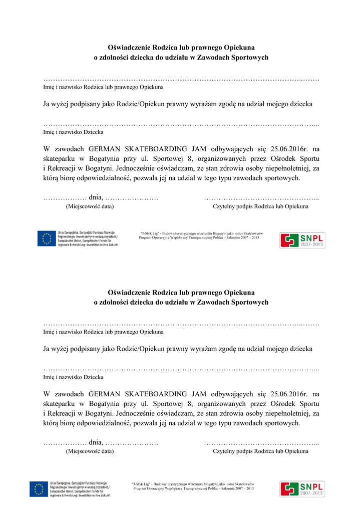 Oświadczenie Rodzica lub prawnego Opiekuna o zdolności dziecka do udziału w Zawodach Sportowych ……………………………………………………………………………………………..……. Imię i nazwisko Rodzica lub prawnego Opiekuna Ja wyżej podpisany jako Rodzic/Opiekun prawny wyrażam zgodę na udział mojego dziecka …………………………………………………………………………………………………... Imię i nazwisko Dziecka W zawodach GERMAN SKATEBOARDING JAM odbywających się 25.06.2016r. na skateparku w Bogatynia przy ul. Sportowej 8, organizowanych przez Ośrodek Sportu i Rekreacji w Bogatyni. Jednocześnie oświadczam, że stan zdrowia osoby niepełnoletniej, za którą biorę odpowiedzialność, pozwala jej na udział w tego typu zawodach sportowych. ……………… dnia, …………………. (Miejscowość data) ………………………………………... Czytelny podpis Rodzica lub Opiekuna "3-Styk Lig" - Budowa turystycznego wizerunku Bogatyni jako ostoi Skate'owców Program Operacyjny Współpracy Transgranicznej Polska – Saksonia 2007 – 2013 Oświadczenie Rodzica lub prawnego Opiekuna o zdolności dziecka do udziału w Zawodach Sportowych ……………………………………………………………………………………………..……. Imię i nazwisko Rodzica lub prawnego Opiekuna Ja wyżej podpisany jako Rodzic/Opiekun prawny wyrażam zgodę na udział mojego dziecka …………………………………………………………………………………………………... Imię i nazwisko Dziecka W zawodach GERMAN SKATEBOARDING JAM odbywających się 25.06.2016r. na skateparku w Bogatynia przy ul. Sportowej 8, organizowanych przez Ośrodek Sportu i Rekreacji w Bogatyni. Jednocześnie oświadczam, że stan zdrowia osoby niepełnoletniej, za którą biorę odpowiedzialność, pozwala jej na udział w tego typu zawodach sportowych. ……………… dnia, …………………. (Miejscowość data) ………………………………………... Czytelny podpis Rodzica lub Opiekuna "3-Styk Lig" - Budowa turystycznego wizerunku Bogatyni jako ostoi Skate'owców Program Operacyjny Współpracy Transgranicznej Polska – Saksonia 2007 – 2013