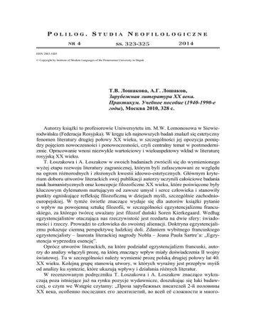 Т.В. Лошакова, А.Г. Лошаков, Зарубежная литература ХХ века... POLI LOG. STUDIA NEOFILOLOGICZNE nr 4 ss. 323-325 323 2014 ISSN 2083-5485 © Copyright by Institute of Modern Languages of the Pomeranian University in Słupsk Т.В. Лошакова, А.Г. Лошаков, Зарубежная литература ХХ века. Практикум. Учебное пособие (1940-1990-е годы), Москва 2010, 328 c. Autorzy książki to profesorowie Uniwersytetu im. M.W. Łomonosowa w Siewierodwińsku (Federacja Rosyjska). W kręgu ich najnowszych badań znalazł się estetyczny fenomen literatury drugiej połowy XX wieku, w szczególności jej opozycja pomiędzy pojęciem nowoczesności i ponowoczesności, czyli centralny temat w postmodernizmie. Opracowanie wnosi niezwykle wartościowy i wieloaspektowy wkład w literaturę rosyjską XX wieku. T. Łoszakowa i A. Łoszakow w swoich badaniach zwrócili się do wymienionego wyżej etapu rozwoju literatury zagranicznej, którym byli zafascynowani ze względu na ogrom różnorodnych i złożonych kwestii ideowo-estetycznych. Głównym kryterium doboru utworów literackich swej publikacji autorzy uczynili całościowe badania nauk humanistycznych oraz koncepcje filozoficzne XX wieku, które poświęcone były kluczowym dylematom nurtującym od zawsze umysł i serce człowieka i stanowiły punkty ogniskujące refleksję filozoficzną w dziejach myśli, szczególnie zachodnioeuropejskiej. W tymże świetle znaczące wydaje się dla autorów książki pytanie o wpływ na powojenną sztukę filozofii, w szczególności egzystencjalizmu francuskiego, za którego twórcę uważany jest filozof duński Soren Kierkegaard. Według egzystencjalistów otaczająca nas rzeczywistość jest rozdarta na dwie sfery: świadomości i rzeczy. Prowadzi to człowieka do swoistej alienacji. Doktryna egzystencjalizmu pokazuje ciemną perspektywę ludzkiej doli. Zdaniem wybitnego francuskiego egzystencjalisty – laureata literackiej nagrody Nobla – Jeana Paula Sartre’a: „Egzystencja wyprzedza esencję”. Oprócz utworów literackich, na które podziałał egzystencjalizm francuski, autorzy do analizy włączyli prozę, na którą znaczący wpływ miały doświadczenia II wojny światowej. Tu w szczególności należy wymienić prozę polską drugiej połowy lat 40. XX wieku. Kolejną grupę stanowią utwory, w których wyraźny jest przepływ myśli od analizy ku syntezie, które ukazują wpływy i działania różnych literatur. W recenzowanym podręczniku T. Łoszakowa i A. Łoszakow znacząco wykraczają poza istniejące już na rynku pozycje wydawnicze, doszukując się luki badawczej, o czym we Wstępie czytamy: „Проза зарубежных писателей 2-й половины ХХ века, особенно последних его десятилетий, во всей еë сложности и много- 324 Beata Wegnerska образии не получила достаточного освещения не только в учебной литературе, но и в исследовательских работах. Данное учебное пособие призвано хотя бы отчасти восполнить этот пробел” (s. 5). Celem nadrzędnym autorów podręcznika był taki dobór materiałów, który pozwoliłby na sformułowanie do nich systemu zagadnień i pytań dla jego odbiorców. Te z kolei zmusiłyby czytelnika do aktywnej pracy z tekstami czy ich analizy. Autorzy wyjaśniają tę kwestię w następujący sposób: „Важнейшей методической установкой данного пособия является нацеленность его материалов, системы вопросов и заданий на формирование у студентов принципов и приемов анализа и интерпретации художественного текста” (s. 5). Penetracji literatury zagranicznej dokonuje się na podstawie zróżnicowanego materiału badawczego, na który składają się nie tylko utwory z zakresu literatury pięknej, ale też teksty z pogranicza beletrystyki i publicystyki. Dzięki temu otrzymujemy do rąk opracowanie nowatorskie, ambitne, dobrze wpisujące się w kontekst badań nad literaturą zagraniczną XX wieku – jak dotąd podobnego ujęcia tematu, zasygnalizowanego w tytule książki, w Rosji brakowało. Dobrze więc, że pomysł takiego całościowego opracowania powstał i otrzymał wyraz w postaci rzetelnie opracowanego podręcznika. Książka składa się ze Wstępu, dwóch części oraz wykazu literatury. Po wprowadzeniu rozpoczyna ją obszerna, mająca charakter historycznoliteracki, część zatytułowana „Практические занятия и коллоквиумы”, która dalej dzieli się na dwanaście części-tematów. Pierwsza z nich nosi tytuł „Французский экзистенциализм” i ujmuje temat egzystencjalizmu jako zjawiska filozoficznego i literackiego, uwidocznionego w szczególności w literaturze europejskiej, która postawiona przed koniecznością opisania zjawisk, jakich dotąd historia ludzkości nie znała, odwoływała się do tegoż nurtu. Autorzy oprócz wyjaśnienia istoty pojęcia egzystencjalizmu odwołują się do poglądów najwybitniejszego z jego przedstawicieli, Jeana Paula Sartre’a, który uważał, iż istnienie wyprzedza istotę, i sprawuje nad nią zwierzchnictwo. To zdanie wyraża ideę, według której jesteśmy w świecie jako rzecz i świadomość. Musimy stale „się” wybierać, zaprzeczając temu, czym jesteśmy, przenosząc to w przyszłość i wybierając siebie w przyszłości inaczej. Świadomie wybieramy siebie od nowa jako byt, który widzi, czym był i kieruje się ku bytowi, którym jeszcze nie jest. Autorzy zwracają uwagę czytelnika nie tylko na utwory Sartre’a, ale t