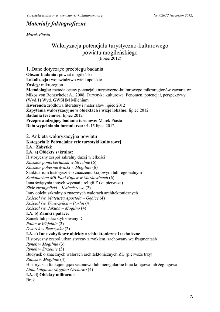 Turystyka Kulturowa, www.turystykakulturowa.org Nr 9/2012 (wrzesień 2012) Materiały faktograficzne Marek Piasta Waloryzacja potencjału turystyczno-kulturowego powiatu mogileńskiego (lipiec 2012) 1. Dane dotyczące przebiegu badania Obszar badania: powiat mogileński Lokalizacja: województwo wielkopolskie Zasięg: mikroregion Metodologia: metoda oceny potencjału turystyczno-kulturowego mikroregionów zawarta w: Mikos von Rohrscheidt A., 2008, Turystyka kulturowa. Fenomen, potencjał, perspektywy (Wyd.1) Wyd. GWSHM Milenium. Kwerenda źródłowa literatury i materiałów lipiec 2012 Zapytania waloryzacyjne w obiektach i wizje lokalne: lipiec 2012 Badania terenowe: lipiec 2012 Przeprowadzający badania terenowe: Marek Piasta Data wypełniania formularza: 01-15 lipca 2012 2. Ankieta waloryzacyjna powiatu Kategoria I: Potencjalne cele turystyki kulturowej I.A.: Zabytki: I.A. a) Obiekty sakralne: Historyczny zespół sakralny dużej wielkości Klasztor ponorbertański w Strzelnie (6) Klasztor pobernardyński w Mogilnie (6) Sanktuarium historyczne o znaczeniu krajowym lub regionalnym Sanktuarium MB Pani Kujaw w Markowicach (6) Inna świątynia innych wyznań i religii Z (za pierwszą) Zbór ewangelicki – Kwieciszewo (2) Inny obiekt sakralny o znacznych walorach architektonicznych Kościół św. Mateusza Apostoła – Gębice (4) Kościół św. Wawrzyńca – Parlin (4) Kościół św. Jakuba – Mogilno (4) I.A. b) Zamki i pałace: Zamek lub pałac stylizowany D Pałac w Wójcinie (2) Dworek w Rzeszynku (2) I.A. c) Inne zabytkowe obiekty architektoniczne i techniczne Historyczny zespół urbanistyczny z rynkiem, zachowany we fragmentach Rynek w Mogilnie (3) Rynek w Strzelnie (3) Budynek o znacznych walorach architektonicznych ZD (pierwsze trzy) Ratusz w Mogilnie (4) Historyczna funkcjonująca sezonowo lub nieregularnie linia kolejowa lub żeglugowa Linia kolejowa Mogilno-Orchowo (4) I.A. d) Obiekty militarne: Brak 71 Turystyka Kulturowa, www.turystykakulturowa.org Nr 9/2012 (wrzesień 2012) Dodatkowe punkty za wszystkie obiekty powyżej wpisanych klas: Za stałych przewodników obiektowych w j. polskim po 2 pkt (za pierwsze pięć), Zespół ponorbertański w Strzelnie (2) Klasztor pobernardyński w Mogilnie (2) Własny materiał informacyjny w obiekcie (publikacje monograficzne, albumy) (pierwsze trzy) Zespół ponorbertański w Strzelnie (1) Klasztor pobernardyński w Mogilnie (1) Sanktuarium MB Pani Kujaw w Markowicach (1) Dobry stan konserwacji obiektów (1). I.B.: Miejsca historyczne lub znaczące I.B. a) Budowle historyczne i monumenty Monumenty (pomniki) o znaczeniu krajowym (do trzech) Pomnik ks. Piotra Wawrzyniaka (6) Monumenty (pomniki) o znaczeniu regionalnym (do trzech) Pomnik ofiar II wojny światowej – Mogilno (2) Pomnik-grób powstańców wielkopolskich – Mogilno (2) Miejsca związane z biografią osób o międzynarodowym znaczeniu (pierwsze trzy) Strzelno – miejsce urodzenia Alberta Abrahama Michelsona, laureata nagrody Nobla (3) Miejsca związane z biografią osób o krajowym znaczeniu ZD Kościół św. Jakuba w Mogilnie (ks. Wawrzyniak) (2) Dworek w Słaboszewku (m.in. Witold Gombrowicz) (2) Miejsca związane z biografią osób o regionalnym znaczeniu Strzelno – (arcybiskup Stanisław Gądecki) (1) I.B. b) Cmentarze historyczne Inny cmentarz zabytkowy z ciekawymi obiektami sztuki sepulkralnej ZD Cmentarz miejski w Mogilnie (1) I.C. c) Budowle współczesne Brak I.D. d) Pojedyncze dzieła sztuki: Pojedyncze obiekty sztuki o znaczeniu międzynarodowym Kolumny przywar i cnót – Strzelno (10) Pojedyncze obiekty sztuki o znaczeniu krajowym (do trzech) Tympanony romańskie – Strzelno (5) Pojedyncze obiekty sztuki o znaczeniu regionalnym Figura MB Pani Kujaw – Markowice (3) I.E. Muzea i wystawy (w tym skanseny, galerie, muzea techniki) Muzea o znaczeniu regionalnym Muzeum Romański Ośrodek Kultury Ottona i Bolesława – Strzelno (5) Muzea o znaczeniu lokalnym Muzeum Ziemi Mogileńskiej – Chabsko (2) Zorganizowane w ostatnim roku wystawy czasowe o zasięgu regionalnym Wystawa „Ora et Labora”- Dziedzictwo Św. Benedykta – Chabsko (2) Lokalne izby pamięci, ogólnodostępne wystawy pamiątek Gminna Izba Pamięci w Kuśnierzu (1) Przewodnicy obiektowi na wcześniejsze zamówienie (do trzech placówek) Muzeum Romański Ośrodek Kultury Ottona i Bolesława – Strzelno (1) Muzeum Ziemi Mogileńskiej – Chabsko (1) Własny materiał informacyjny wydany nie dawniej niż 5 lat Muzeum Ziemi Mogileńskiej – Chabsko (1) Sklep muzealny otwarty w godzinach pracy muzeum 72 Turystyka Kulturowa, www.turystykakulturowa.org Nr 9/2012 (wrzesień 2012) Muzeum Romański Ośrodek Kultury Ottona i Bolesława – Strzelno (1) Muzeum Ziemi Mogileńskiej – Chabsko (1) Stałe godziny otwarcia (muzea regionalne i lokalne) Muzeum Romański Ośrodek Kultury Ottona i Bolesława – Strzelno (1) Muzeum Ziemi Mogileńskiej – Chabsko (1) Pojedyncze eksponaty o znaczeniu krajowym Tympanony fundacyjne romańskie – Strzelno (1) I.F. Eventy kulturowe: Regularne eventy kultury masowej o znaczeniu regionalnym Dni Mogilna (4) Dni Norbertańskie (4) Dni Benedyktyńskie (4) I.G. Funkcjonujące zakłady przemysłowe: Brak I.H. Kulturowo znacząca oferta przyrodnicza: Rezerwat przyrody na terenie regionu Rezerwat „Czapliniec” (1) Rezerwat „Mierucinek” (1) Duży park miejski kultywowany (pow. 4 ha) z obiektami sztuki Park miejski – Mogilno (2) I.I. Szlaki Kulturowe: Przebiegające przez region lub jego miejscowości materialne szlaki turystyczne o znaczeniu międzynarodowym Droga św. Jakuba (8) Przebiegające przez region lub jego miejscowości materialne szlaki o znaczeniu krajowym Szlak Piastowski (6) Szlak Romański (6) Przebiegające przez region materialne szlaki turystyczne o znaczeniu regionalnym Szlak św. Wojciecha (3) Szlak Jerzego W. Szulczewskiego (3) Kategoria II: Elementy obsługi turystycznej: II.A. Informacja turystyczna: Brak II.B. Infrastruktura turystyczna: