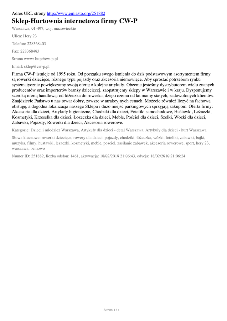 Adres URL strony http://www.emiasto.org/251882 Sklep-Hurtownia internetowa firmy CW-P Warszawa, 01-497, woj. mazowieckie Ulica: Hery 23 Telefon: 228368403 Fax: 228368403 Strona www: http://cw-p.pl Email: [email protected] Firma CW-P istnieje od 1995 roku. Od początku swego istnienia do dziś podstawowym asortymentem firmy są rowerki dziecięce, różnego typu pojazdy oraz akcesoria niemowlęce. Aby sprostać potrzebom rynku systematycznie powiększamy swoją ofertę o kolejne artykuły. Obecnie jesteśmy dystrybutorem wielu znanych producentów oraz importerów branży dziecięcej, zaopatrujemy sklepy w Warszawie i w kraju. Dysponujemy szeroką ofertą handlową: od łóżeczka do rowerka, dzięki czemu od lat mamy stałych, zadowolonych klientów. Znajdziecie Państwo u nas towar dobry, zawsze w atrakcyjnych cenach. Możecie również liczyć na fachową obsługę, a dogodna lokalizacja naszego Sklepu i dużo miejsc parkingowych sprzyjają zakupom. Oferta firmy: Akcesoria dla dzieci, Artykuły higieniczne, Chodziki dla dzieci, Foteliki samochodowe, Huśtawki, Leżaczki, Kosmetyki, Krzesełka dla dzieci, Łóżeczka dla dzieci, Meble, Pościel dla dzieci, Szelki, Wózki dla dzieci, Zabawki, Pojazdy, Rowerki dla dzieci, Akcesoria rowerowe. Kategorie: Dzieci i młodzież Warszawa, Artykuły dla dzieci - detal Warszawa, Artykuły dla dzieci - hurt Warszawa Słowa kluczowe: rowerki dziecięce, rowery dla dzieci, pojazdy, chodziki, łóżeczka, wózki, foteliki, zabawki, bajki, muzyka, filmy, huśtawki, leżaczki, kosmetyki, meble, pościel, zasilanie zabawek, akcesoria rowerowe, sport, hery 23, warszawa, bemowo Numer ID: 251882, liczba odsłon: 1461, aktywacja: 18/02/2010 21:06:43, edycja: 18/02/2010 21:06:24 Strona 1 / 1