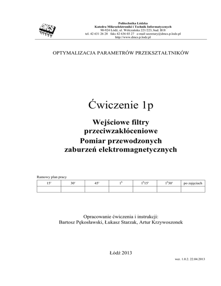 Politechnika Łódzka Katedra Mikroelektroniki i Technik Informatycznych 90-924 Łódź, ul. Wólczańska 221/223, bud. B18 tel. 42 631 26 28 faks 42 636 03 27 e-mail [email protected] http://www.dmcs.p.lodz.pl OPTYMALIZACJA PARAMETRÓW PRZEKSZTAŁTNIKÓW Ćwiczenie 1p Wejściowe filtry przeciwzakłóceniowe Pomiar przewodzonych zaburzeń elektromagnetycznych Ramowy plan pracy 15′ 30′ 45′ 1h 1h15′ 1h30′ po zajęciach Opracowanie ćwiczenia i instrukcji: Bartosz Pękosławski, Łukasz Starzak, Artur Krzywoszonek Łódź 2013 wer. 1.0.2. 22.04.2013 Spis treści B Wprowadzenie do ćwiczenia..............................................................................................................5 1. Cel i przebieg ćwiczenia....................................................................................................................5 2. Podstawy teoretyczne [1]...................................................................................................................7 2.1. Wprowadzenie .........................................................................................................................7 2.2. Zaburzenia elektromagnetyczne ..............................................................................................7 2.2.a. Zaburzenia przewodzone........................................................................................8 2.2.b. Poziomy zaburzeń elektromagnetycznych .............................................................9 2.2.c. Tłumienie zaburzeń elektromagnetycznych .........................................................11 C Doświadczenie...................................................................................................................................13 3. Pomiary............................................................................................................................................13 3.1. Układ pomiarowy ..................................................................................................................13 3.2. Wykonanie pomiarów............................................................................................................14 D Wyniki ...............................................................................................................................................15 4. Opracowanie i analiza wyników......................................................................................................15 E Informacje.........................................................................................................................................17 5. Literatura .........................................................................................................................................17 © 2013 Katedra Mikroelektroniki i Technik Informatycznych Politechniki Łódzkiej B Wprowadzenie do ćwiczenia 1. Cel i przebieg ćwiczenia Celem ćwiczenia jest poznanie zasady pomiaru przewodzonych zakłóceń elektromagnetycznych oraz metod redukcji ich poziomu za pomocą filtrów przeciwzakłóceniowych. Ćwiczenie bazuje na układzie aktywnego korektora współczynnika mocy jako przykładowym przekształtniku. © 2013 Katedra Mikroelektroniki i Technik Informatycznych Politechniki Łódzkiej 2. Podstawy teoretyczne [1] 2.1. Wprowadzenie Obserwowany w ostatnich latach postęp w technologii przyrządów półprzewodnikowych mocy pozwolił na wprowadzenie zaawansowanych układów przekształtnikowych, opartych między innymi na tranzystorach MOSFET i IGBT. Układy te, pracujące z częstotliwościami komutacyjnymi wielokrotnie większymi od częstotliwości źródła zasilania (f = 50 Hz), poprawiają właściwości dynamiczne i sprawność działania. Jednak częstotliwość przełączania, a także wyższe częstotliwości związane z dużymi stromościami prądowymi i napięciowymi, stały się przyczyną pojawienia się w tych układach zaburzeń elektromagnetycznych. Są one niekorzystne zarówno dla samego źródła zasilania, jak i dla innych urządzeń do niego przyłączonych. 2.2. Zaburzenia elektromagnetyczne Sygnały elektromagnetyczne powstają wszędzie tam, gdzie urządzenie jest zasilane energią elektryczną. Sygnałem niepożądanym nazywa się każdy sygnał elektryczny występujący w układzie, inny niż użyteczny. Zaburzenia natomiast stanowią te sygnały niepożądane, które są przyczyną nieprawidłowej pracy danego układu, urządzenia czy systemu elektronicznego. Sygnały niepożądane występują równocześnie z sygnałem użytecznym i nie można ich w pełni wyeliminować, a jedynie można obniżyć ich poziom, aby nie powodowały zakłóceń. Przyczyną występowania zaburzeń mogą być naturalne zjawiska występujące w przyrodzie (zakłócenia atmosferyczne, szumy własne elementów), jak i efekty spowodowane działalnością człowieka (tzw. zaburzenia przemysłowe). Źródła zaburzeń są wszechobecne bez względu na środowisko. Ich rodzaj i intensywność zależy od wielu czynników. Zaburzenia można podzielić według różnych kryteriów, między innymi ze względu na: - zakres częstotliwości: o o - - zaburzenia małej częstotliwości (m.cz. do ok. 1 MHz) zaburzenia wielkiej częstotliwości (w.cz. powyżej 1 MHz) czas trwania: o zaburzenia trwałe lub podtrzymywane o zaburzenia przejściowe (chwilowe) sposób przenikania (klasyczny podział rodzajów sprzężeń): o przez przewodzenie o przez indukcję © 2013 Katedra Mikroelektroniki i Technik Informatycznych Politechniki Łódzkiej o przez promieniowanie Mechanizm przenikania zaburzeń elektromagnetycznych do obwodów układu elektronicznego nazywa się sprzężeniem. Można dokonać bardziej precyzyjnego podziału sprzężeń elektromagnetycznych: - sprzężenie przez wspólną impedancję - sprzężenie pojemnościowe płytki układu elektronicznego z obudową - sprzężenie przez przesłuch indukcyjny - sprzężenie przez przesłuch pojemnościo