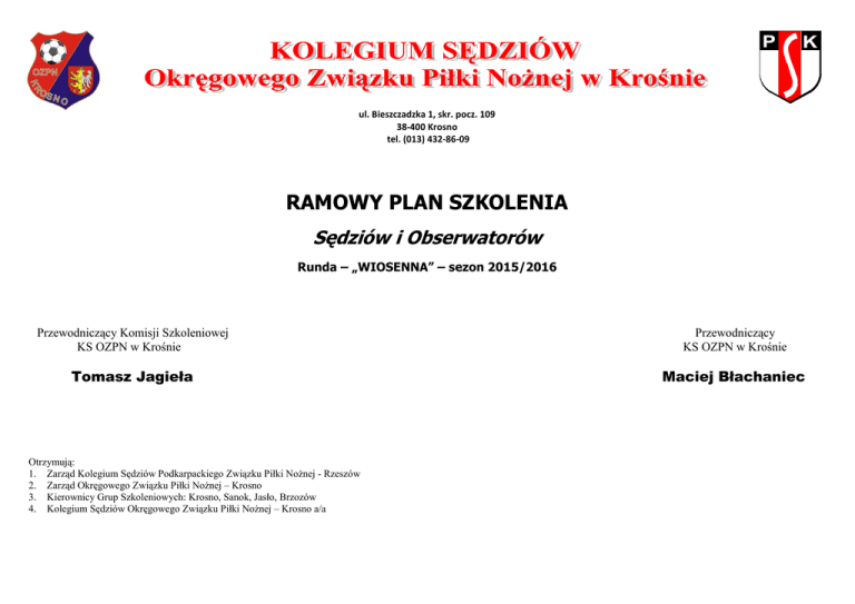 ul. Bieszczadzka 1, skr. pocz. 109 38-400 Krosno tel. (013) 432-86-09 RAMOWY PLAN SZKOLENIA Sędziów i Obserwatorów Runda – „WIOSENNA” – sezon 2015/2016 Przewodniczący Komisji Szkoleniowej KS OZPN w Krośnie Przewodniczący KS OZPN w Krośnie Tomasz Jagieła Maciej Błachaniec Otrzymują: 1. Zarząd Kolegium Sędziów Podkarpackiego Związku Piłki Nożnej - Rzeszów 2. Zarząd Okręgowego Związku Piłki Nożnej – Krosno 3. Kierownicy Grup Szkoleniowych: Krosno, Sanok, Jasło, Brzozów 4. Kolegium Sędziów Okręgowego Związku Piłki Nożnej – Krosno a/a Tematy Ramowego Planu Szkolenia Sędziów i Obserwatorów– runda wiosenna sezonu 2015/2016 Termin spotkań częstotliwość Rodzaj zajęć Styczeń kondycyjny, minimum 2, 3 razy w tygodniu ćwiczenia Trening praktyczne Tematyka • kondycyjne do rundy wiosennej sezonu 2015/2016. • Odpowiedzialni za realizację Teren działalności KS Krosno Indywidualnie sędziowie Uwagi wszystkich klas rozgrywkowych Prowadzenie zawodów tj.: sparingi, turnieje w ramach ćwiczeń praktycznych. - TEMAT GŁÓWNY SZKOLENIA: Luty minimum 1 szkolenie w miesiącu w Grupach Szkoleniowych Indywidualne przygotowanie sprawnościowo – Miejsce spotkania Szkolenie teoretycznoaudiowizualne • Przedstawienie najnowszych wytycznych oraz zmian w Przepisach Gry. • Krosno Kierownik Sanok Grupy Szkoleniowej Jasło PROWADZĄCY: ŚNIEŻEK L. (GRUPA KROSNO) DENEGA R. (GRUPA SANOK) Brzozów ALEKSANDER D. (GRUPA JASŁO) DOBOSZ K. (GRUPA BRZOZÓW) Przypomnienie istotnych zapisów w Regulaminie Rozgrywek. - TEMAT GŁÓWNY SZKOLENIA: Szkolenie teoretyczno- Marzec minimum 2 szkolenia w miesiącu w Grupach Szkoleniowych • Użycie ciała w walce o piłkę – kryteria oceny. audiowizualne audiowizualne Kierownik Prowadzącego Sanok Grupy Szkoleniowej wyznacza Jasło Kierownik Grupy Szkoleniowej Brzozów - TEMAT GŁÓWNY SZKOLENIA: Szkolenie teoretyczno- Krosno • „Ręka” – kryteria oceny, praktyczne wskazówki. Krosno Kierownik Prowadzącego Sanok Grupy Szkoleniowej wyznacza Jasło Brzozów Kierownik Grupy Szkoleniowej - TEMAT GŁÓWNY SZKOLENIA: Szkolenie Kwiecień minimum 1 szkolenie w miesiącu w Grupach Szkoleniowych + egzaminy teoretyczno- • audiowizualne Niedozwolone użycie rąk w walce o piłkę – kiedy faul? kiedy kartka? - EGZAMINY KONKURSOWE Egzaminy Krosno Kierownik Sanok Grupy Szkoleniowej wyznacza Brzozów Kierownik Grupy Szkoleniowej Krosno Zarząd KS, Komisja Szkoleniowa Egzamin kondycyjny Sanok • Egzamin teoretyczny Jasło Maj teoretyczno- minimum 2 szkolenia w miesiącu w Grupach Szkoleniowych audiowizualne • SPA/DOGSO – aktualne interpretacje. • KANDYDACI DO KLASY • SĘDZIOWIE KLASY A, B, C Krosno Kierownik Prowadzącego Sanok Grupy Szkoleniowej wyznacza Jasło Kierownik Grupy Szkoleniowej Brzozów Szkolenie - TEMAT GŁÓWNY SZKOLENIA: teoretycznoaudiowizualne UCZESTNICY: OKRĘGOWEJ Brzozów - TEMAT GŁÓWNY SZKOLENIA: Prowadzącego Jasło • Szkolenie PROWADZĄCY: • Według zapotrzebowania danej Grupy Szkoleniowej. Krosno Kierownik Prowadzącego Sanok Grupy Szkoleniowej wyznacza Jasło Kierownik Grupy Szkoleniowej Brzozów Czerwiec minimum 1 szkolenie w miesiącu w Grupach Szkoleniowych Szkolenie teoretycznoaudiowizualne - TEMAT GŁÓWNY SZKOLENIA: • Ustawianie się sędziego na polu gry – teoria i praktyka. Krosno Kierownik Prowadzącego Sanok Grupy Szkoleniowej wyznacza Jasło Kierownik Grupy Szkoleniowej Brzozów UWAGA: 1. Szczegółowe plany pracy Grup Szkoleniowych z Krosna, Sanoka, Jasła oraz Brzozowa są integralną częścią niniejszego planu. 2. Częstotliwość zebrań szkoleniowych może być większa, lecz obowiązkowo – z pełnym stanem szkolących się sędziów – taka jak w planie szkolenia. Opracował Przewodniczący Komisji Szkoleniowej KS OZPN w Krośnie Tomasz Jagieła Przewodniczący KS OZPN w Krośnie Maciej Błachaniec