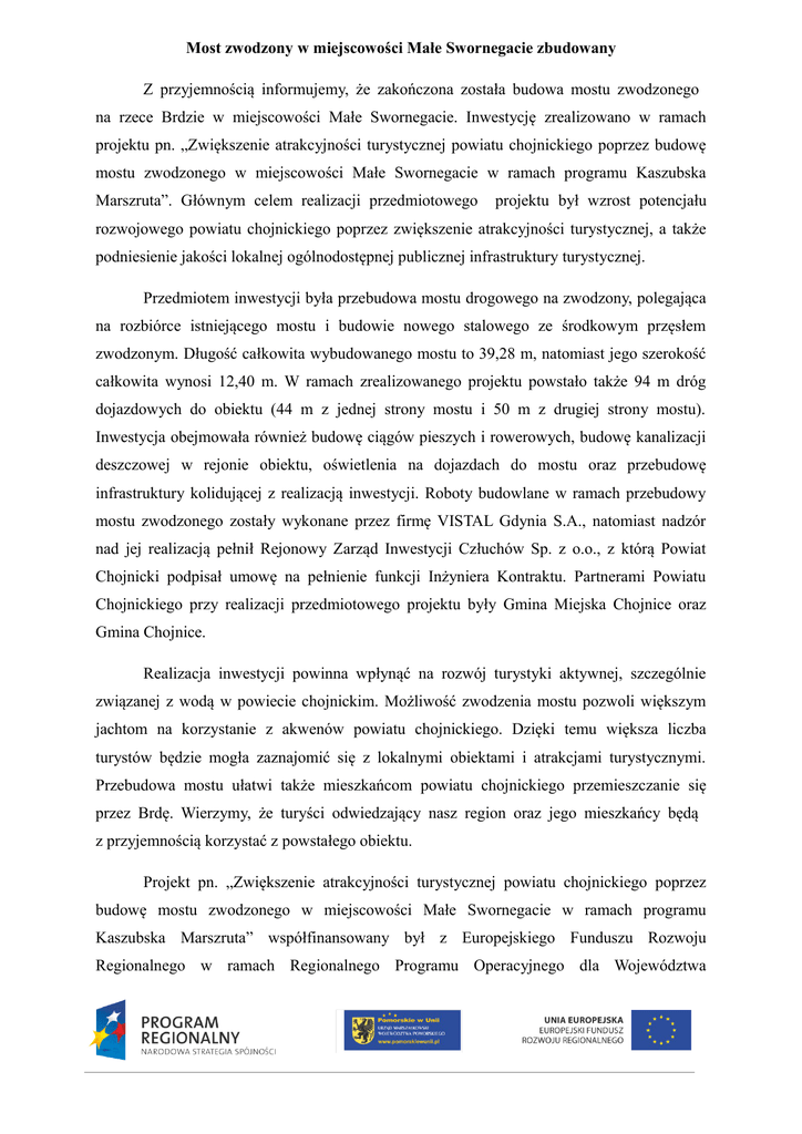Most zwodzony w miejscowości Małe Swornegacie zbudowany Z przyjemnością informujemy, że zakończona została budowa mostu zwodzonego na rzece Brdzie w miejscowości Małe Swornegacie. Inwestycję zrealizowano w ramach projektu pn. „Zwiększenie atrakcyjności turystycznej powiatu chojnickiego poprzez budowę mostu zwodzonego w miejscowości Małe Swornegacie w ramach programu Kaszubska Marszruta”. Głównym celem realizacji przedmiotowego projektu był wzrost potencjału rozwojowego powiatu chojnickiego poprzez zwiększenie atrakcyjności turystycznej, a także podniesienie jakości lokalnej ogólnodostępnej publicznej infrastruktury turystycznej. Przedmiotem inwestycji była przebudowa mostu drogowego na zwodzony, polegająca na rozbiórce istniejącego mostu i budowie nowego stalowego ze środkowym przęsłem zwodzonym. Długość całkowita wybudowanego mostu to 39,28 m, natomiast jego szerokość całkowita wynosi 12,40 m. W ramach zrealizowanego projektu powstało także 94 m dróg dojazdowych do obiektu (44 m z jednej strony mostu i 50 m z drugiej strony mostu). Inwestycja obejmowała również budowę ciągów pieszych i rowerowych, budowę kanalizacji deszczowej w rejonie obiektu, oświetlenia na dojazdach do mostu oraz przebudowę infrastruktury kolidującej z realizacją inwestycji. Roboty budowlane w ramach przebudowy mostu zwodzonego zostały wykonane przez firmę VISTAL Gdynia S.A., natomiast nadzór nad jej realizacją pełnił Rejonowy Zarząd Inwestycji Człuchów Sp. z o.o., z którą Powiat Chojnicki podpisał umowę na pełnienie funkcji Inżyniera Kontraktu. Partnerami Powiatu Chojnickiego przy realizacji przedmiotowego projektu były Gmina Miejska Chojnice oraz Gmina Chojnice. Realizacja inwestycji powinna wpłynąć na rozwój turystyki aktywnej, szczególnie związanej z wodą w powiecie chojnickim. Możliwość zwodzenia mostu pozwoli większym jachtom na korzystanie z akwenów powiatu chojnickiego. Dzięki temu większa liczba turystów będzie mogła zaznajomić się z lokalnymi obiektami i atrakcjami turystycznymi. Przebudowa mostu ułatwi także mieszkańcom powiatu chojnickiego przemieszczanie się przez Brdę. Wierzymy, że turyści odwiedzający nasz region oraz jego mieszkańcy będą z przyjemnością korzystać z powstałego obiektu. Projekt pn. „Zwiększenie atrakcyjności turystycznej powiatu chojnickiego poprzez budowę mostu zwodzonego w miejscowości Małe Swornegacie w ramach programu Kaszubska Marszruta” współfinansowany był z Europejskiego Funduszu Rozwoju Regionalnego w ramach Regionalnego Programu Operacyjnego dla Województwa Pomorskiego na lata 2007 – 2013, Oś priorytetowa 8. Lokalna infrastruktura podstawowa, Działanie 8.1. Lokalny potencjał rozwojowy, Poddziałanie 8.1.2. Lokalna infrastruktura wspierająca rozwój gospodarczy. Całkowita wartość projektu 5 115 162,62 PLN Poziom współfinansowania Projektu ze środków EFRR 85 % Dofinansowanie ze środków EFRR 4 050 831,60 PLN ……………………. Stanisław Skaja – starosta Chojnicki Z radością mogę zakomunikować, że budowa mostu w miejscowości Małe Swornegacie dobiegła końca. Zadanie inwestycyjne nie przebiegało bezproblemowo, jednakże mimo przeszkód udało się nam je sfinalizować. Realizacja projektu pozwoli większym jachtom na swobodne przepływanie między akwenami. Jestem pewien, że most posłuży przez wiele lat, przyczyniając się do wzrostu potencjału turystycznego naszego powiatu. Należy podkreślić, że działanie to jest przykładem współpracy lokalnych samorządów co stanowi nieocenioną wartość i dobrze rokuje w przyszłej perspektywie finansowej Unii Europejskiej. ……………………………. Marek Szczepański – członek zarządu powiatu chojnickiego Cieszę się z faktu zrealizowania tak długo oczekiwanej inwestycji. Czas od pomysłu do jego realizacji znacznie się wydłużył, co pokazuje jak trudnym zadaniem jest pozyskiwanie środków unijnych na zadanie, a potem zrealizowanie skomplikowanego procesu inwestycyjnego. Powiat sukcesywnie inwestuje w turystykę, a budowa mostu zwodzonego to jeden z elementów rozwoju turystyki powiatu chojnickiego w ramach budowy i oznakowania 157 km ścieżek rowerowych „Kaszubska Marszruta”. Warunkiem skutecznego inwestowania w branżę gospodarki jaką jest turystyka jest budowanie szerokiego partnerstwa, tak było i w tym projekcie. Chciałbym serdecznie podziękować partnerom projektu i liczyć na dalszą współpracę, a w sposób szczególny dziękuję pracownikom Starostwa zaangażowanym w realizację tego zadania. Mam nadzieję, że most służyć będzie wszystkim i zgodnie z symboliką mostu będzie łączył, tak jak w tym projekcie połączył jeziora oraz Powiat z miastem i gminą Chojnice. ………………………… Arseniusz Finster - burmistrz miasta Chojnice Wspólna determinacja Powiatu Chojnickiego, Gminy Chojnice oraz Miasta Chojnice doprowadziła do tego, iż już w nowym sezonie letnim turyści, a przede wszystkim żeglarze pragnący wypocząć na naszej pięknej ziemi chojnickiej, cieszyć się będą z funkcjonowania nowego mostu zwodzonego. Inwestycja, zrealizowana z pełnym poszanowaniem wymogów ochrony środowiska, doprowadzi do zlikwidowania poważnej bariery dla ruchu po szlaku wodnym rzeki Brdy. Nowy obiekt stanowi równocześnie kontynuację długofalowej polityki samorządów powiatowego i gminnych, zmierzającej do zwiększenia atrakcyjności turystycznej naszej ziemi, poprzez realizację kolejnych zadań inwestycyjnych. ………………………………. Zbigniew Szczepański – wójt gminy Chojnice Jestem przekonany, że zrealizowana inwestycja przyczyni się do wzrostu atrakcyjności turystycznej naszego regionu oraz zwiększy zainteresowanie pobytem w tak urokliwym zakątku naszego kraju. Cieszy mnie zakończenie kolejnego etapu działań mających na celu utworzenie spójnej sieci obiektów turystycznych wywierających wp