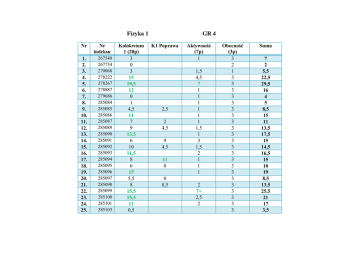Fizyka 1 Nr 1. 2. 3. 4. 5. 6. 7. 8. 9. 10. 11. 12. 13. 14. 15. 16. 17. 18. 19. 20. 21. 22. 23. 24. 25. Nr indeksu 267540 267734 270068 278222 278267 278887 279686 285084 285085 285086 285087 285089 285090 285091 285092 285093 285094 285095 285096 285097 285098 285099 285100 285101 285103 Kolokwium 1 (20p) 3 0 3 15 19,5 12 0 1 4,5 11 7 9 13,5 6 10 11,5 8 6 15 5,5 8 15,5 15,5 12 0,5 GR 4 K1 Poprawa 2,5 2 4,5 9 4,5 11 0 0 8,5 Aktywność (7p) 1 1,5 4,5 7 1 1 1 1 1 1 1,5 1 3 1,5 2 1 1 1 2 7+ 2,5 2 Obecność (3p) 3 2 1 3 3 3 3 3 3 3 3 3 3 3 3 3 3 3 3 3 3 3 3 3 3 Suma 7 2 5,5 22,5 29,5 16 4 5 8,5 15 11 13,5 17,5 15 14,5 16,5 15 10 19 8,5 13,5 25,5 21 17 3,5