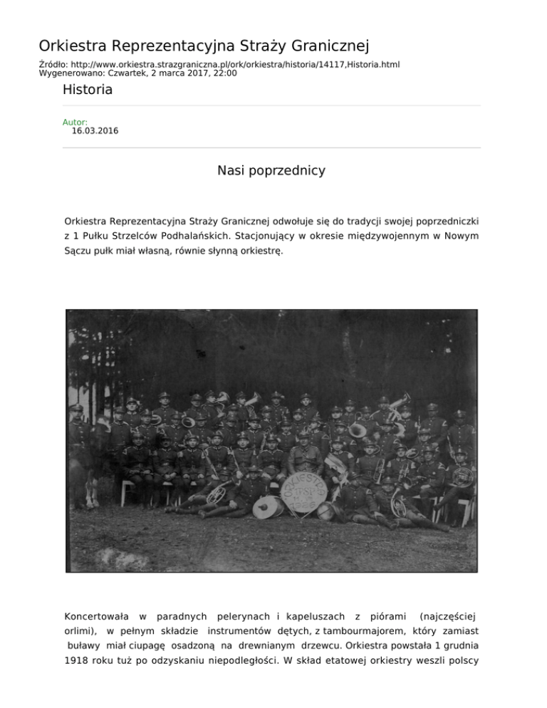 Orkiestra Reprezentacyjna Straży Granicznej Źródło: http://www.orkiestra.strazgraniczna.pl/ork/orkiestra/historia/14117,Historia.html Wygenerowano: Czwartek, 2 marca 2017, 22:00 Historia Autor: 16.03.2016 Nasi poprzednicy Orkiestra Reprezentacyjna Straży Granicznej odwołuje się do tradycji swojej poprzedniczki z 1 Pułku Strzelców Podhalańskich. Stacjonujący w okresie międzywojennym w Nowym Sączu pułk miał własną, równie słynną orkiestrę. Koncertowała w paradnych pelerynach i kapeluszach z piórami (najczęściej orlimi), w pełnym składzie instrumentów dętych, z tambourmajorem, który zamiast buławy miał ciupagę osadzoną na drewnianym drzewcu. Orkiestra powstała 1 grudnia 1918 roku tuż po odzyskaniu niepodległości. W skład etatowej orkiestry weszli polscy muzycy z orkiestry austriackiego 32 Pułku Obrony Krajowej "Neu Sandez" , której dyrygentem był Józef Ciasny i z 20 Pułku Piechoty. Początkowo tworzyło ją 21 muzyków. W 1927 r. było ich 23, w 1934r. - 56, a w 1939r. - 59. Orkiestra była chlubą pułku. Trudno było sobie wyobrazić jakąkolwiek uroczystość, paradą bez jej udziału. Z orkiestry wyłaniały się też małe zespoły smyczkowe i estradowe, a nawet jazzowe, które grały na seansach filmowych, balach strzeleckich, wieczornicach organizacji społecznych (np."Sokoła"), zabawach i rautach. Orkiestrę zaliczano do najlepszych w Polsce, czego dowodem były liczne laury na festiwalach orkiestr wojskowych. W latach trzydziestych, w okresie letnim,z uwagi na rosnące zapotrzebowanie, dzielono ją na trzy zespoły: orkiestrę dętą dla potrzeb pułku oraz dwie symfoniczne, które koncertowały w uzdrowiskach. We wrześniu 1939r. orkiestra wyruszyła z Pułkiem na wojnę. W mieście pozostał ośrodek zapasowy 21 Dywizji. 4 września przeniesiono go do Brzeżan koło Lwowa, a 16 września rozpoczęto ewakuację w kierunku granicy z Rumunią. Kilka dni po agresji ZSRR na Polskę muzycy zniszczyli instrumenty. Część Pułku dostała się do niewoli sowieckiej, część została internowana na Węgrzech, część przemierzyła kolejne szlaki bojowe, na wschodzie i zachodzie. Wielu strzelców podhalańskich poległo podczas II wojny światowej. Pierwszy skrzypek orkiestry I PSP Józef Holstrager zginął w getcie sądeckim. W Olszanie w 1943r. Niemcy rozstrzelali byłego tambourmajora Ignacego Wolfstahla. Mogiły wielu innych, często bezimienne, rozsiane są od Syberii po Atlantyk i Afrykę. Powojenna Historia Orkiestry Reprezentacyjnej Straży Granicznej Orkiestra Reprezentacyjna Straży Granicznej swoją powojenną historię rozpoczyna 26 lipca 1956r. Jej zalążek utworzyli muzycy wojskowi, przeniesieni do Nowego Sącza po likwidacji w Przemyślu 26 Brygady Wojsk Ochrony Pogranicza. Muzyków w mundurach przyjęto w Nowym Sączu jak swoich, jakby po latach wrócili do domu muzycy 1 Pułku Strzelców Podhalańskich. Pierwszy skład orkiestry liczył 24 osoby,a kapelmistrzem został st. sierż. Henryk Litka W 1957r. obowiązki kapelmistrza objął ppor. Stanisław Latek. W czerwcu 1957r. orkiestra otrzymała nowe stroje, dzięki którym wyróżnia się do dziś spośród pozostałych formacji. Z biegiem lat orkiestra wypływała na szersze wody wchodząc na arenę życia kulturalnego pogranicza Polski południowej, a potem całego kraju. Stała się zespołem wszechstronnym o szerokich zainteresowaniach repertuarowych. Jesienią 1967r. orkiestra otrzymuje etat I kategorii. Po przeniesieniu kpt. Stanisław Latka na stanowisko dyrygenta Centralnej Orkiestry Reprezentacyjnej Wojska Polskiego stanowisko kapelmistrza obejmuje kpt. Julian Kwiatkowski. Wraz ze zmianąetatu zwiększyły się możliwości repertuarowo - wykonawcze. Pod koniec lat 60-tych orkiestra rozpoczęła swoje złote lata. Zespół wzbogacił repertuar, dał setki koncertów i już po dwóch latach został najlepszą orkiestrą w Wojskach Wewnętrznych. W 1969 roku orkiestra wykonała ponad 200 koncertów. Wiosną 1971r. batutę dyrygencką przejął mjr Jan Woszczyk. Orkiestra koncertowała w całym kraju. Występowała przed kamerami telewizji, brała udział w centralnych uroczystościach wojskowych i państwowych. Systematycznie doskonaliła swoje umiejętności. 9 sierpnia 1973r. stała się Orkiestrą Reprezentacyjną Wojsk Ochrony Pogranicza. W związku z tym w obsadzie etatowej orkiestry zostało utworzone stanowisko II kapelmistrza. W latach 70-tych orkiestra występowała średnio ok. 200 razy w roku, dając blisko 50 pełnych koncertów w całej Polsce. W ciągu roku autokar z muzykami przejeżdżał 15 tys. km. Od roku 1976 do roku 1978 funkcjęII kapelmistrza Orkiestry pełnił ppor. Andrzej Midor. W tymże roku odszedł do Kaszubskiej Brygady WOP w Gdańsku, gdzie przez 10 lat pełnił funkcję dyrygenta orkiestry. W latach 1973, 1974 i 1976 orkiestra zajmowała pierwsze miejsce w musztrze paradnej na festiwalu orkiestr wojskowych w Świeradowie Zdroju zdobywając najwyższe trofeum "Kryształową Buławę". Głównym autorem i choreografem wzbudzającej podziw musztry paradnej był ówczesny tambourmajor chor. Stefan Żuk. W czerwcu 1980r. odszedł z orkiestry ppłk Jan Woszczyk. Obowiązki kapelmistrza przejął chor. Stefan Żuk. Na festiwalu Orkiestr w Radomiu, za najlepiej wykonany program musztry paradnej, sądeczanie zdobyli pierwsze miejsce po raz piąty. 15 stycznia 1982r. stanowisko pierwszego kapelmistrza objął ppor. Bernard Król, absolwent warszawskiej Akademii Muzycznej zaś obowiązki II kapelmistrza przyjął ppor. Stefan Żuk. Wprowadzenie stanu wojennego przyniosło nietypowe dla orkiestry zadania. 13 grudnia 1981r., z rozkazu przełożonych, instrumenty muzyczne zostały komisyjnie zamknięte, a sala do ćwiczeń zaplombowana. Z czasem muzycy wrócili do swoich normalnych zajęć, prób i koncertów. I znowu sięgnęli po laury. We wrześniu 1983r. w konfrontacji z orkiestrami reprezentacyjnymi okręgów i rodzajów wojsk, na festiwalu w K