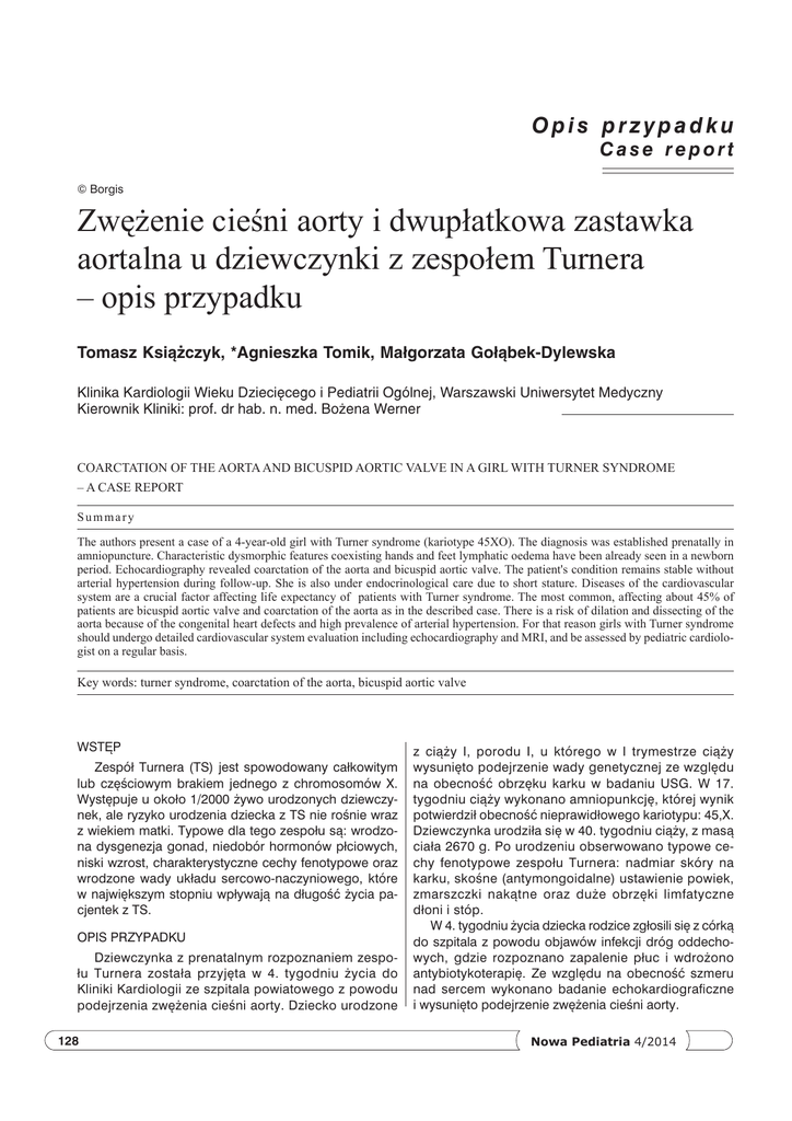 Opis przypadku Case report © Borgis Zwężenie cieśni aorty i dwupłatkowa zastawka aortalna u dziewczynki z zespołem Turnera – opis przypadku Tomasz Książczyk, *Agnieszka Tomik, Małgorzata Gołąbek-Dylewska Klinika Kardiologii Wieku Dziecięcego i Pediatrii Ogólnej, Warszawski Uniwersytet Medyczny Kierownik Kliniki: prof. dr hab. n. med. Bożena Werner Coarctation of the aorta and bicuspid aortic valve in a girl with Turner syndrome – a case report Summary The authors present a case of a 4-year-old girl with Turner syndrome (kariotype 45XO). The diagnosis was established prenatally in amniopuncture. Characteristic dysmorphic features coexisting hands and feet lymphatic oedema have been already seen in a newborn period. Echocardiography revealed coarctation of the aorta and bicuspid aortic valve. The patient's condition remains stable without arterial hypertension during follow-up. She is also under endocrinological care due to short stature. Diseases of the cardiovascular system are a crucial factor affecting life expectancy of patients with Turner syndrome. The most common, affecting about 45% of patients are bicuspid aortic valve and coarctation of the aorta as in the described case. There is a risk of dilation and dissecting of the aorta because of the congenital heart defects and high prevalence of arterial hypertension. For that reason girls with Turner syndrome should undergo detailed cardiovascular system evaluation including echocardiography and MRI, and be assessed by pediatric cardiologist on a regular basis. Key words: turner syndrome, coarctation of the aorta, bicuspid aortic valve WSTĘP Zespół Turnera (TS) jest spowodowany całkowitym lub częściowym brakiem jednego z chromosomów X. Występuje u około 1/2000 żywo urodzonych dziewczynek, ale ryzyko urodzenia dziecka z TS nie rośnie wraz z wiekiem matki. Typowe dla tego zespołu są: wrodzona dysgenezja gonad, niedobór hormonów płciowych, niski wzrost, charakterystyczne cechy fenotypowe oraz wrodzone wady układu sercowo-naczyniowego, które w największym stopniu wpływają na długość życia pacjentek z TS. OPIS PRZYPADKU Dziewczynka z prenatalnym rozpoznaniem zespołu Turnera została przyjęta w 4. tygodniu życia do Kliniki Kardiologii ze szpitala powiatowego z powodu podejrzenia zwężenia cieśni aorty. Dziecko urodzone 128 z ciąży I, porodu I, u którego w I trymestrze ciąży wysunięto podejrzenie wady genetycznej ze względu na obecność obrzęku karku w badaniu USG. W 17. tygodniu ciąży wykonano amniopunkcję, której wynik potwierdził obecność nieprawidłowego kariotypu: 45,X. Dziewczynka urodziła się w 40. tygodniu ciąży, z masą ciała 2670 g. Po urodzeniu obserwowano typowe cechy fenotypowe zespołu Turnera: nadmiar skóry na karku, skośne (antymongoidalne) ustawienie powiek, zmarszczki nakątne oraz duże obrzęki limfatyczne dłoni i stóp. W 4. tygodniu życia dziecka rodzice zgłosili się z córką do szpitala z powodu objawów infekcji dróg oddechowych, gdzie rozpoznano zapalenie płuc i wdrożono antybiotykoterapię. Ze względu na obecność szmeru nad sercem wykonano badanie echokardiograficzne i wysunięto podejrzenie zwężenia cieśni aorty. Nowa Pediatria 4/2014 Zwężenie cieśni aorty i dwupłatkowa zastawka aortalna u dziewczynki z zespołem Turnera – opis przypadku Przy przyjęciu dziewczynka była w stanie ogólnym dobrym, bez objawów niewydolności serca, w badaniu przedmiotowym zwracały uwagę znaczne obrzęki limfatyczne dłoni i stóp, nadmiar skóry na karku oraz dysmorfia twarzy. Czynność serca wynosiła 120/min, nad podstawą serca słyszalny był szmer skurczowy 2/6, promieniujący do okolicy międzyłopatkowej, tętno na tętnicach udowych obecne, ale wyraźnie słabsze niż na tętnicy ramieniowej. W pomiarach manometrycznych ciśnienia tętniczego krwi na kończynach górnych stwierdzono RR do 90/42 mm Hg, na kończynach dolnych 77/43 mm Hg, gradient ciśnienia skurczowego pomiędzy kończyną górną i dolną wynosił maksymalnie 13 mm Hg. Saturacja przezskórna wynosiła 98%. W ścisłym bilansie płynów stwierdzono właściwe dla wieku objętości przyjmowanego pokarmu oraz prawidłową diurezę. W zapisie elektrokardiograficznym (EKG) stwierdzono rytm zatokowy o częstości 130/min, bez cech przerostu jam serca. W RTG klatki piersiowej wielkość serca oraz rysunek naczyniowy płuc były prawidłowe. Badanie echokardiograficzne wykazało: dwupłatkową zastawkę aorty czynnościowo prawidłową (ryc. 1), lewostronny łuk aorty ze zwężeniem w miejscu cieśni o ok. 30% w stosunku do wymiaru łuku aorty i przyspieszeniem przepływu, z maksymalnym gradientem skurczowym 30 mm Hg (ryc. 2A i B), pulsacyjny przepływ w aorcie brzusznej. Wielkość i kurczliwość lewej komory były prawidłowe. W badaniu ultrasonograficznym (USG) jamy brzusznej nie stwierdzono nieprawidłowości. Na podstawie stanu klinicznego i wykonanych badań nie stwierdzono wskazań do interwencji kardiochirurgicznej. Dziewczynka (obecnie 4,5-letnia) pozostaje pod opieką Kliniki Kardiologii, w kolejnych badaniach nie obserwowano narastania zwężenia w miejscu cieśni aorty ani narastania gradientu skurczowego przez miejsce zwężenia. Funkcja dwupłatkowej zastawki aortalnej jest prawidłowa. Cieśnienie tętnicze w pomiarze manometrycznym pozostaje < 90 percentyla dla płci i wieku, nie stwierdza się istotnej różnicy ciśnień pomiędzy kończy- A B Ryc. 2. A – ECHO-2D. Zwężenie cieśni aorty (CoA) z postenotycznym poszerzeniem aorty zstępującej. B – turbulentny, przyspieszony przepływ przez cieśń aorty zarejestrowany techniką kolorowego Dopplera. nami górnymi i dolnymi. Aktualny wzrost to 97 cm, czyli < 3 percentyla dla płci i wieku. Rozwój psychoruchowy jest prawidłowy. Ze względu na aberrację chromosomalną dziewczynka wymaga stałej wielospecjalistycznej opieki, w tym genetycznej i endokrynologicznej. DYSKUSJA Ryc. 1. ECHO-2D. Dwupłatkowa
