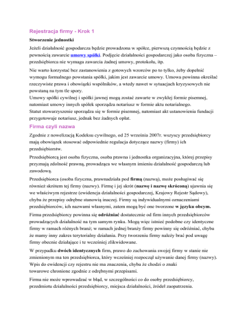 Rejestracja firmy - Krok 1 Stworzenie jednostki Jeżeli działalność gospodarcza będzie prowadzona w spółce, pierwszą czynnością będzie z pewnością zawarcie umowy spółki. Podjęcie działalności gospodarczej jako osoba fizyczna – przedsiębiorca nie wymaga zawarcia żadnej umowy, protokołu, itp. Nie warto korzystać bez zastanowienia z gotowych wzorców po to tylko, żeby dopełnić wymogu formalnego powstania spółki, jakim jest zawarcie umowy. Umowa powinna określać rzeczywiste prawa i obowiązki wspólników, a wtedy nawet w sytuacjach kryzysowych nie powstaną na tym tle spory. Umowy spółki cywilnej i spółki jawnej mogą zostać zawarte w zwykłej formie pisemnej, natomiast umowy innych spółek sporządza notariusz w formie aktu notarialnego. Statut stowarzyszenie sporządza się w formie pisemnej, natomiast akt ustanowienia fundacji przygotowuje notariusz, jednak bez żadnych opłat. Firma czyli nazwa Zgodnie z nowelizacją Kodeksu cywilnego, od 25 września 2007r. wszyscy przedsiębiorcy mają obowiązek stosować odpowiednie regulacja dotyczące nazwy (firmy) ich przedsiębiorstw. Przedsiębiorcą jest osoba fizyczna, osoba prawna i jednostka organizacyjna, której przepisy przyznają zdolność prawną, prowadząca we własnym imieniu działalność gospodarczą lub zawodową. Przedsiębiorca (osoba fizyczna, prawnadziała pod firmą (nazwą), może posługiwać się również skrótem tej firmy (nazwy). Firmę i jej skrót (nazwę i nazwę skróconą) ujawnia się we właściwym rejestrze (ewidencja działalności gospodarczej, Krajowy Rejestr Sądowy), chyba że przepisy odrębne stanowią inaczej. Firmy są indywidualnymi oznaczeniami przedsiębiorców, ich nazwami własnymi, zatem mogą być one tworzone w języku obcym. Firma przedsiębiorcy powinna się odróżniać dostatecznie od firm innych przedsiębiorców prowadzących działalność na tym samym rynku. Mogą więc istnieć podobne czy identyczne firmy w ramach różnych branż; w ramach jednej branży firmy powinny się odróżniać, chyba że mamy inny zakres terytorialny działania. Przy tworzeniu firmy należy brać pod uwagę firmy obecnie działające i te wcześniej zlikwidowane. W przypadku dwóch identycznych firm, prawo do zachowania swojej firmy w stanie nie zmienionym ma ten przedsiębiorca, który wcześniej rozpoczął używanie danej firmy (nazwy). Wpis do ewidencji czy rejestru nie ma znaczenia, chyba że chodzi o znaki towarowe chronione zgodnie z odrębnymi przepisami. Firma nie może wprowadzać w błąd, w szczególności co do osoby przedsiębiorcy, przedmiotu działalności przedsiębiorcy, miejsca działalności, źródeł zaopatrzenia. Firmą osoby fizycznej jest jej imię i nazwisko. Nie wyklucza to włączenia do firmy pseudonimu (znany lub nieznany, nawet wymyślony wyłącznie na potrzeby firmy) lub określeń wskazujących na przedmiot działalności przedsiębiorcy, miejsce jej prowadzenia oraz innych określeń dowolnie obranych. Nie wystarczy podanie nazwiska czy nazwiska z inicjałem - firmą osoby fizycznej będzie zawsze imię, nazwisko i ewentualnie dodatki. Czasem samo imię i nazwisko nie wystarczy, bowiem Janów Kowalskich jest wielu. Dodanie dodatkowego imienia jak nazwy własnej może być niedopuszczalne (np. Kowalski Jan "Tadeusz" Firma Budowlana"). Dodać je można jedynie wtedy, gdy naprawdę wyraźnie widać, iż nie jest to imię przedsiębiorcy (np. Jan Kowalski Zakład Krawiecki "Butik Krystyna"). Należy jednak zachować tu szczególną ostrożność. Firmą osoby prawnej jest jej nazwa. Firma zawiera określenie formy prawnej osoby prawnej (obowiązkowo), które może być podane w skrócie, a ponadto może (ale nie musi) wskazywać na przedmiot działalności, siedzibę tej osoby oraz inne określenia dowolnie obrane. Firma osoby prawnej może zawierać nazwisko lub pseudonim osoby fizycznej, jeżeli służy to ukazaniu związków tej osoby z powstaniem lub działalnością przedsiębiorcy. Umieszczenie w firmie nazwiska albo pseudonimu osoby fizycznej wymaga pisemnej zgody tej osoby, a w razie jej śmierci - zgody jej małżonka i dzieci. Firma oddziału osoby prawnej zawiera pełną nazwę tej osoby oraz określenie "oddział" ze wskazaniem miejscowości, w której oddział ma siedzibę. Zmiana firmy wymaga ujawnienia w rejestrze. W razie przekształcenia osoby prawnej można zachować jej dotychczasową firmę z wyjątkiem określenia wskazującego formę prawną osoby prawnej, jeżeli uległa ona zmianie. To samo dotyczy przekształcenia spółki osobowej. W przypadku utraty członkostwa przez wspólnika, którego nazwisko było umieszczone w firmie, spółka może zachować w swej firmie nazwisko byłego wspólnika tylko za wyrażoną na piśmie jego zgodą, a w razie jego śmierci - za zgodą jego małżonka i dzieci. Zasadę tą stosuje się odpowiednio w wypadku kontynuowania działalności gospodarczej osoby fizycznej przez inną osobę fizyczną będącą jej następcą prawnym. Kto nabywa przedsiębiorstwo, może je nadal prowadzić pod dotychczasową nazwą. Powinien jednak umieścić dodatek wskazujący firmę lub nazwisko nabywcy, chyba że strony postanowiły inaczej. Sama jednak firma (nazwa) nie może być zbyta. Przedsiębiorca może upoważnić innego przedsiębiorcę do korzystania ze swej firmy, jeżeli nie wprowadza to w błąd (np. przedstawiciele handlowi, agenci, systemy franszyzowe). Przedsiębiorca, którego prawo do firmy zostało zagrożone cudzym działaniem, może żądać zaniechania tego działania, chyba że nie jest ono bezprawne. W razie dokonanego naruszenia może on także żądać usunięcia jego skutków, złożenia oświadczenia lub oświadczeń w odpowiedniej treści i formie, naprawienia na zasadach ogólnych szkody majątkowej lub wydania korzyści uzyskanej przez osobę, która dopuściła się naruszenia. Zgodnie z Kodeksem spółek handlowych firma spółki: • • • • • • • jawnej pow