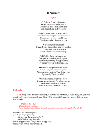 II Nieszpory Hymn O Boże w Trójcy niepojęty, Swoją potęgą wszechmogącą Stworzyłeś czas i nim kierujesz. Sam pozostając nad wiekami. Wystarczasz sobie w pełni, Boże, Masz bowiem szczęście niezmierzone; Przeczysty, prosty i troskliwy, Ziemię ogarniasz i przestworza. Wszelkiego życia źródło, Ojcze, Synu, Ojcowskiej chwały blasku, I Ty, co jesteś Obu tchnieniem, Duchu miłości nieskończonej. Od Ciebie, Boże najłaskawszy, Wszystko, co dobre jest i piękne, Wywodzi pierwszy swój początek, Ty zaś je w bycie podtrzymujesz. Obdarzasz nas przedziwną łaską, Czyniąc synami przybranymi, Więc daj nam stać się Twą świątynią, Byśmy się Tobie podobali. O żywe Światło, w chwale nieba Połącz nas z chórem Twych aniołów; Będziemy wtedy Cię sławili Pieśnią miłości i podzięki. Amen. Psalmodia 1 ant. Gdy Jezus został ochrzczony, * otwarły się niebiosa, / Duch Boży jak gołębica zstąpił na Niego / i zabrzmiał głos Ojca: / Ten jest mój Syn umiłowany, w którym mam upodobanie. Psalm 110, 1-5.7 Mesjasz królem i kapłanem Trzeba bowiem, aby królował, aż położy wszystkich wrogów u stóp swoich (l Kor 15, 25) Rzekł Pan do Pana mego: * „Siądź po mojej prawicy, Aż uczynię Twych wrogów * podnóżkiem stóp Twoich". Pan rozciągnie moc Twego berła ze Syjonu; * panuj wśród swych nieprzyjaciół! Przy Tobie panowanie w dniu Twego triumfu: + W blasku świętości * z łona jutrzenki zrodziłem Cię jak rosę. Pan przysiągł i tego nie odwoła: * „Tyś jest kapłanem na wieki na wzór Melchizedeka". Pan jest po Twojej prawicy, * zetrze królów w dzień swego gniewu. On po drodze pić będzie z potoku, * dlatego głowę podniesie. Ant. Gdy Jezus został ochrzczony, * otwarły się niebiosa, / Duch Boży jak gołębica zstąpił na Niego / i zabrzmiał głos Ojca: / Ten jest mój Syn umiłowany, w którym mam upodobanie. 2 ant. Idźcie i nauczajcie wszystkie narody, * udzielając im chrztu w imię Ojca i Syna, i Ducha Świętego. Psalm 114 Wyjście Izraela z Egiptu Wy, którzyście wzgardzili tym światem, zrozumcie, że i wy także wyszliście z Egiptu (św. Augustyn) Gdy Izrael wychodził z Egiptu, * dom Jakuba od ludu obcego, Przybytkiem jego stał się Juda, * Izrael jego królestwem. Morze to ujrzało i uciekło, * Jordan swój bieg odwrócił, Góry skakały jak barany, * pagórki niby jagnięta. Cóż ci jest, morze, że uciekasz? * czemu bieg swój odwracasz, Jordanie? Góry, czemu skaczecie jak barany * i niby jagnięta, pagórki? Drżyj, ziemio, przed obliczem Pana, * przed obliczem Boga Jakuba, Który zmienia opokę w jezioro, * a skałę w źródło wody. Ant. Idźcie i nauczajcie wszystkie narody, * udzielając im chrztu w imię Ojca i Syna, i Ducha Świętego. 3 ant. Święty, Święty, Święty, * Pan Bóg wszechmogący, / Który był i Który jest, i Który przychodzi. Pieśń Ap 19, lc-2a. 5b. Gody Baranka Alleluja. Zbawienie, chwała i moc należą do Boga naszego, * (W. Alleluja) bo Jego wyroki są prawdziwe i sprawiedliwe. W. Alleluja (alleluja). Alleluja. Chwalcie Boga naszego, wszyscy Jego słudzy, * (W. Alleluja) którzy się Go boicie, wielcy i mali. W. Alleluja (alleluja). Alleluja. Bo zakrólował Pan Bóg nasz, Wszechmogący, * (W. Alleluja) weselmy się i radujmy, i oddajmy Mu chwalę. W. Alleluja (alleluja). Alleluja. Bo nadeszły gody Baranka, * W. Alleluja a Jego Małżonka się przystroiła. W. Alleluja (alleluja). Ant. Święty, Święty, Święty, * Pan Bóg wszechmogący, / Który był i Który jest, i Który przychodzi. Czytanie Ef 4, 3-6 Usiłujcie zachować jedność Ducha dzięki więzi, jaką jest pokój. Jedno jest Ciało i jeden Duch, bo też zostaliście wezwani do jednej nadziei, jaką daje wasze powołanie. Jeden jest Pan, jedna wiara, jeden chrzest. Jeden jest Bóg i Ojciec wszystkich, który jest i działa ponad wszystkimi, przez wszystkich i we wszystkich. Responsorium krótkie K. Błogosławmy Jedynego Boga w Trójcy Świętej, * Uwielbiajmy Go na wieki. W. Błogosławmy... K. Samemu Bogu cześć i chwała, W. Uwielbiajmy... K. Chwała Ojcu... W. Błogosławmy... Ant. do pieśni Maryi: Całym sercem i ustami wyznajemy i uwielbiamy * Ciebie, Boże, Ojcze wiekuisty, / Ciebie, Synu Jednorodzony, / Ciebie, Duchu Święty Pocieszycielu,, święta i nierozdzielna Trójco, / Tobie chwała na wieki. Pieśń Maryi Łk l, 46-55 Wielbi dusza moja Pana * i raduje się duch mój w Bogu, Zbawicielu moim. Bo wejrzał na uniżenie swojej Służebnicy. * Oto bowiem odtąd błogosławić mnie będą wszystkie pokolenia, Gdyż wielkie rzeczy uczynił mi Wszechmocny, * a Jego imię jest święte. Jego miłosierdzie z pokolenia na pokolenie * nad tymi, którzy się Go boją. Okazał moc swego ramienia, * rozproszył pyszniących się zamysłami serc swoich. Strącił władców z tronu, * a wywyższył pokornych. Głodnych nasycił dobrami, * a bogatych z niczym odprawił. Ujął się za swoim sługą, Izraelem, * pomny na swe miłosierdzie, Jak obiecał naszym ojcom, * Abrahamowi i jego potomstwu na wieki. Ant. Prośby Bóg Ojciec mocą Ducha Świętego ożywił ciało Chrystusa, swojego Syna, i uczynił je dla nas źródłem życia. Zanośmy słowa uwielbienia do Boga Jedynego w Trzech Osobach: Chwała Ojcu i Synowi, i Duchowi Świętemu. Ojcze, wszechmogący, wieczny Boże, w imię swego Syna ześlij Kościołowi Ducha Świętego Pocieszyciela, - niech go zjednoczy w miłości i udoskonala w prawdzie. Chwała... Panie, poślij robotników na swoje żniwo, niech nauczają wszystkie narody oraz udzielają chrztu w imię Ojca i Syna, i Ducha Świętego, - niech utwierdzają ochrzczonych w wierze. Chwała... Panie, wspomagaj wszystkich, którzy cierpią prześladowanie z powodu imienia Twojego Syna, - bo On obiecał, że ześlesz Ducha prawdy, aby w nich przemawiał. Chwała... Niech wszyscy poznają Ciebie, wszechmocny Ojcze, Słowo i Ducha Świętego, - niech wszyscy wierzą w jednego Boga, Jemu ufają i Jego n