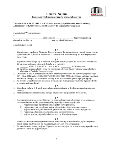 Umowa Najmu dwustanowiskowego garażu motocyklowego Zawarta w dniu 01.10.2010 r. w Krakowie pomiędzy Spółdzielnią Mieszkaniową „Bieńczyce” w Krakowie os. Kombatantów 10 reprezentowaną przez: zwanej dalej Wynajmującym, a __________________________zamieszkały: ________________ legitymującym się dowodem osobistym _______________ zwanym dalej Najemcą. o następującej treści: 1. 1. 2. 3. 1. 2. §1 Wynajmujący oddaje, a Najemca bierze w najem dwustanowiskowy garaż motocyklowy o powierzchni 9,96 m² w zespole os. J. Strusia 10A przeznaczony do przetrzymywania motocykla. §2 Najemca zobowiązuje się w ramiach niniejszej umowy najmu do uiszczania co miesiąc: 1) czynszu najmu za używanie lokalu w wysokości: _______ zł/m² x 9,96 m² x 23 % VAT = _________ zł /miesięcznie 2) opłaty za energie elektryczną, na podstawie odrębnej faktury stanowiącej refakturę obciążeń z Zakładu Energetycznego, Określone w ust. 1 należności Najemca przekazywać będzie na konto wynajmującego: BPH S.A. O/Kraków 48 1060 0076 0000 3210 0014 7538, do 10-tego każdego miesiąca za miesiąc bieżący, na podstawie faktury VAT wystawionej przez wynajmującego. Za zwłokę w spełnieniu świadczenia pieniężnego, Wynajmujący naliczał będzie odsetki w ustawowej wysokości. §3 Wysokość opłat w § 2 ust.1 może ulec zmianie jedynie w drodze aneksu do niniejszej umowy. Przekazanie przedmiotu najmu nastąpi obustronnie podpisanym protokołem. §4 1. Rozwiązanie umowy z winy Najemcy z obowiązkiem niezwłocznego protokolarnego przekazania stanowiska postojowego Wynajmującemu następuje gdy: 1) Najemca zalega z płatnościami za jeden okres płatności, 2) Najemca używa przedmiot najmu niezgodnie z jego przeznaczeniem, 3) Najemca dokona jakichkolwiek przeróbek czy zmian w substancji garażu, 4) Najemca podnajmie przedmiot najmu osobom trzecim, 5) Najemca w inny sposób działa na szkodę Wynajmującego. §5 1. Niniejsza umowa zostaje spisana na czas nieokreślony z możliwością jej rozwiązania przez każdą ze stron za 1-no miesięcznym okresem wypowiedzenia. 2. Po zakończeniu umowy najmu, Najemca obowiązany jest do protokolarnego przekazania garażu w stanie nie pogorszonym. 1 3. Najemca zobowiązany jest pokryć wszelkie koszty przywrócenia garażu do stanu pierwotnego tj. stanu zgodnego z protokołem określonym w § 1 ust.2. 4. W przypadku bezumownego użytkowania lokalu Wynajmującemu przysługuje odszkodowanie w wysokości 2-u krotnej ostatnio obowiązującej stawki czynszowej. §6 W sprawach nie unormowanych zastosowanie mają przepisy kodeksu cywilnego. §7 Umowa niniejsza została sporządzona w 4 egzemplarzach, z których jeden otrzymuje Najemca a trzy Wynajmujący. . Wynajmujący : Najemca: ____________________ _________________ __________________________ 2