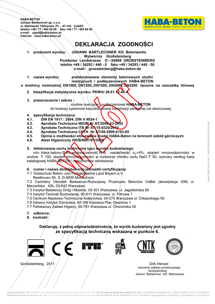 HABA-BETON Johann Bartlechner sp. z o.o. ul. Niemiecka 1/Olszowa PL – 47-143 UJAZD telefon +48 / 77 / 405 69 00 faks +48 / 77 / 405 69 50 e-mail: [email protected] internet: www.haba-beton.pl DEKLARACJA ZGODNOŚCI 1. producent wyrobu: JOHANN BARTLECHNER KG Betonwerke Wytwórnia Großsteinberg Pomßener Landstrasse D – 04668 GROßSTEINBERG telefon +49 / 34293 / 440 - 0 faks +49 / 34293 / 440 - 50 e-mail: [email protected] 1. nazwa wyrobu: prefabrykowane elementy betonowych studni rewizyjnych i podłączeniowych HABA-BETON o średnicy nominalnej DN1000, DN1200, DN1500, DN2000, DN2500 łączone na uszczelkę klinową 2. klasyfikacja statystyczna wyrobu: PKWiU 26.61.12-40.4 3. przeznaczenie i zakres : studnie rewizyjne i podłaczeniowe HABA-BETON do budowy systemów bezciśnieniowej kanalizacji sanitarnej lub deszczowej 4. specyfikacja techniczna: 4.1. DIN EN 1917 : 2004, DIN V 4034-1 4.2. Aprobata Techniczna IBDiM Nr AT/2009-03-2455 4.3. Aprobata Techniczna ITB Nr AT-15-8320/2010 4.4. Aprobata Techniczna CNTK Nr AT/09-2009-0193-00 4.5. Opinia o możliwości stosowania studni HABA-Beton na terenach szkód górniczych 4.6. Atest Higieniczny HK/B/0047/01/2009 5. deklarowane cechy techniczne typu wyrobu budowlanego: min. klasa betonu B-45, wodoszczelność W-8, nasiąkliwość nw<4%, stopień mrozoodporności w wodzie F 150, stopień mrozoodporności w roztworze chlorku sodu NaCl F 50, wymiary według karty katalogowej HABA-BETON i dokumentów odniesienia 6. numer i nazwa akredytowanej jednostki certyfikującej: 7.1 Güteschutz Beton- und Fertigteilwerke Land Bayern e.V. Beethoven Str. 8 D-8000 Monachium 7.2 Centralny Ośrodek Badawczo-Rozwojowy Przemysłu Betonów CeBet (akredytacja 008) ul. Marywilska 42b, 03-042 Warszawa 7.3 Instytut Badawczy Dróg i Mostów, 03-301 Warszawa, ul. Jagiellońska 80 7.4 Instytut Techniki Budowlanej, 00-611 Warszawa, ul. Filtrowa 1 7.5 Centrum Naukowo-Techniczne Kolejnictwa, 04-275 Warszawa ul. Chłopickiego 50 7.6 Główny Instytut Górnictwa, 40-166 Katowice Plac Gwarków 1 7.7 Państwowy Zakład Higieny, 00-791 Warszawa ul. Chocimska 24 7. odbiorca: 9. kontrakt: Deklaruję, z pełną odpowiedzialnością, że wyrób budowlany jest zgodny ze specyfikacją techniczną wskazaną w punkcie 6. Großsteinberg, 2011 Dirk Hensel kierownik zakładu produkcyjnego Großsteinberg Johann Bartlechner KG Betonwerke
