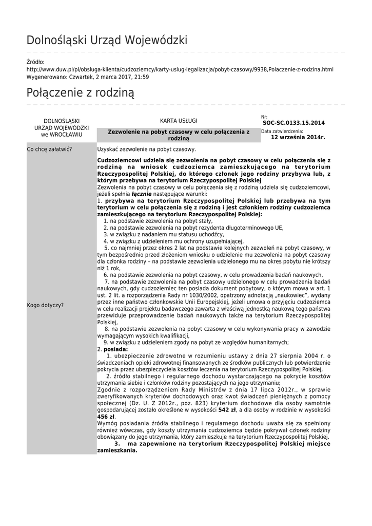 Dolnośląski Urząd Wojewódzki Źródło: http://www.duw.pl/pl/obsluga-klienta/cudzoziemcy/karty-uslug-legalizacja/pobyt-czasowy/9938,Polaczenie-z-rodzina.html Wygenerowano: Czwartek, 2 marca 2017, 21:59 Połączenie z rodziną DOLNOŚLĄSKI URZĄD WOJEWÓDZKI we WROCŁAWIU KARTA USŁUGI Zezwolenie na pobyt czasowy w celu połączenia z rodziną Nr: SOC-SC.0133.15.2014 Data zatwierdzenia: 12 września 2014r. Co chcę załatwić? Uzyskać zezwolenie na pobyt czasowy. Kogo dotyczy? Cudzoziemcowi udziela się zezwolenia na pobyt czasowy w celu połączenia się z rodziną na wniosek cudzoziemca zamieszkującego na terytorium Rzeczypospolitej Polskiej, do którego członek jego rodziny przybywa lub, z którym przebywa na terytorium Rzeczypospolitej Polskiej Zezwolenia na pobyt czasowy w celu połączenia się z rodziną udziela się cudzoziemcowi, jeżeli spełnia łącznie następujące warunki: 1. przybywa na terytorium Rzeczypospolitej Polskiej lub przebywa na tym terytorium w celu połączenia się z rodziną i jest członkiem rodziny cudzoziemca zamieszkującego na terytorium Rzeczypospolitej Polskiej: 1. na podstawie zezwolenia na pobyt stały, 2. na podstawie zezwolenia na pobyt rezydenta długoterminowego UE, 3. w związku z nadaniem mu statusu uchodźcy, 4. w związku z udzieleniem mu ochrony uzupełniającej, 5. co najmniej przez okres 2 lat na podstawie kolejnych zezwoleń na pobyt czasowy, w tym bezpośrednio przed złożeniem wniosku o udzielenie mu zezwolenia na pobyt czasowy dla członka rodziny – na podstawie zezwolenia udzielonego mu na okres pobytu nie krótszy niż 1 rok, 6. na podstawie zezwolenia na pobyt czasowy, w celu prowadzenia badań naukowych, 7. na podstawie zezwolenia na pobyt czasowy udzielonego w celu prowadzenia badań naukowych, gdy cudzoziemiec ten posiada dokument pobytowy, o którym mowa w art. 1 ust. 2 lit. a rozporządzenia Rady nr 1030/2002, opatrzony adnotacją „naukowiec”, wydany przez inne państwo członkowskie Unii Europejskiej, jeżeli umowa o przyjęciu cudzoziemca w celu realizacji projektu badawczego zawarta z właściwą jednostką naukową tego państwa przewiduje przeprowadzenie badań naukowych także na terytorium Rzeczypospolitej Polskiej, 8. na podstawie zezwolenia na pobyt czasowy w celu wykonywania pracy w zawodzie wymagającym wysokich kwalifikacji, 9. w związku z udzieleniem zgody na pobyt ze względów humanitarnych; 2. posiada: 1. ubezpieczenie zdrowotne w rozumieniu ustawy z dnia 27 sierpnia 2004 r. o świadczeniach opieki zdrowotnej finansowanych ze środków publicznych lub potwierdzenie pokrycia przez ubezpieczyciela kosztów leczenia na terytorium Rzeczypospolitej Polskiej, 2. źródło stabilnego i regularnego dochodu wystarczającego na pokrycie kosztów utrzymania siebie i członków rodziny pozostających na jego utrzymaniu; Zgodnie z rozporządzeniem Rady Ministrów z dnia 17 lipca 2012r., w sprawie zweryfikowanych kryteriów dochodowych oraz kwot świadczeń pieniężnych z pomocy społecznej (Dz. U. Z 2012r., poz. 823) kryterium dochodowe dla osoby samotnie gospodarującej zostało określone w wysokości 542 zł, a dla osoby w rodzinie w wysokości 456 zł. Wymóg posiadania źródła stabilnego i regularnego dochodu uważa się za spełniony również wówczas, gdy koszty utrzymania cudzoziemca będzie pokrywał członek rodziny obowiązany do jego utrzymania, który zamieszkuje na terytorium Rzeczypospolitej Polskiej. 3. ma zapewnione na terytorium Rzeczypospolitej Polskiej miejsce zamieszkania. Niezbędne dokumenty: 1. 3 egzemplarze wypełnionego zgodnie z pouczeniem wniosku o udzielenie zezwolenia na pobyt czasowy Co przygotować? Jakie dokumenty muszę wypełnić? Jak wypełnić dokumenty? Ile muszę zapłacić? Kiedy złożyć dokumenty? 2. Cztery fotografie spełniające następujące wymagania: • nieuszkodzone, kolorowe, o dobrej ostrości; • wymiary 35 mm x 45 mm; • wykonane nie wcześniej niż w ciągu 6 miesięcy przed dniem złożenia wniosku; • przedstawiające wizerunek twarzy cudzoziemca od wierzchołka głowy do górnej części barków, tak aby twarz zajmowała 70-80% fotografii, na jednolitym jasnym tle, w pozycji frontalnej, patrzącego na wprost z otwartymi oczami, nieprzesłoniętymi włosami, z naturalnym wyrazem twarzy i zamkniętymi ustami, a także odwzorowują naturalny kolor jego skóry; • przedstawiające wyraźnie oczy cudzoziemca, a zwłaszcza źrenice, linia oczu cudzoziemca jest równoległa do górnej krawędzi fotografii Uwaga: Cudzoziemiec noszący nakrycie głowy zgodnie z zasadami swojego wyznania może dołączyć do wniosku fotografię przedstawiającą go w nakryciu głowy, o ile wizerunek twarzy jest w pełni widoczny. W takim przypadku do wniosku dołącza się oświadczenie cudzoziemca o przynależności do wspólnoty wyznaniowej. 3. Kserokopia ważnego dokumentu podróży (oryginał do wglądu), w szczególnie uzasadnionym przypadku, gdy cudzoziemiec nie posiada ważnego dokumentu podróży i nie ma możliwości jego uzyskania, może przedstawić inny dokument potwierdzający tożsamość. Uwaga: Brak któregokolwiek z ww. dokumentów spowoduje wezwanie cudzoziemca do jego uzupełnienia w terminie 7 dni od doręczenia wezwania pod rygorem pozostawienia wniosku bez rozpoznania. Typowe dokumenty potwierdzające okoliczności wskazane we wniosku: 1. dokumenty potwierdzające stopień pokrewieństwa uznawane przez prawo Rzeczypospolitej Polskiej (akty stanu cywilnego: akt małżeństwa, akt urodzenia), 2. dokumenty potwierdzające posiadanie przez cudzoziemca, z którym zamierza przebywać na terytorium RP, wymaganego prawem zezwolenia na pobyt, 3. dokumenty potwierdzające posiadanie stabilnego i regularnego źródła dochodu wystarczającego na pokrycie kosztów utrzymania siebie i członków rodziny pozostających na jego utrzymaniu ( np. umowa o pracę, zeznania PIT o wysokości osiągniętego dochodu cudzoziemca za ostatni rok podatkowy lub stosowne zaśw