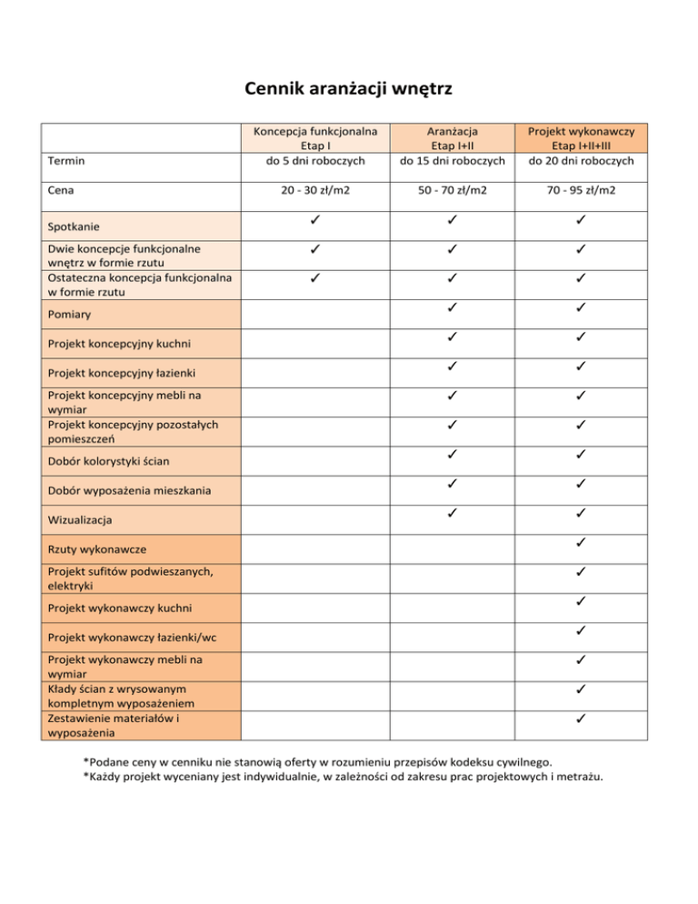 Cennik aranżacji wnętrz Termin Cena Spotkanie Dwie koncepcje funkcjonalne wnętrz w formie rzutu Ostateczna koncepcja funkcjonalna w formie rzutu Pomiary Projekt koncepcyjny kuchni Projekt koncepcyjny łazienki Projekt koncepcyjny mebli na wymiar Projekt koncepcyjny pozostałych pomieszczeń Dobór kolorystyki ścian Dobór wyposażenia mieszkania Wizualizacja Rzuty wykonawcze Projekt sufitów podwieszanych, elektryki Projekt wykonawczy kuchni Projekt wykonawczy łazienki/wc Projekt wykonawczy mebli na wymiar Kłady ścian z wrysowanym kompletnym wyposażeniem Zestawienie materiałów i wyposażenia Koncepcja funkcjonalna Etap I do 5 dni roboczych Aranżacja Etap I+II do 15 dni roboczych Projekt wykonawczy Etap I+II+III do 20 dni roboczych 20 - 30 zł/m2 50 - 70 zł/m2 70 - 95 zł/m2 ✓ ✓ ✓ ✓ ✓ ✓ ✓ ✓ ✓ ✓ ✓ ✓ ✓ ✓ ✓ ✓ ✓ ✓ ✓ ✓ ✓ ✓ ✓ ✓ ✓ ✓ ✓ ✓ ✓ ✓ ✓ ✓ *Podane ceny w cenniku nie stanowią oferty w rozumieniu przepisów kodeksu cywilnego. *Każdy projekt wyceniany jest indywidualnie, w zależności od zakresu prac projektowych i metrażu.