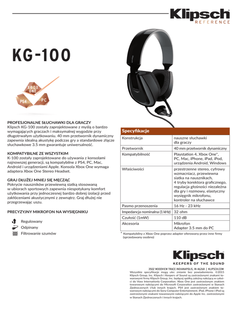 KG-100 ONE PROFESJONALNE SŁUCHAWKI DLA GRACZY Klipsch KG-100 zostały zaprojektowane z myślą o bardzo wymagających graczach i maksymalnej wygodzie przy długotrwałym użytkowaniu. 40 mm przetwornik dynamiczny zapewnia idealną akustykę podczas gry a standardowe złącze słuchawkowe 3.5 mm gwarantuje uniwersalność. KOMPATYBILNE ZE WSZYSTKIM K-100 zostały zaprojektowane do używania z konsolami najnowszej generacji, są kompatybilne z PS4, PC, Mac, Android i urządzeniami Apple. Konsola Xbox One wymaga adaptera Xbox One Stereo Headset. GRAJ DŁUŻEJ MNIEJ SIĘ MĘCZĄC Pokrycie nauszników przewiewną siatką stosowaną w ubiorach sportowych zapewnia niespotykany komfort użytkowania przy jednoczesnej bardzo dobrej izolacji przed zakłóceniami akustycznymi z zewnątrz. Graj dłużej nie przegrzewając uszu. PRECYZYJNY MIKROFON NA WYSIĘGNIKU Regulowany Odpinany Filtrowanie szumów Specyfikacje Konstrukcja nauszne słuchawki dla graczy Przetwornik 40 mm przetwornik dynamiczny Kompatybilność Playstation 4, Xbox One*, PC, Mac, iPhone, iPad, iPod, urządzenia Android, Windows Właściwości przestrzenne stereo, cyfrowy wzmacniacz, przewiewna siatka na nausznikach, 4 tryby korektora graficznego, regulacja głośności niezależna dla gry i rozmowy, elastyczny wysięgnik mikrofonu, kontroler na słuchawce Pasmo przenoszenia 16 Hz - 23 kHz Impedancja nominalna (1 kHz) 32 ohm Czułość (1mW) 110 dB Akcesoria Mikrofon Adapter 3.5 mm do PC * Kompatybilny z Xbox One poprzez adapter oferowany przez inne firmy (sprzedawany osobno) Wszystkie specyfikacje mogą ulec zmianie bez powiadomienia. ©2015 Klipsch Group, Inc. Klipsch i Keepers of Sound są zastrzeżonymi znakami towarowymi firmy Klipsch Group, Inc. będącej spółką zależną należącą w całości do Voxx Internationla Corporation. Xbox One jest zastrzeżonym znakiem towarowym należącymi do Microsoft Corporation zastrzeżonymi w Stanach Zjednoczonych i/lub innych krajach. PS4 jest zastrzeżonym znakiem towarowym należącymi do Sony Computer Entertainment. iPad, iPhone i iPod są zastrzeżonymi znakami towarowymi należącymi do Apple Inc. zastrzeżonymi w Stanach Zjednoczonych i innych krajach.