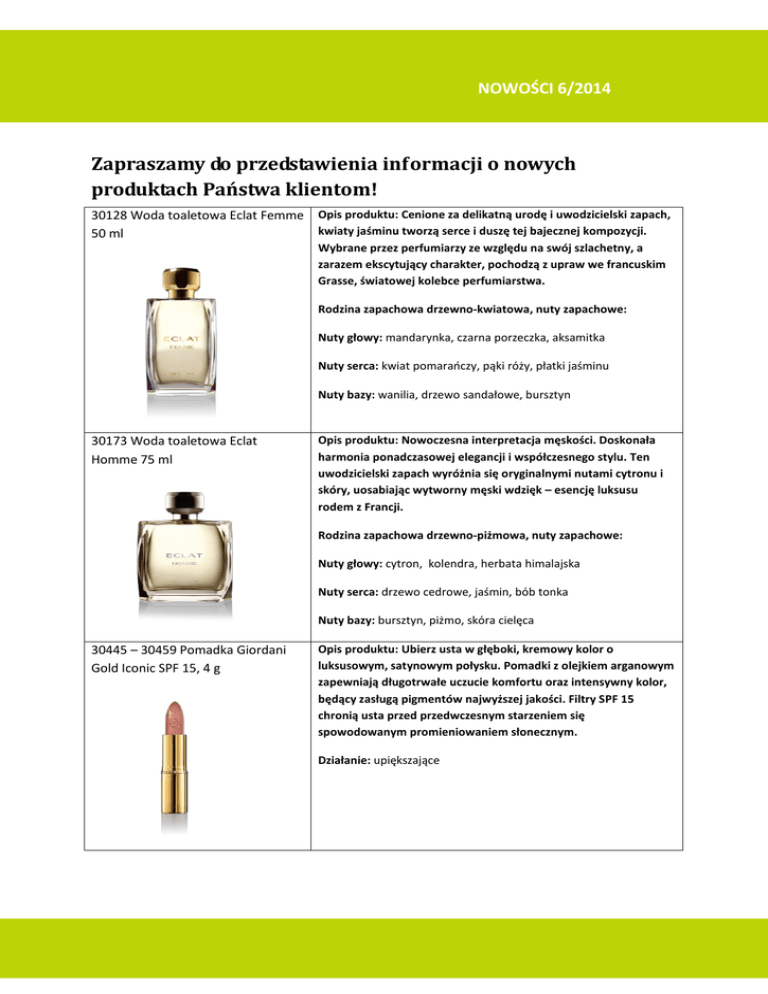 NOWOŚCI 6/2014 ORIFLAME POLAND Zapraszamy do przedstawienia informacji o nowych produktach Państwa klientom! 30128 Woda toaletowa Eclat Femme 50 ml Opis produktu: Cenione za delikatną urodę i uwodzicielski zapach, kwiaty jaśminu tworzą serce i duszę tej bajecznej kompozycji. Wybrane przez perfumiarzy ze względu na swój szlachetny, a zarazem ekscytujący charakter, pochodzą z upraw we francuskim Grasse, światowej kolebce perfumiarstwa. Rodzina zapachowa drzewno-kwiatowa, nuty zapachowe: Nuty głowy: mandarynka, czarna porzeczka, aksamitka Nuty serca: kwiat pomarańczy, pąki róży, płatki jaśminu Nuty bazy: wanilia, drzewo sandałowe, bursztyn 30173 Woda toaletowa Eclat Homme 75 ml Opis produktu: Nowoczesna interpretacja męskości. Doskonała harmonia ponadczasowej elegancji i współczesnego stylu. Ten uwodzicielski zapach wyróżnia się oryginalnymi nutami cytronu i skóry, uosabiając wytworny męski wdzięk – esencję luksusu rodem z Francji. Rodzina zapachowa drzewno-piżmowa, nuty zapachowe: Nuty głowy: cytron, kolendra, herbata himalajska Nuty serca: drzewo cedrowe, jaśmin, bób tonka Nuty bazy: bursztyn, piżmo, skóra cielęca 30445 – 30459 Pomadka Giordani Gold Iconic SPF 15, 4 g Opis produktu: Ubierz usta w głęboki, kremowy kolor o luksusowym, satynowym połysku. Pomadki z olejkiem arganowym zapewniają długotrwałe uczucie komfortu oraz intensywny kolor, będący zasługą pigmentów najwyższej jakości. Filtry SPF 15 chronią usta przed przedwczesnym starzeniem się spowodowanym promieniowaniem słonecznym. Działanie: upiększające NOWOŚCI 6/2014 30915 Ujędrniający krem na dzień Royal Velvet z filtrem SPF 15 – edycja jubileuszowa 50 ml Opis produktu: Odkryj luksus w najczystszej postaci! Specjalna ORIFLAME POLAND edycja ulubionego kremu wielu kobiet, wzbogacona ekstraktem z majestatycznego irysa, intensywnie odżywia skórę i wyraźnie ją ujędrnia. Aksamitna konsystencja sprawia, że krem idealnie łączy się ze skórą, zapewniając jej niezwykłą miękkość. Działanie: odżywiające, ujędrniające, zmiękczające 30131 Woda toaletowa Very Me Spring Tenderness 30 ml Opis produktu: Poczuj przypływ wiosennej radości! Urocze poziomki w towarzystwie egzotycznego liczi i delikatnych konwalii poprowadzą Cię ścieżką prosto do krainy szczęścia. Rodzina zapachowa szyprowo-kwiatowo-owocowa, nuty zapachowe: Nuty głowy: bergamotka, jabłko, liczi Nuty serca: peonia, lilia Nuty bazy: drzewo sandałowe, paczula, dzika truskawka 30499 – 30501 Lakier do paznokci Very Me Spring Tenderness 8 ml Opis produktu: Bajecznie lśniące, opalizujące najmodniejszymi odcieniami sezonu. Inspirowane kolorami wiosny! Działanie: upiększające NOWOŚCI 6/2014 30141 Pieniący się żel do mycia twarzy Ecollagen 200 ml Opis produktu: Jedna kropla tego wyjątkowo gęstego żelu ORIFLAME POLAND wystarczy do oczyszczenia i zrewitalizowania skóry. Po umyciu skóra jest orzeźwiona, a uczucie ukojenia i komfortu – zdumiewające! Żel zawiera ekstrakt z roślinnych komórek macierzystych. Zmieszaj go z wodą, aż powstanie piana, zmyj. Polecany do cery przetłuszczającej się. Działanie: odświeżające, oczyszczające, kojące 30139 Wygładzający tonik Ecollagen Skin Perfecting 200 ml Opis produktu: To więcej niż tonik – przełomowe połączenie ekstraktu z roślinnych komórek macierzystych i kwasów owocowych odświeża i delikatnie złuszcza skórę, przywracając jej równowagę. Wygładza ją, stymuluje odnowę i wspomaga redukcję zmarszczek. Zwilż tonikiem wacik, rozprowadź na twarzy. Działanie: odświeżające, delikatnie złuszczające, wygładzające, nawilżające 30181 Wzmacniający szampon do włosów HairX 250 ml Opis produktu: Głęboko oczyszcza włosy – świetny zwłaszcza do mycia słabych włosów, które łatwo się łamią. Zawiera proteiny drożdży zwiększające wytwarzanie keratyny. Włosy stają się mocniejsze i bardziej lśniące, wyglądają zdrowiej.* Działanie: oczyszczające, wzmacniające, odświeżające NOWOŚCI 6/2014 30182 Tonik wzmacniający włosy HairX 100 ml Opis produktu: Intensywne serum bez spłukiwania zawierające ORIFLAME POLAND proteiny drożdży, wzmacnia włosy od cebulek, by wyglądały zdrowo i olśniewająco. Kompleks wzmacniający nadaje włosom sprężystość i elastyczność. Wmasuj w wilgotną lub suchą skórę głowy, nie spłukuj. Działanie: wzmacniające 30064 Szampon przywracający włosom równowagę HairX 250 ml Opis produktu: Zawiera system normalizujący, który reguluje wytwarzanie sebum i zmniejsza skłonność włosów do przetłuszczania się. Testy potwierdziły, że stosowanie szamponu wydłuża czas do kolejnego mycia włosów, a włosy wyglądają świeżo przez nawet 72 godziny.* Działanie: oczyszczające, odświeżające 30065 Suchy szampon do włosów HairX 150 ml Opis produktu: Zawiera system normalizujący, który natychmiast rozprawia się z nieestetycznym wyglądem przetłuszczonych włosów. Wstrząśnij i rozpyl na włosy przy skórze z odległości 30 cm, wmasuj opuszkami palców i ułóż fryzurę jak zwykle. Działanie: oczyszczające, odświeżające NOWOŚCI 6/2014 31057 Serum wygładzające w kapsułkach Time Reversing SkinGenistTM 30 szt. Opis produktu: Luksus doskonałego odżywienia dla Twojej skóry! ORIFLAME POLAND Kapsułki z jednorazową dawką serum zawierają skutecznie działające połączenie ekstraktu z soi z cennymi olejkami. Stosuj codziennie rano i wieczorem pod krem na dzień lub na noc i doświadcz wspaniałego uczucia głęboko odżywionej, cudownie odmłodzonej skóry. 30628 – 30635 Błyszczyk Power Shine The ONE 5 ml Opis produktu: Gwiezdny blask na Twoich ustach! Efekt lustrzanego połysku i większych, pełniejszych ust to zasługa specjalnej formuły oraz aplikatora ShineBoost zapewniającego idealną aplikację. Wygładzający kompleks GlossKiss gwarantuje uczucie gładkości i nawilżenia przez nawet 8 godzin. 30612 – 3061