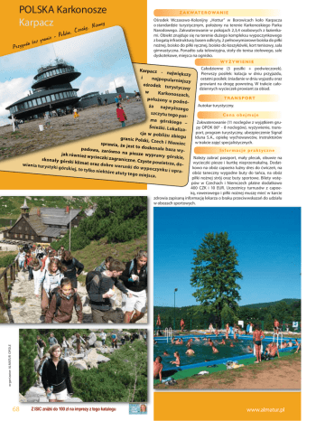 POLSKA Karkonosze Karpacz iemcy echy, N Po l s k a , c i n gra da bez o g y z r P Cz Z A K WAT E R O WA N I E Ośrodek Wczasowo-Kolonijny „Hottur” w Borowicach koło Karpacza o standardzie turystycznym, położony na terenie Karkonoskiego Parku Narodowego. Zakwaterowanie w pokojach 2,3,4 osobowych z łazienkami. Obiekt znajduje się na terenie dużego kompleksu wypoczynkowego z bogatą infrastrukturą: basen odkryty, 2 pełnowymiarowe boiska do piłki nożnej, boisko do piłki ręcznej, boisko do koszykówki, kort tenisowy, sala gimnastyczna. Ponadto sala telewizyjna, stoły do tenisa stołowego, sale dyskotekowe, miejsca na ognisko. WYŻYWIENIE Całodzienne (3 posiłki + podwieczorek). Pierwszy posiłek: kolacja w dniu przyjazdu, ostatni posiłek: śniadanie w dniu wyjazdu oraz prowiant na drogę powrotną. W trakcie całodziennych wycieczek prowiant za obiad. Karpacz - na jwiększy i najpopularni ejszy ośrodek tury styczny w Karkonoszach , TRANSPORT położony u po dnóAutokar turystyczny. ża najw yższ ego szczytu tego Cena obejmuje pasma górskieg Zakwaterowanie (11 noclegów z wyjątkiem gruo – Śnieżki. Loka py OPOK 06* - 8 noclegów), wyżywienie, translizaport, program turystyczny, ubezpieczenie Signal cja w pobliżu zbiegu Iduna S.A., opiekę wychowawców, instruktorów granic Polski , Czech i Niem w trakcie zajęć specjalistycznych. iec sprawia, że je st to doskonał padowa, zaró a baza w yInformacje praktyczne wno na pies ze w ypraw y jak również w górskie, ycieczki zagr Należy zabrać paszport, mały plecak, obuwie na aniczne. Czys skonał y górs te powietrze, ki klimat oraz wycieczki piesze i kurtkę nieprzemakalną. Dodatdo dobre warun wiania turyst ki do w ypoczy yki górskiej, kowo na obóz capoeira luźny dres do ćwiczeń, na to tylko niek tó nku i uprare atuty tego obóz taneczny wygodne buty do tańca, na obóz miejsca. piłki nożnej strój oraz buty sportowe. Bilety wstę- organizator: ALMATUR OPOLE pów w Czechach i Niemczech płatne dodatkowo 400 CZK i 10 EUR. Uczestnicy turnusów z capoeirą, rowerowego i piłki nożnej muszę mieć w karcie zdrowia zapisaną informację lekarza o braku przeciwwskazań do udziału w obozach sportowych. 68 Z ISIC zniżki do 100 zł na imprezy z tego katalogu www.almatur.pl Kolonia rekreacyjna (10 – 14 lat) Obóz rekreacyjny (15 – 18 lat) Całodzienna wycieczka do Czech - Liberec (pobyt w Aquaparku), Harrachow (skocznia narciarska). Całodzienna wycieczka do Niemiec - Drezno (Zwinger, Residenzschloss, Opera Państwowa, katedra Hofkirche, Albertinum, Tarasy Bruhla, Pomnik Augusta II Mocnego). Wizyta w miasteczku Western City, gdzie można zobaczyć szeryfa, odwiedzić „saloon” i być świadkiem napadu na bank, obejrzeć kowbojskie popisy w jeździe konnej, spróbować dosiąść konia pod okiem kowboja, nauczyć się strzelać z łuku indiańskiego. Wycieczki piesze po szlakach Karkonoszy: wyprawa na Śnieżkę z przewodnikiem, Świątynia Wang. Konkursy, gry, zabawy, dyskoteki, ognisko z pieczeniem kiełbasek, kąpiele w basenie. Kolonia capoeira (10 – 14 lat) Obóz capoeira (15 – 18 lat) Program jak na obozie rekreacyjnym oraz dodatkowo zajęcia capoeiry - brazylijskiej sztuki walki ukrytej w tańcu. Capoeira powstała w czasach, kiedy Brazylia była portugalską kolonią. Portugalczycy sprowadzali afrykańskich niewolników do pracy na plantacjach trzciny cukrowej. Niewolnikom nie wolno było uczyć się walczyć, więc swoją sztukę walki ukryli w tańcu. Tu każdy ruch ma swoją przyczynę i jest odpowiedzią na zachowanie przeciwnika. Podczas treningów po rozgrzewce i rozciąganiu ćwiczymy pojedyncze techniki oraz całe kombinacje, uczymy się grać na instrumentach, śpiewać, tańczyć sambę i maculele. Obóz piłki nożnej (12-18 lat) Program jak na obozie rekreacyjnym oraz dodatkowo zajęcia z piłki nożnej. Program obozu obejmuje 2 treningi po 1,5 godziny dziennie. Zajęcia odbywać będą się na pełnowymiarowym boisku trawiastym oraz na boisku ze sztuczną nawierzchnią. Treningi obejmą takie elementy jak: technika, taktyka, przygotowanie kondycyjne. Treningi pod okiem trenera piłki nożnej dostosowane do wieku uczestników. Obóz piłki siatkowej (12-18 lat) Program jak na obozie rekreacyjnym oraz dodatkowo zajęcia z piłki siatkowej. Program obozu obejmuje 2 treningi po 1,5 godziny dziennie. Zajęcia odbywać się będą na profesjonalnym boisku do piłki siatkowej oraz na Sali gimnastycznej. Treningi pod okiem trenera piłki siatkowej. Kolonia wokalna (10 – 14 lat) Obóz wokalny (15 – 18 lat) Nr grupy Terminy Rekreacyjny Capoeira OPOK 01 23.06 - 04.07 1.299 zł 1.449 zł OPOK 02 05.07 - 16.07 1.299 zł 1.449 zł OPOK 03 17.07 - 28.07 1.299 zł 1.449 zł OPOK 04 29.07 - 09.08 1.299 zł 1.449 zł OPOK 05 10.08 - 21.08 1.299 zł 1.449 zł OPOK 06* 22.08 - 30.08 1.149 zł 1.299 zł Zniżka dla Stałych Klientów - 50 zł First Minute - zniżka 100 zł do 28.02.2009 r. Wiosenna Promocja - zniżka 50 zł do 31.03.2009 r. Szczegóły na str.2 piłki nożnej, siatkowej taneczny, wokalny 1.349 zł 1.349 zł 1.349 zł 1.349 zł 1.349 zł 1.199 zł 1.349 zł 1.349 zł 1.349 zł 1.349 zł 1.349 zł 1.199 zł Rozkład Jazdy Godz. odjazdu Miejscowość Dopłata Godz. powrotu 03.00 Gdańsk 100 zł ok. 01.30* 05.45 Bydgoszcz 100 zł ok. 22.50 06.55 Toruń 100 zł ok. 21.50 08.05 Włocławek 100 zł ok. 20.50 09.25 Płock 100 zł ok. 19.45 10.45 Kutno 100 zł ok. 18.30 12.15 Łódź 75 zł ok. 17.15 13.20 Piotrków Tryb. 75 zł ok. 16.15 50 zł 13.55 Radomsko 15.00 Częstochowa ok. 15.45 13.10 Sosnowiec 25 zł ok. 16.00 12.50 Katowice 25 zł ok. 16.30 ok. 15.00 11.30 Kraków 50 zł ok. 17.45 07.15 Białystok 100 zł ok. 21.30 100 zł ok. 18.30 11.00 Warszawa 18.00 Wrocław ok. 11.30 16.30 Opole ok. 13.00 Przyjazd ok. 21.00 Wyjazd Borowice k/Karpacza 07.30 Lista przystanków na str. 118. *powrót następnego dnia Oferta obozu wokalno-muzycznego skierowana jest do osób kochających muzykę. U