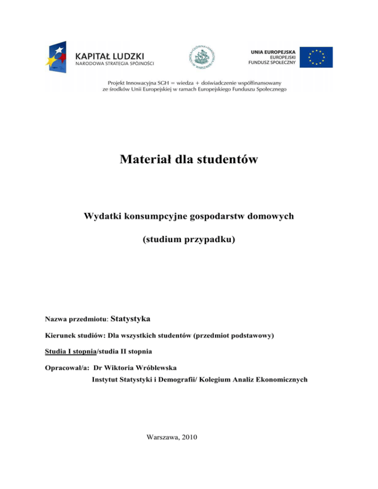 Materiał dla studentów Wydatki konsumpcyjne gospodarstw domowych (studium przypadku) Nazwa przedmiotu: Statystyka Kierunek studiów: Dla wszystkich studentów (przedmiot podstawowy) Studia I stopnia/studia II stopnia Opracował/a: Dr Wiktoria Wróblewska Instytut Statystyki i Demografii/ Kolegium Analiz Ekonomicznych Warszawa, 2010 I. Informacje wstępne Praca nad przypadkiem pozwala na zastosowanie wiedzy teoretycznej wyniesionej z zajęć ze statystyki do analizy danych rzeczywistych pochodzących z badania i ma słuŜyć przełoŜeniu teorii na praktykę oraz zachęcić do stosowania nabytych umiejętności w przyszłości, np. w procesie studiowania i pisania pracy na stopień. W trakcie pracy przydatne będą umiejętności odnoszące się do analizy struktury (prezentacje graficzne i tabelaryczne oraz wyznaczanie miar połoŜenia, zróŜnicowania i asymetrii rozkładu), a takŜe znajomość podstaw wnioskowania statystycznego. Zaproponowany kejs ma na celu głębsze wejście w problematykę porządkowania i prezentowania informacji statystycznych oraz ujawnia moŜliwe trudności i ograniczenia, z którymi moŜna się spotkać w przypadku analizy danych rzeczywistych. Uczy wyboru miar i krytycznej interpretacji uzyskanych wyników oraz pokazuje, Ŝe naleŜy szukać róŜnych rozwiązań, które mogą słuŜyć lepszemu poznaniu i opisowi zjawiska. Zakres analiz w ramach studium przypadku pozwala takŜe formułować wnioski dotyczących całej populacji na podstawie wyników uzyskanych w próbie. II. Harmonogram/scenariusz realizacji/kolejność działań 1. Proszę zapoznać się z informacjami zawartymi w opisie przypadku (p.III) i danymi zawartymi w pliku: struktura zbioru, opis i kategorie zmiennych. Dokonać selekcji posiadanych informacji i określić zmienne, które mogą być pomocne do opisu poziomu wydatków konsumpcyjnych gospodarstw domowych województwa mazowieckiego w 2008 roku. 2. Korzystając z odpowiedniej procedury w programie komputerowym dokonać wstępnej analizy opisowej danych dotyczących poziomu wydatków na towary i usługi konsumpcyjne obejmującej: zakres zmienności (wartości minimalne i maksymalne), miary połoŜenia, miary zróŜnicowania i asymetrię rozkładu. 2 3. Co moŜna zrobić z problemem duŜej zmienności i silnej asymetrii uzyskanej dla danych indywidualnych? Zaproponować dalsze metody postępowania. (Dyskusja na forum grupy) 4. Zaproponować sposób grupowania danych: wybór sposobu prezentacji graficznej i tabelarycznej danych dla zmiennej wydatki konsumpcyjne oraz wyznaczyć miary połoŜenia (średnia, mediana) na podstawie danych pogrupowanych). (Praca małym zespole 2-osobowym). 5. Porównać uzyskane wyniki oraz dokonać ich krytycznej oceny korzystając z wiedzy teoretycznej ze statystyki. (Dyskusja na forum grupy) 6. Które ze zmiennych charakteryzujących respondenta mogą być wzięte pod uwagę jako zmienne powiązane (róŜnicujące) poziom wydatków? (W przypadku realizacji przypadku z wykorzystaniem arkusza kalkulacyjnego Excel pomocne mogą być załączone wydruki z programu SPSS). 7. Zaproponować postępowanie mające na celu uogólnienie uzyskanych wyników na całą populację gospodarstw domowych województwa mazowieckiego. Wykonać odpowiednie analizy i podać komentarz dla uzyskanych wyników. 8. Jakie moŜna wskazać mocne i słabe strony zastosowanych analiz statystycznych? Czy widzisz ich przydatność da analiz danych społecznych i ekonomicznych? Czy sądzisz, Ŝe będziesz mógł wykorzystać te metody w przyszłości, np. przy pisaniu pracy licencjackiej? III. Opis przypadku/sytuacji Badanie BudŜetów Gospodarstw Domowych (BBGD) jest to powtarzalne badanie przekrojowe realizowane od prawie trzydziestu lat przez Główny Urząd Statystyczny na duŜej próbie ponad 30 tys. gospodarstw domowych1. Od 1997 roku badanie to weszło w skład Europejskiego Programu Badań Gospodarstw Domowych (ECHP). Badanie to jest reprezentacyjne i stanowi dobre źródło informacji o warunkach bytu ludności, strukturze i poziomie dochodów oraz wydatkach gospodarstw domowych w Polsce. W ramach badania BBGD przeprowadzany jest wywiad dotyczący charakterystyki społeczno-demograficznej gospodarstwa domowego i jej poszczególnych członków obejmujący informacje demograficzne, społeczne i ekonomiczne, a takŜe dotyczące 1 Gospodarstwo domowe stanowią osoby spokrewnione lub niespokrewnione, mieszkające razem i utrzymujące się wspólnie. 3 warunków mieszkaniowych i inne. Wylosowane do badania gospodarstwo domowe dokonuje w ksiąŜeczce budŜetowej zapisów odnośnie wszystkich przychodów, jakie wpłynęły do gospodarstwa domowego w badanym miesiącu oraz wszystkich rozchodów związanych z prowadzeniem gospodarstwa domowego, czy uŜytkowaniem gospodarstwa rolnego, które są podstawą do ustalenia wysokości dochodów i wydatków miesięcznych gospodarstw domowych. Dla celów studium przypadku z bazy danych indywidualnych wybrano informacje odnoszące się do gospodarstw domowych województwa mazowieckiego. W szczególności przedmiotem analizy w naszym studium przypadku są wydatki na towary i usługi konsumpcyjne gospodarstw domowych w tym województwie w 2008 roku. Wydatki na towary i usługi konsumpcyjne obejmują wydatki poniesione na zakup towarów i usług konsumpcyjnych2, w skład których wchodzą: Ŝywność, napoje, odzieŜ, artykuły farmaceutyczne, dobra trwałego uŜytkowania (np. samochody, pralki, lodówki, telewizory), opłaty za uŜytkowanie mieszkania, nośniki energii, transport, łączność, kultura i edukacja. Wśród danych dotyczących gospodarstwa domowego, obok wydatków konsumpcyjnych, znalazły się m.in.: dochód rozporządzalny3 oraz pozostałe wydatki4. Dane demograficzne oraz społeczne, zawarte w pliku z danymi, takie jak: płeć, wiek, poziom wykształcenia, grupa społeczno-ekonomiczna charakteryzują głowę gospodarstwa domowego5. Plik z danymi indywidualnymi obejmujący 5299 rekordów
