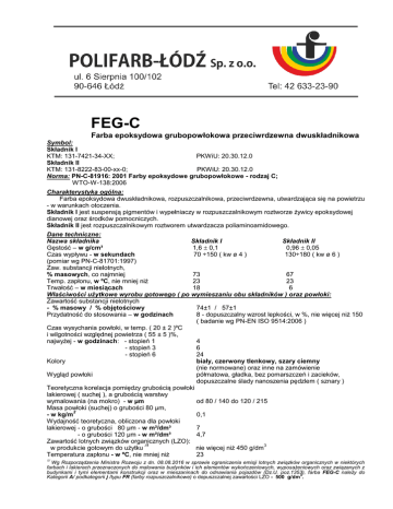 FEG-C Farba epoksydowa grubopowłokowa przeciwrdzewna dwuskładnikowa Symbol: Składnik I KTM: 131-7421-34-XX; PKWiU: 20.30.12.0 Składnik II KTM: 131-8222-83-00-xx-0; PKWiU: 20.30.12.0 Norma: PN-C-81916: 2001 Farby epoksydowe grubopowłokowe - rodzaj C; WTO-W-138:2006 Charakterystyka ogólna: Farba epoksydowa dwuskładnikowa, rozpuszczalnikowa, przeciwrdzewna, utwardzająca się na powietrzu - w warunkach otoczenia. Składnik I jest suspensją pigmentów i wypełniaczy w rozpuszczalnikowym roztworze żywicy epoksydowej dianowej oraz środków pomocniczych. Składnik II jest rozpuszczalnikowym roztworem utwardzacza poliaminoamidowego. Dane techniczne: Nazwa składnika Składnik I Składnik II Gęstość – w g/cm³ 1,6 0,1 0,96 0,05 Czas wypływu - w sekundach 70 ÷150 ( kw ø 4 ) 130÷180 ( kw ø 6 ) (pomiar wg PN-C-81701:1997) Zaw. substancji nielotnych, % masowych, co najmniej 73 67 Temp. zapłonu, w ºC, nie mniej niż 23 23 Trwałość – w miesiącach 18 6 Właściwości użytkowe wyrobu gotowego ( po wymieszaniu obu składników ) oraz powłoki: Zawartość substancji nielotnych - % masowy / % objętościowy 74±1 / 57±1 Przydatność do stosowania – w godzinach 8 - dopuszczalny wzrost lepkości, w %, nie więcej niż 150 ( badanie wg PN-EN ISO 9514:2006 ) Czas wysychania powłoki, w temp. ( 20 ± 2 )ºC i wilgotności względnej powietrza ( 55 ± 5 )%, najwyżej - w godzinach: - stopień 1 4 - stopień 3 6 - stopień 6 24 Kolory biały, czerwony tlenkowy, szary ciemny (nie normowane) oraz inne na zamówienie Wygląd powłoki półmatowa, gładka, bez pomarszczeń i zacieków, dopuszczalne ślady nanoszenia pędzlem ( sznary ) Teoretyczna korelacja pomiędzy grubością powłoki lakierowej ( suchej ), a grubością warstwy wymalowania (na mokro) - w µm od 80 / 140 do 120 / 215 Masa powłoki (suchej) o grubości 80 µm, 2 - w kg/m 0,1 Wydajność teoretyczna, obliczona dla powłoki lakierowej - o grubości 80 µm - w m²/dm³ 7 - o grubości 120 µm - w m²/dm³ 4,7 Zawartość lotnych związków organicznych (LZO): /1 3 w produkcie gotowym do użytku nie więcej niż 450 g/dm Temperatura zapłonu - w ºC, nie mniej niż 23 1/ Wg Rozporządzenia Ministra Rozwoju z dn. 08.08.2016 w sprawie ograniczenia emisji lotnych związków organicznych w niektórych farbach i lakierach przeznaczonych do malowania budynków i ich elementów wykończeniowych, wyposażeniowych oraz związanych z budynkami i tymi elementami konstrukcji oraz w mieszaninach do odnawiania pojazdów (Dz.U. poz.1353), farba FEG-C należy do Kategorii A/ podkategorii j /typu FR (farby rozpuszczalnikowe) o dopuszczalnej zawartości LZO - 500 g/dm3. Właściwości powłoki: Twarda, elastyczna, kryjąca, gładka, dobrze przyczepna do podłoża, o bardzo dobrych właściwościach antykorozyjnych. Posiada dobre właściwości mechaniczne oraz chemiczne, w tym jest odporna na działanie wody, rozpuszczalników, paliw płynnych oraz innych powszechnie występujących czynników korozyjnych. o o Może być eksploatowana w temperaturze od – 20 C do 130 C. Przeznaczenie: Do wykonywania grubopowłokowych zabezpieczeń antykorozyjnych konstrukcji stalowych, w tym ocynkowanych oraz przedmiotów wykonanych z żeliwa. Farba FEG-C może być nakładana w warstwach o grubości do 250 µm (na mokro). Środowisko: Powłoki farby FEG-C mogą być eksploatowane w środowisku przemysłowym, nadmorskim, miejskim, wiejskim, na zewnątrz i wewnątrz pomieszczeń, w atmosferze suchej i wilgotnej ( wg PN-EN ISO 129442:2001 - w atmosferze o kategorii korozyjności C2 ÷ C5-M ). Przygotowanie podłoża do malowania: Podłoże przeznaczone do malowania powinno być odtłuszczone, czyste i suche. 1 Podłoże surowe – niemalowane – stopień przygotowania powierzchni: co najmniej Sa 2 /2, wg PN-ISO 8501-1:1996 ( usunięta zgorzelina walcownicza, rdza i obce zanieczyszczenia ). Malowanie renowacyjne – powłokę umyć dokładnie wodą pod ciśnieniem, korzystnie z użyciem środków 1 powierzchniowo-czynnych. Stopień przygotowania powierzchni: co najmniej PSa 2 /2, dopuszczalny PSt 2 - wg PN-ISO 8501-2:1998 (nieusunięta silnie przylegająca powłoka lakierowa, usunięta zgorzelina walcownicza, rdza, słabo przyczepne powłoki lakierowe i obce zanieczyszczenia). Oczyszczone podłoże pomalować w czasie do 6 godzin, aby zapobiec wystąpieniu rdzy nalotowej. Warunki malowania: Warunki optymalne scharakteryzowane są w poniższej tabeli: Temperatura farby Temperatura podłoża Wilgotność wzgl. powietrza o o najwyżej 80 % 10 ÷ 30 C 5 ÷ 35 C o Temperatura podłoża powinna być wyższa od punktu rosy co najmniej o 3 C. Przygotowanie farby: Skład produktu gotowego ( do stosowania ): Składnik I Składnik II ( utwardzacz ) Razem: Skład objętościowy ( w częściach objętościowych ) 1,00 0,25 1,25 Skład masowy ( w częściach wagowych ) 1,00 0,15 1,15 Farba sprzedawana jest w kompletach, na które składają się: opakowanie ze składnikiem I oraz 1 lub 2 opakowania ze składnikiem II. Zawartości opakowań w kompletach odpowiada podanemu w tabeli składowi produktu gotowego, przy czym opakowania ze składnikiem I napełniane są do pojemności umożliwiającej dodanie potrzebnej ilości składnika II. Składnik I farby wymieszać w opakowaniu handlowym, dodać potrzebną ilość składnika II (utwardzacza ) i całość dokładnie wymieszać. Po 15 minutach, od czasu wymieszania obu składników, farba nadaje się do stosowana. Przydatność farby do stosowania w temperaturze 20ºC wynosi, co najmniej, 8 godzin, w temperaturach wyższych czas ten ulega skróceniu. Postępujący, w czasie stosowania farby, wzrost lepkości ( gęstnienie ) redukować poprzez sukcesywne jej rozcieńczanie. Stosowanie farby: Stosować 1÷2 warstw dla powłok gruntowych, 2÷3 warstw dla powłok samodzielnych. Kolejne warstwy farby nakładać w czasie od 5 godzin do 1 miesiąca. Sposób aplikacji: - pędzel lub wałek: rozcieńczenie 0 ÷ 10 % obj. - natrysk 