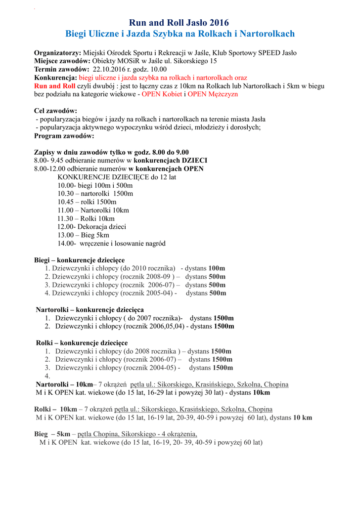 Run and Roll Jasło 2016 Biegi Uliczne i Jazda Szybka na Rolkach i Nartorolkach Organizatorzy: Miejski Ośrodek Sportu i Rekreacji w Jaśle, Klub Sportowy SPEED Jasło Miejsce zawodów: Obiekty MOSiR w Jaśle ul. Sikorskiego 15 Termin zawodów: 22.10.2016 r. godz. 10.00 Konkurencja: biegi uliczne i jazda szybka na rolkach i nartorolkach oraz Run and Roll czyli dwubój : jest to łączny czas z 10km na Rolkach lub Nartorolkach i 5km w biegu bez podziału na kategorie wiekowe - OPEN Kobiet i OPEN Mężczyzn Cel zawodów: - popularyzacja biegów i jazdy na rolkach i nartorolkach na terenie miasta Jasła - popularyzacja aktywnego wypoczynku wśród dzieci, młodzieży i dorosłych; Program zawodów: Zapisy w dniu zawodów tylko w godz. 8.00 do 9.00 8.00- 9.45 odbieranie numerów w konkurencjach DZIECI 8.00-12.00 odbieranie numerów w konkurencjach OPEN KONKURENCJE DZIECIĘCE do 12 lat 10.00- biegi 100m i 500m 10.30 – nartorolki 1500m 10.45 – rolki 1500m 11.00 – Nartorolki 10km 11.30 – Rolki 10km 12.00- Dekoracja dzieci 13.00 – Bieg 5km 14.00- wręczenie i losowanie nagród Biegi – konkurencje dziecięce 1. Dziewczynki i chłopcy (do 2010 rocznika) - dystans 100m 2. Dziewczynki i chłopcy (rocznik 2008-09 ) – dystans 500m 3. Dziewczynki i chłopcy (rocznik 2006-07) – dystans 500m 4. Dziewczynki i chłopcy (rocznik 2005-04) - dystans 500m Nartorolki – konkurencje dziecięca 1. Dziewczynki i chłopcy ( do 2007 rocznika)- dystans 1500m 2. Dziewczynki i chłopcy (rocznik 2006,05,04) - dystans 1500m Rolki – konkurencje dziecięce 1. Dziewczynki i chłopcy (do 2008 rocznika ) – dystans 1500m 2. Dziewczynki i chłopcy (rocznik 2006-07) – dystans 1500m 3. Dziewczynki i chłopcy (rocznik 2004-05) - dystans 1500m 4. Nartorolki – 10km– 7 okrążeń pętla ul.: Sikorskiego, Krasińskiego, Szkolna, Chopina M i K OPEN kat. wiekowe (do 15 lat, 16-29 lat i powyżej 30 lat) - dystans 10km Rolki – 10km – 7 okrążeń pętla ul.: Sikorskiego, Krasińskiego, Szkolna, Chopina M i K OPEN kat. wiekowe (do 15 lat, 16-19 lat, 20-39, 40-59 i powyżej 60 lat), dystans 10 km Bieg – 5km – pętla Chopina, Sikorskiego - 4 okrążenia, M i K OPEN kat. wiekowe (do 15 lat, 16-19, 20- 39, 40-59 i powyżej 60 lat) NAGRODY : BONY RZECZOWE O WARTOŚCI 3000zł w KONKURENCJACH OPEN - DWUBÓJ RUN and ROLL 10km + 5km (1m-300zł, 2m-200zł, 3m-100zł), - BIEG 5km KOBIETY i MĘŻCZYŹNI (1m-150zł, 2m-100zł, 3m-50zł), - ROLKI 10km KOBIETY i MĘŻCZYŹNI (1m-150zł, 2m-100zł, 3m-50zł), - NARTOROLKI 10km KOBIETY i MĘŻCZYŹNI (1m-150zł, 2m-100zł, 3m-50zł). • LOSOWANIE NAGRÓD wśród wszystkich startujących. • SPECJALNE NAGRODY dla najmłodszych i najstarszych uczestników. • W konkurencjach dziecięcych wszyscy otrzymują dyplom, a zwycięzcy medale • W biegach OPEN wszyscy otrzymują pamiątkowy medal, zwycięzcy puchary, a w kategoriach wiekowych specjalne upominki. OPŁATY STARTOWE • konkurencje dziecięce - za 1 start 5 zł do 30.09.2016r., po tym terminie dodatkowo 5zł • KONKURENCJE OPEN – • 30zł, - druga konkurencja 10zł – wpłata do 30.09.2016r.,po tym terminie dodatkowo 20zł. Zniżka 50% dotyczy zgłoszenia w Konkurencjach OPEN dla: • zawodników z klubów sportowych lub szkół ( minimum 10 osób) • - dzieci i młodzieży do 17 roku życia • - emerytów i rencistów UWAGA: OPŁATA STARTOWA zawiera: CHIP Startowy – do zwrotu po biegu, bon na posiłek i jeden LOS na LOTERIĘ RZECZOWĄ – bez względu na ilość startów. ZGŁOSZENIA • Na stronie www.domtel-sport.pl do 20.10.2016r. lub w dniu zawodów do godz. 9.00 • Zgłoszenie powinno zawierać imię, nazwisko, rok urodzenia oraz konkurencję. • Dodatkowe informacje: organizator tel. 606 267 207 lub rejestracja tel. 664 941100 POZOSTAŁE POSTANOWIENIA 1. Organizator zastrzega sobie możliwość zmian w regulaminie o czym poinformuje uczestników przed startem. 2.W przypadku różnicy zdań rozstrzygające stanowisko podejmuje Sędzia Główny i Organizator. 3.Protesty do Sędziego głównego można składać do 15min po ogłoszeniu wyników(kaucja 20zł). 4. Organizator nie pokrywa kosztów dojazdu, noclegów i ubezpieczenia NNW. 5. W wyścigach na rolkach i nartorolkach obowiązują kaski ochronne. 6. Każdy uczestnik biorąc udział w zawodach zobowiązuje się, że startuje na własną odpowiedzialność i automatycznie wyraża zgodę na przetwarzanie danych osobowych. Osoby niepełnoletnie obowiązkowo muszą posiadać zgodę rodziców (opiekunów). 7.Zawody odbędą się bez względu na warunki atmosferyczne z wyłączeniem klęsk żywiołowych.