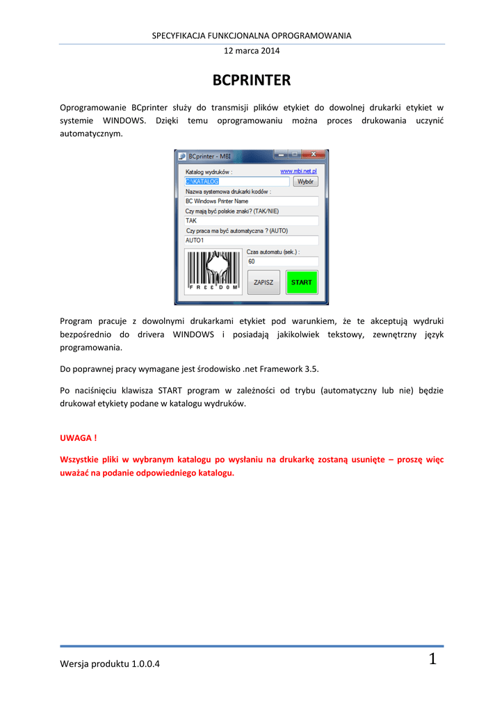 SPECYFIKACJA FUNKCJONALNA OPROGRAMOWANIA 12 marca 2014 BCPRINTER Oprogramowanie BCprinter służy do transmisji plików etykiet do dowolnej drukarki etykiet w systemie WINDOWS. Dzięki temu oprogramowaniu można proces drukowania uczynić automatycznym. Program pracuje z dowolnymi drukarkami etykiet pod warunkiem, że te akceptują wydruki bezpośrednio do drivera WINDOWS i posiadają jakikolwiek tekstowy, zewnętrzny język programowania. Do poprawnej pracy wymagane jest środowisko .net Framework 3.5. Po naciśnięciu klawisza START program w zależności od trybu (automatyczny lub nie) będzie drukował etykiety podane w katalogu wydruków. UWAGA ! Wszystkie pliki w wybranym katalogu po wysłaniu na drukarkę zostaną usunięte – proszę więc uważać na podanie odpowiedniego katalogu. Wersja produktu 1.0.0.4 1 SPECYFIKACJA FUNKCJONALNA OPROGRAMOWANIA 12 marca 2014 1. KONFIGURACJA PROGRAMU Ustawienia konfiguracyjne programu dostępne są dla użytkownika. Katalog wydruków – katalog, gdzie będą umieszczane wydruki etykiet Nazwa systemowa drukarki kodów – nazwa systemowa drukarki kodów kreskowych Czy mają być polskie znaki ? – TAK lub NIE Czy praca ma być automatyczna ? – przy użyciu słowa AUTO program będzie od razu uruchamiał się i minimalizował do paska zadań Czas automatu – czas interwału czasowego pomiędzy kolejnym sprawdzeniem zawartości katalogu do druku – podawany w sekundach. Aby program działał poprawnie użytkownik musi mieć prawa zapis/odczyt w katalogu pracy programu. Ustawienia niewidoczne z poziomu formatki programu Program pozwala na przekształcenia wydruków do innej strony kodowej – należy w pliku .EXE.CONFIG wpisać odpowiednią daną w wartościach odpowiednio PS_CODEPAGE 2. INFORMACJE DODATKOWE Wszelkie inne informacje dodatkowe dotyczące wersji oprogramowania można uzyskać klikając na link MBI. Wersja produktu 1.0.0.4 2