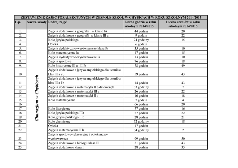 Gimnazjum w Chybicach ZESTAWIENIE ZAJĘĆ POZALEKCYJNYCH W ZESPOLE SZKÓŁ W CHYBICACH W ROKU SZKOLNYM 2014/2015 L.p. Nazwa szkoły Rodzaj zajęć Liczba godzin w roku Liczba uczniów w roku szkolnym 2014/2015 szkolnym 2014/2015 Zajęcia dodatkowe z geografii w klasie IA 1. 44 godzin 20 Zajęcia dodatkowe z geografii w klasie III a 2. 9 godzin 22 Koło języka polskiego 3. 74 godziny 15 Opieka 4. 6 godzin Zajęcia dydaktyczno-wyrównawcze klasa Ib 5. 35 godzin 10 Koło matematyczne Ia 6. 17 godzin 15 Zajęcia dydaktyczno-wyrównawcze Ia 7. 13 godzin 10 Zajęcia sportowe 8. 76 godzin 18 Koło historyczne III a i III b 9. 78 godzin 49 Zajęcia dodatkowe z języka angielskiego dla uczniów klas III a i b 10. 59 godzin 43 Zajęcia dodatkowe z języka angielskiego dla uczniów klas III a i b 11. 14 godzin 43 Zajęcia dodatkowe z matematyki II b dziewczęta 12. 33 godziny 7 Zajęcia dodatkowe z matematyki III a 13. 26 godzin 22 Zajęcia dodatkowe z matematyki II a 14. 16 godzin 18 Koło matematyczne 15. 7 godzin 4 16. 66 godzin 20 Koło liturgiczne 17. 77 godzin 16 Koło języka polskiego IIIa 18. 27 godzin 22 Koło języka polskiego IIIb 19. 28 godzin 21 Koło chemiczne 20. 72 godziny 18 Opieka 21. 17 godzin Zajęcia matematyczne II b 22. 34 godziny 2 Zajęcia sportowo-rekreacyjne i opiekuńczowychowawcze 23. 99 godzin 50 Zajęcia dodatkowe z biologii klasa III 24. 51 godzin 43 Zajęcia dodatkowe klasa I 25. 28 godzin 35 Opieka Zajęcia dodatkowe z języka niemieckiego Opieka RAZEM 26. 27. 28. 32 godziny 68 godzin 12 godzin 1118 godzin 19 542 Szkoła Podstawowa w Chybicach ZESTAWIENIE ZAJĘĆ POZALEKCYJNYCH W ZESPOLE SZKÓŁ W CHYBICACH W ROKU SZKOLNYM 2014/2015 Lp. Nazwa szkoły Rodzaj zajęć Liczba godzin w roku Liczba uczniów w roku szkolnym 2014/2015 szkolnym 2014/2015 Zajęcia dodatkowe z przyrody w klasie VIa 1. 25 godzin 15 Opieka 2. 3 godziny Zajęcia sportowe w klasie VIb 3. 31 godzin 9 Opieka 4. 9 godzin Zajęcia dydaktyczno-wyrównawcze z matematyki klasa VIb 5. 30 godzin 15 Zajęcia artystyczne i zajęcia wyrównawcze 6. 77 godzin 19 Zajęcia logopedyczne 7. 42 godziny 39 Zajęcia plastyczne i wyrównawcze 8. 81 godzin 9 Zajęcia dodatkowe z matematyki 9. 77 godzin 16 Koło biblioteczne 10. 56 godzin 12 Zajęcia dodatkowe i zajęcia wyrównawcze 11. 81 godzin 19 Zajęcia sportowe 12. 59 godzin 20 Zajęcia logopedyczne 13. 42 godziny 66 Zajęcia dodatkowe z języka niemieckiego klasa IV a 14. 34 godziny 14 Zajęcia dodatkowe z języka niemieckiego klasa V 15. 40 godzin 10 Zajęcia dodatkowe z języka angielskiego klasa III 16. 36 godzin 12 Zajęcia dodatkowe z języka angielskiego klasa IV a 17. 37 godzin 12 Opieka 18. 5 godzin Zajęcia opiekuńczo-wychowawcze 19. 90 godzin 5 Zajęcia korekcyjno-kompensacyjne 20. 88 godzin 17 Zajęcia dodatkowe z religii 21. 69 godzin 37 Opieka 22. 7 godzin Szkoła Podstawo 23. 24. 25. 26. 27. 28. 29. 30. 31. 32. 33. 34. Karta rowerowa Opieka Zajęcia dodatkowe Opieka Koło języka polskiego klasa VI a Koło języka polskiego klasa VI b Język polski klasa V Język polski IV b Zajęcia wyrównawcze Zajęcia dodatkowe z matematyki klasa IV a opieka Zajęcia zwiększające szansę edukacyjną uczniów Zajęcia dodatkowe z języka angielskiego w klasie VI Zajęcia integracyjne. ruchowe i zajęcia plastyczne RAZEM 35. 50 godzin 40 godzin 73 godziny 10 godzin 25 godzin 12 godzin 46 godzin 39 godzin 76 godzin 34 godziny 16 godzin 72 godzin 23 83 76 1 671 godzin 30 7 537 18 16 15 18 17 19 1 27 Szkoła Podstawowa Filia Grabków ZESTAWIENIE ZAJĘĆ POZALEKCYJNYCH W ZESPOLE SZKÓŁ W CHYBICACH W ROKU SZKOLNYM 2014/2015 Lp. Nazwa szkoły Rodzaj zajęć Liczba godzin w roku Liczba uczniów w roku szkolnym 2014/2015 szkolnym 2014/2015 Bawimy i uczymy się – zabawy edukacyjne 1. 58 godzin 6 Koło odkrywców – gry i zabawy edukacyjne 2. 57 godzin 24 English is fun – zajęcia wspomagające naukę języka angielskiego 3. 34 godziny 12 Chcę wiedzieć więcej 4. 46 godzin 6 Gry i zabawy ogólnorozwojowe „Klub Maluchy” 5. 25 godzin 12 Gry i zabawy edukacyjne i bilioterapeutyczne 6. 24 godziny 10 Niemiecki dla dzieci 7. 9,5 godziny 7 RAZEM 253,5 godziny 77 ZESTAWIENIE ZAJĘĆ POZALEKCYJNYCH W SZKOŁACH W ROKU SZKOLNYM 2014/2015 1. 2. 3. 4. Nazwa szkoły Rodzaj zajęć Szkoła Podstawowa Filia Bostów Lp. Zajęcia dydaktyczne, wyrównawcze i opiekuńcze, koło wokalno-taneczne Zajęcia teatralne (artystyczne) Zajęcia dydaktyczno-wyrównawcze Klasa I Niemiecki dla dzieci RAZEM Liczba godzin w roku szkolnym 2014/2015 Liczba uczniów w roku szkolnym 2014/2015 80 godzin 32 godziny 49 godzin 9 godzin 170 godzin 19 11 21 8 59