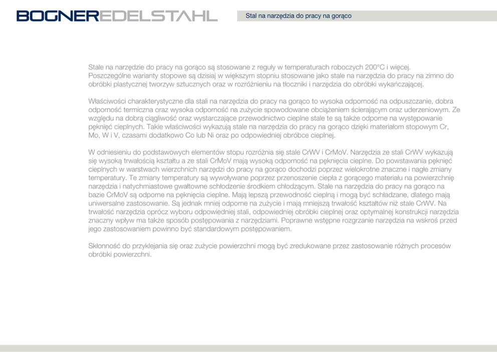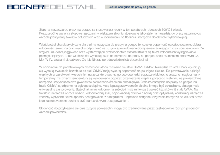 Stal na narzędzia do pracy na gorąco Stale na narzędzie do pracy na gorąco są stosowane z reguły w temperaturach roboczych 200°C i więcej. Poszczególne warianty stopowe są dzisiaj w większym stopniu stosowane jako stale na narzędzia do pracy na zimno do obróbki plastycznej tworzyw sztucznych oraz w rozróżnieniu na tłoczniki i narzędzia do obróbki wykańczającej. Właściwości charakterystyczne dla stali na narzędzia do pracy na gorąco to wysoka odporność na odpuszczanie, dobra odporność termiczna oraz wysoka odporność na zużycie spowodowane obciążeniem ścierającym oraz uderzeniowym. Ze względu na dobrą ciągliwość oraz wystarczające przewodnictwo cieplne stale te są także odporne na występowanie pęknięć cieplnych. Takie właściwości wykazują stale na narzędzia do pracy na gorąco dzięki materiałom stopowym Cr, Mo, W i V, czasami dodatkowo Co lub Ni oraz po odpowiedniej obróbce cieplnej. W odniesieniu do podstawowych elementów stopu rozróżnia się stale CrWV i CrMoV. Narzędzia ze stali CrWV wykazują się wysoką trwałością kształtu a ze stali CrMoV mają wysoką odporność na pęknięcia cieplne. Do powstawania pęknięć cieplnych w warstwach wierzchnich narzędzi do pracy na gorąco dochodzi poprzez wielokrotne znaczne i nagłe zmiany temperatury. Te zmiany temperatury są wywoływane poprzez przenoszenie ciepła z gorącego materiału na powierzchnię narzędzia i natychmiastowe gwałtowne schłodzenie środkiem chłodzącym. Stale na narzędzia do pracy na gorąco na bazie CrMoV są odporne na pęknięcia cieplne. Mają lepszą przewodność cieplną i mogą być schładzane, dlatego mają uniwersalne zastosowanie. Są jednak mniej odporne na zużycie i mają mniejszą trwałość kształtów niż stale CrWV. Na trwałość narzędzia oprócz wyboru odpowiedniej stali, odpowiedniej obróbki cieplnej oraz optymalnej konstrukcji narzędzia znaczny wpływ ma także sposób postępowania z narzędziami. Poprawne wstępne rozgrzanie narzędzia na wskroś przed jego zastosowaniem powinno być standardowym postępowaniem. Skłonność do przyklejania się oraz zużycie powierzchni mogą być zredukowane przez zastosowanie różnych procesów obróbki powierzchni.