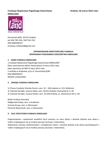 Fundacja Wspierania Pogodnego Dzieciństwa MIKOLAND Kraków, 18 marca 2013 roku www.mikoland.pl Poznańska 8/82, 30-012 Kraków tel: 602 705 356 / 607 925 254 KRS 0000428237 [email protected] SPRAWOZDANIE MERYTORYCZNE FUNDACJI WSPIERANIA POGODNEGO DZIECIŃSTWA MIKOLAND 1. DANE FUNDACJI MIKOLAND „Fundacja Wspierania Pogodnego Dzieciństwa MIKOLAND” Data ustanowienia Aktem Notarialnym 9 marca 2012 roku. Data rejestracji do KRS 31 lipca 2012 roku, Z siedzibą w Krakowie, przy ul. Poznańskiej 8/82 KRS 0000428237 REGON 1226234459 2. ZARZĄD FUNDACJI MIKOLAND 1/ Prezes Fundacji: Monika Osuch, zam. 32 – 340 Łobzów nr 119, Wolbrom. 2/ Członek Zarządu: Joanna Kalita, zam. 30-012 Kraków, Poznańska 8 m. 82 3/ Członek Zarządu: Justyna Kesler, zam. 32-636 Kraków, os. Oświecenia 56 m. 58 Radę Fundacji stanowią: Małgorzata Kulpa, zam. w Krakowie Urszula Grupa, zam. w Warszawie Dominik Wojcieszek, zam. w Warszawie 3. CELE STATUTOWE FUNDACJI MIKOLAND Organizowanie i wspieranie wszelkich form pomocy na rzecz dzieci z domów dziecka oraz dzieci z rodzin znajdujących się w trudnej sytuacji życiowej i materialnej. Wspieranie rozwoju zainteresowań i umiejętności dzieci z domów dziecka oraz dzieci pochodzących z rodzin znajdujących się w trudnej sytuacji życiowej i materialnej. Przeciwdziałanie patologiom i uzależnieniom wśród dzieci i młodzieży. Organizowanie i wspieranie lokalnych, ogólnokrajowych i międzynarodowych akcji na rzecz pomocy dzieciom. Prowadzenie działalności w zakresie pomocy społecznej na rzecz osób znajdujących się w trudnej sytuacji życiowej, której nie są one w stanie pokonać, wykorzystując własne uprawnienia, zasoby i możliwości. Działalność na rzecz rozwoju i ochrony praw dziecka. 4. ZASADY, FORMY I ZAKRES DZIAŁALNOŚCI STATUTOWEJ Z PODANIEM REALIZACJI CELÓW STATUTOWYCH, A TAKŻE OPIS GŁÓWNYCH ZDARZEŃ PRAWNYCH W JEJ DZIAŁALNOŚCI O SKUTKACH FINANSOWYCH. FUNDACJA MIKOLAND REALIZUJE SWOJE CELE STATUTOWE W SZCZEGÓLNOŚCI POPRZEZ: dofinansowywanie domów dziecka, wsparcie rzeczowe, merytoryczne i organizacyjne domów dziecka, finansowanie zakupu podręczników, książek, zeszytów oraz innych materiałów dydaktycznych, organizowanie kursów językowych, organizowanie indywidualnych i grupowych spotkań z psychologiem, fundowanie stypendiów dla dzieci i młodzieży szczególnie uzdolnionej, organizowanie konkursów i koncertów dla dzieci i młodzieży szczególnie uzdolnionej, organizowanie zajęć i kursów oświatowo-kulturowych, zajęć naukowych, zajęć sportowych oraz tworzenie kół i klubów zainteresowań, finansowanie materiałów dydaktycznych niezbędnych do rozwoju dzieci, finansowanie i organizowanie wszelkiej niezbędnej dla życia, zdrowia i prawidłowego rozwoju opieki medycznej – w tym finansowanie i organizowanie profilaktyczno-kontrolnych badań okresowych, finansowanie i organizowanie leczenia dzieci chorych – w tym leczenia szpitalnego i dentystycznego, finansowanie i organizowanie pomocy dzieciom niepełnosprawnym, organizowanie imprez charytatywnych oraz imprez sportowych, kulturalnych i artystycznych organizowanie koncertów, biesiad, festynów i spotkań, wyjazdów wakacyjnych, obozów wędrownych i sportowych, upowszechnianie profilaktyki medycznej w domach dziecka – także poprzez organizowanie szkoleń i spotkań, finansowanie i organizowanie leczenia dzieci i młodzieży uzależnionej od alkoholu i narkotyków. organizowanie zbiórek publicznych, organizowanie wykładów i spotkać ze specjalistami i autorytetami z zakresu nauki, kultury, sportu, współpracę z instytucjami i urzędami zajmującymi się nauką, edukacją, oświatą, zdrowiem, opieką społeczną, przeciwdziałaniem patologiom i innymi sprawami związanymi z rozwojem dzieci i młodzieży- zarówno na szczeblu krajowym jak i samorządowym, finansowanie zakupu zabawek oraz odzieży, pozyskiwanie sponsorów finansujących domy dziecka i dzieci pochodzące z rodzin w trudnej sytuacji życiowej i materialnej, zbiórki odzieży i zabawek, propagowanie integracji dzieci zdrowych z dziećmi niepełnosprawnym, przyznawanie świadczeń z zakresu pomocy społecznej, w szczególności przyjmujących formę zakupu na rzecz potrzebujących leków, materiałów medycznych, potrzebnych zabiegów opiekuńczo-rehabilitacyjnych u podmiotów trzecich zawodowo trudniących się dostarczaniem takich świadczeńlub refundowanie kosztów takich świadczeń. 2012 rok był pierwszym rokiem działań Fundacji Mikoland, powołanej 9 marca 2012 roku aktem Notarialnym w Krakowie. Przeważającą część tego roku założyciele Fundacji poświęcili na tworzenie struktury Organizacji. Zarząd w pierwszej kolejności powołał Radę Fundacji oraz stworzył Statut Fundacji. Podjęto też decyzję o utworzeniu strony internetowej: www.mikoland.pl (w momencie sporządzania sprawozdanie strona jeszcze w budowie) oraz funpage na facebooku: http://www.facebook.com/FundacjaMikoland. Księgi rachunkowe oraz rozliczenia podatkowe Fundacji prowadzone są przez profesjonalne biuro księgowe – ALABRI Sp. z o.o., z siedzibą w Warszawie, ul. Świętojerska 5/7, na podstawie umowy o prowadzenie ksiąg handlowych zawartej dnia 20 stycznia 2013 r. W dalszej kolejności Zarząd podjął decyzję o rozpoczęciu działalności gospodarczej w celu pozyskania środków na realizację celów statutowych. 5. INFORMACJA O PROWADZONEJ DZIAŁALNOŚCI GOSPODARCZEJ WG WPISU DO REJESTRU PRZEDSIĘBIORCÓW KRAJOWEGO REJESTRU SĄDOWEGO Zgodnie z wpisem do Rejestru Przedsiębiorców Krajowego Rejestru Sądowego przedmiotem działalności gospodarczej prowadzonej przez Fundację jest: 47.19.Z - Pozostała sprzedaż detaliczna prowadzona w niewyspecjalizowanych sklepach 47.61.Z - Sprzedaż detaliczna książek prowadzona w wyspecjalizowanych sklepach 47.62.Z - Sprzedaż detaliczna gazet i artykułów piśmiennych prowadzona w wyspecjalizowanych sklepach 47.63.Z - Sprzedaż detaliczna nagr