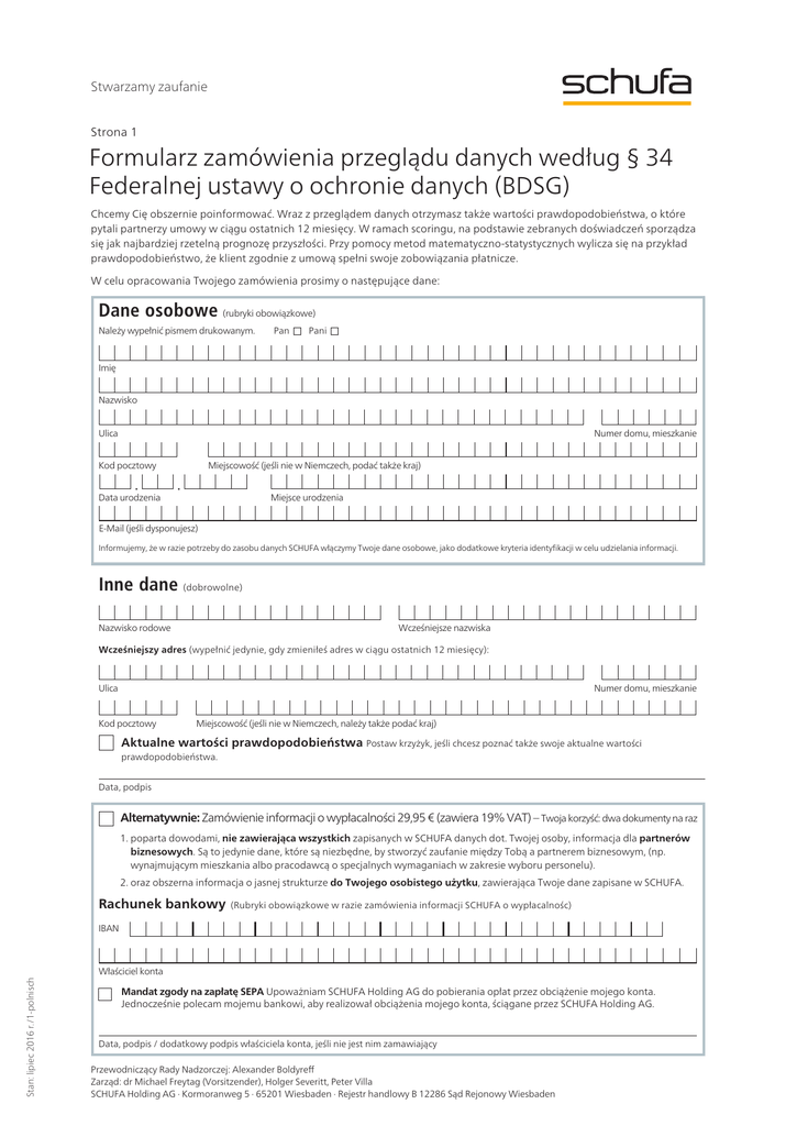 Stwarzamy zaufanie Strona 1 Formularz zamówienia przeglądu danych według § 34 Federalnej ustawy o ochronie danych (BDSG) Chcemy Cię obszernie poinformować. Wraz z przeglądem danych otrzymasz także wartości prawdopodobieństwa, o które pytali partnerzy umowy w ciągu ostatnich 12 miesięcy. W ramach scoringu, na podstawie zebranych doświadczeń sporządza się jak najbardziej rzetelną prognozę przyszłości. Przy pomocy metod matematyczno-statystycznych wylicza się na przykład prawdopodobieństwo, że klient zgodnie z umową spełni swoje zobowiązania płatnicze. W celu opracowania Twojego zamówienia prosimy o następujące dane: Dane osobowe (rubryki obowiązkowe) Należy wypełnić pismem drukowanym. Pan Pani Imię Nazwisko Ulica Numer domu, mieszkanie Kod pocztowy Miejscowość (jeśli nie w Niemczech, podać także kraj) Data urodzenia Miejsce urodzenia E-Mail (jeśli dysponujesz) Informujemy, że w razie potrzeby do zasobu danych SCHUFA włączymy Twoje dane osobowe, jako dodatkowe kryteria identyfikacji w celu udzielania informacji. Inne dane (dobrowolne) Nazwisko rodowe Wcześniejsze nazwiska Wcześniejszy adres (wypełnić jedynie, gdy zmieniłeś adres w ciągu ostatnich 12 miesięcy): Ulica Numer domu, mieszkanie Kod pocztowy Miejscowość (jeśli nie w Niemczech, należy także podać kraj) Aktualne wartości prawdopodobieństwa Postaw krzyżyk, jeśli chcesz poznać także swoje aktualne wartości prawdopodobieństwa. Data, podpis Alternatywnie: Zamówienie informacji o wypłacalności 29,95 € (zawiera 19% VAT) – Twoja korzyść: dwa dokumenty na raz 1. poparta dowodami, nie zawierająca wszystkich zapisanych w SCHUFA danych dot. Twojej osoby, informacja dla partnerów biznesowych. Są to jedynie dane, które są niezbędne, by stworzyć zaufanie między Tobą a partnerem biznesowym, (np. wynajmującym mieszkania albo pracodawcą o specjalnych wymaganiach w zakresie wyboru personelu). 2. oraz obszerna informacja o jasnej strukturze do Twojego osobistego użytku, zawierająca Twoje dane zapisane w SCHUFA. Rachunek bankowy (Rubryki obowiązkowe w razie zamówienia informacji SCHUFA o wypłacalnośc) IBAN Stan: lipiec 2016 r./1-polnisch Właściciel konta Mandat zgody na zapłatę SEPA Upoważniam SCHUFA Holding AG do pobierania opłat przez obciążenie mojego konta. Jednocześnie polecam mojemu bankowi, aby realizował obciążenia mojego konta, ściągane przez SCHUFA Holding AG. Data, podpis / dodatkowy podpis właściciela konta, jeśli nie jest nim zamawiający Przewodniczący Rady Nadzorczej: Alexander Boldyreff Zarząd: dr Michael Freytag (Vorsitzender), Holger Severitt, Peter Villa SCHUFA Holding AG · Kormoranweg 5 · 65201 Wiesbaden · Rejestr handlowy B 12286 Sąd Rejonowy Wiesbaden Stwarzamy zaufanie Strona 2 formularza zamówienia przeglądu danych według § 34 Federalnej ustawy o ochronie danych (BDSG) Informacje o formularzu zamówienia 1 Wypełnić formularz w pełni 2 Skopiować i załączyć dokumenty tożsamości Abyśmy mogli Cię jednoznacznie zidentyfikować, do zamówienia prosimy dołączyć czytelną, dwustronną kopię swojego dokumentu tożsamości. Z kopii muszą wyraźnie wynikać imię/imiona i nazwisko, kompletny adres, data i miejsce urodzenia. Wszystkie pozostałe dane i fotografia mogą być zaczernione. Pomożesz nam w ten sposób uniknąć dodatkowych zapytań, co przyspieszy realizację zamówienia. Obywatele niemieccy ALBO Kopia dowodu osobistego ALBO kopia paszportu oraz kopia potwierdzenia zameldowania 3 3 Obywatele innych państw Kopia paszportu WRAZ z kopią potwierdzenia zameldowania Formularz i dokumenty należy wysłać pocztą Formularz zamówienia wraz z kopiami dokumentów tożsamości należy, po naklejeniu znaczków o właściwej wartości, wysłać pod adresem: Znaczek pocztowy Nadawca Imię Nazwisko Ulica Numer domu, mieszkanie Kod pocztowy Miejscowość SCHUFA Holding AG Postfach 10 25 66 D 44725 Bochum Wskazówka o mandacie zgody na zapłatę SEPA przy alternatywnym zamówieniu informacji SCHUFA o wypłacalności: W terminie ośmiu tygodni począwszy od daty obciążenia konta możesz zażądać zwrotu ściągniętej kwoty. Obowiązują przy tym warunki uzgodnione z Twoim bankiem. Numer referencyjny upoważnienia zostanie przekazany odrębnie. Stan: lipiec 2016 r./1-polnisch SCHUFA Holding AG, Kormoranweg 5, D 65201 Wiesbaden Numer identyfikacyjny wierzyciela DE87ZZZ00000239351