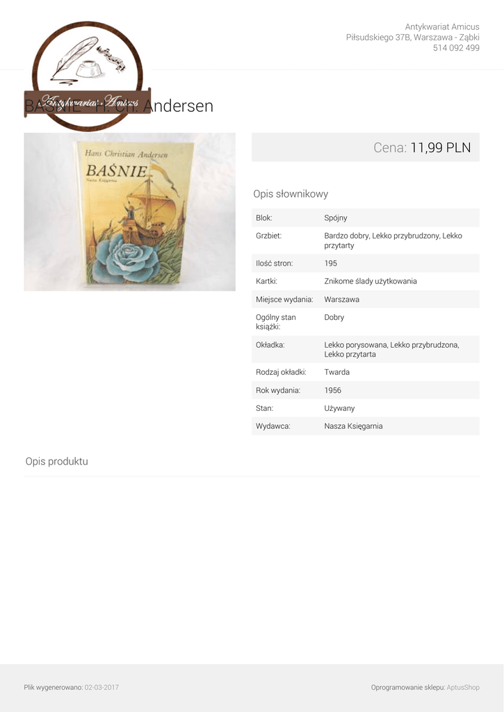 Antykwariat Amicus Piłsudskiego 37B, Warszawa - Ząbki 514 092 499 BAŚNIE - H. Ch. Andersen Cena: 11,99 PLN Opis słownikowy Blok: Spójny Grzbiet: Bardzo dobry, Lekko przybrudzony, Lekko przytarty Ilość stron: 195 Kartki: Znikome ślady użytkowania Miejsce wydania: Warszawa Ogólny stan książki: Dobry Okładka: Lekko porysowana, Lekko przybrudzona, Lekko przytarta Rodzaj okładki: Twarda Rok wydania: 1956 Stan: Używany Wydawca: Nasza Księgarnia Opis produktu Plik wygenerowano: 02-03-2017 Oprogramowanie sklepu: AptusShop Antykwariat Amicus Piłsudskiego 37B, Warszawa - Ząbki 514 092 499 Galeria Plik wygenerowano: 02-03-2017 Powered by TCPDF (www.tcpdf.org) Oprogramowanie sklepu: AptusShop