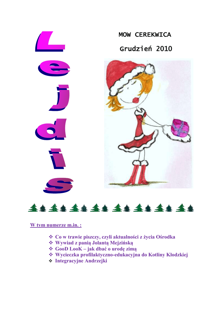 MOW CEREKWICA Grudzień 2010 W tym numerze m.in. : Co w trawie piszczy, czyli aktualności z życia Ośrodka Wywiad z panią Jolantą Mejzińską GooD LooK – jak dbać o urodę zimą Wycieczka profilaktyczno-edukacyjna do Kotliny Kłodzkiej Integracyjne Andrzejki „To właśnie tego wieczoru, gdy mróz lśni jak gwiazda na dworze, przy stołach są miejsca dla obcych bo nikt być samotny nie może”. Niech radość Świąt Bożego Narodzenia towarzyszy wszystkim przez Nowy Rok. Życzymy, aby był to Rok szczęśliwy w osobiste doznania, spełnił zamierzenia i dążenia zawodowe oraz by przyniósł wiele satysfakcji z własnych dokonań. Ten numer „Lejdis” zredagował zespól w składzie: Martyna Cz., Małgosia Ś., Beata S., Edyta Sz., Natalia M., pomocą i wparciem służyły panie: Ola Plucińska i Renata Plewińska Konkurs pieczenia rogali marcińskich 12 listopada odbył się coroczny konkurs pieczenia "Rogali świętomarcińskich", w trakcie którego dziewczyny rywalizowały między sobą o to, która wypiecze najsmaczniejsze rogale. Cztery równorzędne I miejsca zdobyły: Ewa P., Angelika L., Paulina G., Paulina D. Trzy równorzędne II miejsca zajęły: Anna W., Aśka R., Sara D. Trzecie miejsce zdobyły: Marlena, Natalia M., Sonia K. Wszystkie rogale były wyśmienite, a ich smak pozostanie do przyszłego roku! Jesienny bieg przełajowy 21 listopada odbył się bieg na dystansie 1800m zorganizowany jak co roku o tej porze z okazji Święta Odzyskania Niepodległości. Nagrodę główną - puchar przechodni Dyrektora Ośrodka zdobyła grupa I. W klasyfikacji indywidualnej tegorocznego przełaju zwyciężyła Natalia M., II miejsce zajęła Angelika , III Paulina D. Wizyta Studentów z Dolnośląskiej Szkoły Wyższej we Wrocławiu 25 listopada nasz Ośrodek gościł studentów z Dolnośląskiej Szkoły Wyższej we Wrocławiu. Przeszło dwudziestoosobowa grupa pod kierunkiem Pani mgr Jolanty Wierzbanowskiej Olejniczak poznawała tajniki pracy resocjalizacyjnej w praktyce. Studenci uczestniczyli w zajęciach popołudniowych i wieczornych w internacie, przygotowali ciekawe propozycje spędzenia czasu wolnego, aranżując zabawy, konkursy, a przede wszystkim miłą i serdeczną atmosferę. Odwiedziny Klubu Kobiet Aktywnych 29 listopada Ośrodek nasz odwiedziły członkinie Klubu Kobiet Aktywnych. Panie: Wiesława Biegun, Bernadeta Łuczak, Aleksandra Fischbach, Mariola Borusiak, Małgorzata Stankiewicz i Teresa Tyrakowska. Panie obejrzały program artystyczny przygotowany przez grupę teatralną. Następnie opowiedziały, jak doszły do tego, że kierują obecnie dużymi firmami, jak osiągnęły sukces, oraz co jest w ich życiu najważniejsze. Goście byli mile zaskoczeni atmosferą panującą w naszej placówce i obiecały, że chętnie tu jeszcze przyjadą. Dnia 9 listopada o godzinie 5:00 wyjechałyśmy na wycieczkę profilaktycznoedukacyjną do Srebnej Góry. Po przyjeździe na miejsce udałyśmy się do pomieszczenia, gdzie znajdowała się ściana skalna, na którą próbowałyśmy się wspinać. Następnie po smacznym obiedzie miałyśmy okazję zwiedzić Jaskinię Niedźwiedzią w Kletnie. Około godz. 17:00 dojechałyśmy do naszego pensjonatu w Radkowie, gdzie czekała na nas kolacja i ciepły prysznic. Drugiego dnia po śniadaniu spacerowałyśmy po „ Błędnych skałach” w Kłodzku. Po tej atrakcji zwiedzałyśmy kaplicę czaszek w Czermnie. Popołudnie było pełne wrażeń i strachu. Wychowawcy zafundowali nam ćwiczenia sprawnościowe w parku linowym. Każda z nas mogła pokonać swoje słabości. Po dniu pełnym wrażeń udałyśmy się na basen rekreacyjny w Kudowie. Dnia trzeciego po zjedzonym śniadaniu pojechałyśmy do Polanicy Zdrój, gdzie spacerowałyśmy po Parku Zdrojowym i kosztowałyśmy wód zdrojowych, które podobno mają moc uzdrawiającą. Podczas wizyty w Kłodzku zwiedzałyśmy labirynt i salę tortur. Ostatnią atrakcją wycieczki była kopalnia złota w Złotym Stoku. Późnym wieczorem, po trzech dniach niesamowitych przeżyć wróciłyśmy do Ośrodka. Integracyjne Andrzejki 30 listopada wspólnie z młodzieżą i dziećmi pobliskich wsi - Cerekwicy Starej, Cerekwicy Nowej i Poręby bawiłyśmy się na andrzejkowej zabawie. Otwarcia pierwszego integracyjnego spotkania dokonała pani wicedyrektor Ośrodka Małgorzata Grenda, następnie grupa teatralna przedstawieniem pt. "Sfrustrowana nauczycielka" rozpoczęła magiczną część wieczoru. Wielkim zainteresowaniem cieszyły się tradycyjne wróżby, z których korzystała zarówno młodzież, opiekunowie jak i zaproszeni goście. Koledzy z Koła Młodzieży Wiejskiej przygotowali dyskotekę andrzejkową, podczas której tańce przeplatane były licznymi zabawnymi konkursami. Utracone kalorie podczas wspaniałej zabawy uczestnicy mogli uzupełnić upieczonymi przez nas rogalikami. Świąteczna lista przebojów Świąteczny czas to mozaika doznań smakowych, węchowych, wzrokowych i słuchowych. Jednak zanim jeszcze zacznie pachnieć piernikami i smażonym karpiem, świąteczny nastrój, przedświąteczne pielgrzymki do centrów handlowych i czas spędzony w większych niż o każdej innej porze roku, korkach - umilają niezapomniane i co roku niezmienne bożonarodzeniowe piosenki. Specjalnie dla Was przygotowałyśmy unikalną listę świątecznych przebojów: 1. Wham – Last Christmas 2. Edyta Górniak – Pada śnieg 3. Gosia Andrzejewicz – Magia świąt 4. Lady Pank – Święta, święta 5. Verba – Ten czas 6. Czerwone Gitary – Jest taki dzień 7. Leona Lewis – White Christmas 8. De Su – Kto wie czy za rogiem 9. Cascada – Last Christmas 10. Ania Szarmach – Coraz bliżej święta ….. do Pani Jolanty Mejzińskiej 1. Jestem ….. jaką mnie znacie 2. Przyjaciel ……. to ktoś, na kim można polegać, któremu można zaufać 3. Sposób na nudę …… rzadko się nudzę, a jeśli już to dobra książka, film, długi spacer 4. Wymarzone wakacje ….. podróż dook