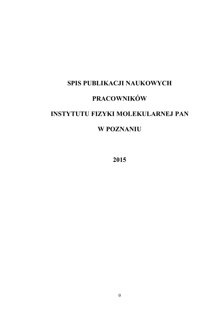 SPIS PUBLIKACJI NAUKOWYCH PRACOWNIKÓW INSTYTUTU FIZYKI MOLEKULARNEJ PAN W POZNANIU 2015 0 WYKAZ PRAC OPUBLIKOWANYCH W 2015 ROKU 1/ WYKAZ MONOGRAFII NAUKOWYCH ORAZ ROZDZIAŁÓW W MONOGRAFIACH NAUKOWYCH 1.1 AUTORSTWO MONOGRAFII NAUKOWEJ Wydawca Tytuł monografii Autorzy ISBN rok objętość (strony) objętość arkusze wydawnicze język 1.2. AUTORSTWO ROZDZIAŁU W MONOGRAFII NAUKOWEJ Wydawca Ministerstwo Nauki i Szkolnictwa Wyższego; Uniwersytet im. M. Curie-Skłodowskiej Tytuł monografii Nauka i przemysł – metody spektroskopowe w praktyce, nowe wyzwania i możliwości 2015; Tom I ISBN ISBN 978-83-939465-6-3 Redaktorzy Prof. dr hab. Jerzy Hubicki Rok wydania 2015 Objętość monografii 485 stron Tytuł rozdziału Zastosowanie metod spektroskopowych w analizie tryptanów. Autorzy rozdziału J. Cielecka-Piontek, A. Talaczyńska, M. Paczkowska, Kornelia Lewandowska, M. Szybowicz, M. Mizera, A. Krause, P. Zalewski Objętość rozdziału Str. 78-90 Język rozdziału Polski Wydawca Tytuł monografii ISBN Redaktorzy Rok wydania Objętość monografii Tytuł rozdziału Autorzy rozdziału Objętość rozdziału Język rozdziału Ministerstwo Nauki i Szkolnictwa Wyższego; Uniwersytet im. M. Curie-Skłodowskiej Nauka i przemysł – metody spektroskopowe w praktyce, nowe wyzwania i możliwości 2015; Tom I ISBN 978-83-939465-6-3 Prof. dr hab. Jerzy Hubicki 2015 485 stron Zastosowanie technik spektroskopowych w potwierdzeniu tożsamości, badaniu rozpuszczalności i dostępności farmaceutycznej wybranych form polimorficznych atorwastatyny M. Paczkowska, P. Zalewski, M Mizera, Kornelia Lewandowska, M. Szybowicz, D. Szymanowska-Powałowska, J. Cielecka-Piontek Str. 99-109 Polski 1 Wydawca Tytuł monografii ISBN Redaktorzy Rok wydania Objętość monografii Tytuł rozdziału Autorzy rozdziału Objętość rozdziału Język rozdziału Springer, The NATO Science for Peace and Security Programme Nanoscience Advances in CBRN Agents Detection, Information and Energy Security ISBN-13: 978-9401796965 ISBN-10: 9401796963 Plamen Petkov, Dumitru Tsiulyanu, Wilhelm Kulisch, Cyril Popov 2015 530 Structure of Fe3O4(111) Films on Pt(111) and Ru(0001): The Role of Epitaxial Strain at the Iron Oxide/Metal Single Crystal Interface M. Lewandowski, Natalia Michalak, Zygmunt Miłosz, Robert Ranecki, Tadeusz Luciński, S. Jurga 319-324 angielski 1.3 REDAKTOR MONOGRAFII WIELOAUTORSKICH, W KTÓRYCH NIE MA ROZDZIAŁOW AFILIOWANYCH DLA JEDNOSTKI R.J. Wojciechowski, Lesław Smardz, I. Weymann, Bogdan Imię i nazwisko Idzikowski, R. Micnas, Andrzej Szajek (Guest Editors) Acta Physica Polonica A, Vol. 127, number 1, Wydawnictwo Proceedings of the European Conference Physics of Magnetism 2014 (PM'14), Poznań, Poland, June 23-27, 2014 February 2015 rok wydania angielski Język PL ISSN 0587-4246 ISBN Imię i nazwisko Krzysztof W. Wojciechowski, Fabrizio Scarpa, Joseph N. Grima, Andrew Alderson Wydawnictwo rok wydania Język ISBN DOI Physica Status Solidi B, vol. 252(7) pp. 1421-1686 (2015) Wiley 2015 angielski 1862-6319 10.1002/pssb.201570345 1.4 REDAKTOR NACZELNY CZASOPISMA Imię i nazwisko Maciej Stroiński, Jan Węglarz, Krzysztof Wojciechowski Tytuł czasopisma CMST Computational Methods In Science and Technology Quarterly Journal ISSN 1505-0602 e-ISSN 2353-9453 Wydawca Scientific Publisher OWN Institute of Bioorganic Chemistry Polish Academy of Science 63-713 Poznań, ul. Wieniawskiego 17/19 2 1.5 WŁASNE WYDAWNICTWA W ROKU SPRAWOZDAWCZYM Redaktorzy Tytuł Język Recenzowana o zasięgu międzynarodowym Indeksowana przez ISI Nakład (liczba egzemplarzy) Ilość stron ISBN Nakład (liczba egzemplarzy) Ilość stron ISBN 3 2. WYKAZY PUBLIKACJI W CZASOPISMACH NAUKOWYCH PUBLIKACJE W CZASOPISMACH POSIADAJĄCYCH WSPÓŁCZYNNIK IMPACT FACTOR (IF), ZNAJDUJĄCYCH SIĘ W BAZIE JCR I WYMIENIONYCH CZĘŚCI A WYKAZU MNISW, o której mowa w & 14 ust. 1: 1. ACTA PHYSICA POLONICA A B. Pilawa, H. Wachowska, M. Kozłowski, Andrzej B. Więckowski, L. Najder-Kozdrowska Groups of Paramagnetic Centres in Reduced and Methylated Low Rank Coal. DOI: 10.12693/APhysPolA.128.264, Język: en, Data: 2015-09 ACTA PHYSICA POLONICA A, 3, 128 (2015), 264-267 2. Pavel Baláz, Józef Barnaś Effects of spin pumping on spin waves in antiferromagnetically exchange-coupled double layers. DOI: 10.12693/APhysPolA.128.150, Język: en, Data: 2015-08-08 ACTA PHYSICA POLONICA A, 2, 128, 150-152 3. P. Kopcansky, L. Tomco, Jan Jadżyn, Jolanta Świergiel, J. Majorosova, M. Kubovcikova, M. Timko, M. Rajnak, K. Siposova, Z. Gazova, Z. Bednarikova, N. Tomasovicova, Chin-Kun Hu, S. Hayryan, I. Studenyak, T. M. Kovalchuk, O. V. Kovalchuk Dielectric Properties of Lyotropic Magnetic Liquid Crystal. DOI: 10.12693/APhysPolA.127.632, Język: en, Data: 2015-02 ACTA PHYSICA POLONICA A, 2, 127, 632-634 4. Agnieszka Marczyńska, Juliusz Skoryna, Bogdan Szymański, Lesław Smardz Growth and Structural Characterisation of V/Fe Multilayers. DOI: 10.12693/APhysPolA.127.552, Język: en, Data: 2015-02 ACTA PHYSICA POLONICA A, 2, 127, 552-554 5. P. J. Bardzinski, M. Kopcewicz, M. Rybaczuk, M. Hasiak, Andrzej Musial, V. Kinzhybalo, Bogdan Idzikowski Magnetic Properties and Structure of Amorphous Fe74Hf4Ta1Cu1Gd1LaxSi15-xB4 (x=0, 7) Ribbons. DOI: 10.12693/APhysPolA.127.827, Język: en, Data: 2015-03 ACTA PHYSICA POLONICA A, 3, 127, 827-830 6. Agnieszka Marczynska, Juliusz Skoryna, Mikołaj Lewandowski, Lesław Smardz Oxidation Kinetics of Thin and Ultrathin Fe Films. DOI: 10.12693/APhysPolA.127.549, Język: en, Data: 2015-02 ACTA PHYSICA POLONICA A, 2, 127, 549-551 7. Hubert Głowiński, Marek Schmidt, A. Krysztofik, I. Goscianska, Janusz Dubowik Determination of Exchange and Rotatable Anisotropies in Co2FeSi/IrMn Exchange Coupled Structures using Broadband Ferromagnetic Resonance. DOI: 10.12693/APhysPolA.127.531, Język: en, Data: 2015-02 ACTA PHYSICA POLONICA A, 2, 127, 531-533 8. L. Majchrzycki, Maria Augustyniak-Jabłokow, Roman Strzelczyk, Mariusz Maćkowiak Magnetic Centres in Functio