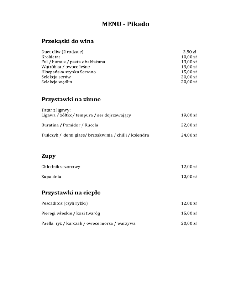 MENU - Pikado Przekąski do wina Duet oliw (2 rodzaje) Krokietas Ful / humus / pasta z bakłażana Wątróbka / owoce leśne Hiszpańska szynka Serrano Selekcja serów Selekcja wędlin 2,50 zł 10,00 zł 13,00 zł 13,00 zł 15,00 zł 20,00 zł 20,00 zł Przystawki na zimno Tatar z ligawy: Ligawa / żółtko/ tempura / ser dojrzewający 19,00 zł Buratina / Pomidor / Rucola 22,00 zł Tuńczyk / demi glace/ brzoskwinia / chilli / kolendra 24,00 zł Zupy Chłodnik sezonowy 12,00 zł Zupa dnia 12,00 zł Przystawki na ciepło Pescaditos (czyli rybki) 12,00 zł Pierogi włoskie / kozi twaróg 15,00 zł Paella: ryż / kurczak / owoce morza / warzywa 20,00 zł Dania główne Risotto pięć grzybów / ser dojrzewający 24,00 zł Filet z kaczki polenta / szpinak / owoce leśne 35,00 zł Ryba dnia: zapytaj obsługę 35,00 zł Steki Antrykot sezonowany, cena za 100 g 18,00 zł Rostbef sezonowany, cena za 100 g 19,00 zł Polędwica sezonowana, cena za 100 g 27,00 zł Dodatki do steków w cenie Desery Beza z owocami 12,00 zł Selekcja lodów i sorbetów 14,00 zł Ciasto czekoladowy 16,00 zł MENU DEGUSTACYJNE Zestaw „S” Trzy dania plus deser 60,00 zł Zestaw „M” Cztery dania plus deser 80,00 zł Zestaw „L” Pięć dań plus deser 100,00 zł Zestaw „XL” Sześć dań plus deser 120,00 zł Razem z sommelierem wybierzcie wina naszej karty pasujące do Ciebie i do dań.