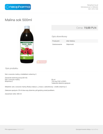 Neopharma.pl Mickiewicza 5, Mikstat 531-470-109 Malina sok 500ml Cena: 19,88 PLN Opis słownikowy Producent Alter Medica Zastosowanie Odporność Opis produktu Sok z owoców maliny z dodatkiem witaminy C. Zawarość dziennej porcji (50 ml): Sok z owoców maliny Witamina C 50 ml 120 mg (150 % ZDS*) *zalecane dzienne spożycie Składniki: sok z owoców maliny (Rubus idaeus L.), kwas L-askorbinowy - źródło witaminy C. Zalecane spożycie: 25 ml dwa razy dziennie, pół godziny przed posiłkiem. Zawartość netto: 500 ml Plik wygenerowano: 02-03-2017 Powered by TCPDF (www.tcpdf.org) Oprogramowanie sklepu: AptusShop