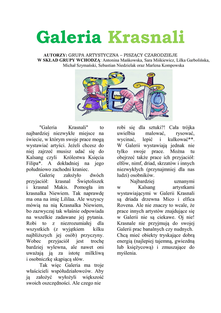 Galeria Krasnali AUTORZY: GRUPA ARTYSTYCZNA – PISZĄCY CZARODZIEJE W SKŁAD GRUPY WCHODZĄ: Antonina Mańkowska, Sara Miśkiewicz, Lilka Garbolińska, Michał Szymański, Sebastian Niedzielak oraz Marlena Kompowska "Galeria Krasnali" to najbardziej niezwykłe miejsce na świecie, w którym swoje prace mogą wystawiać artyści. Jeżeli chcesz do niej zajrzeć musisz udać się do Kalsang czyli Królestwa Księcia Filipa*. A dokładniej na jego południowo zachodni kraniec. Galerię założyło dwóch przyjaciół: krasnal Świętoliszek i krasnal Makis. Pomogła im krasnalka Niewiem. Tak naprawdę ma ona na imię Lililaa. Ale wszyscy mówią na nią Krasnalka Niewiem, bo zazwyczaj tak właśnie odpowiada na wszelkie zadawane jej pytania. Robi to z niezrozumiałej dla wszystkich (z wyjątkiem kilku najbliższych jej osób) przyczyny. Wobec przyjaciół jest trochę bardziej wylewna, ale nawet oni uważają ją za istotę milkliwą i osobniczkę skąpiącą słów. Tak więc Galeria ma troje właścicieli współudziałowców. Aby ją założyć wyłożyli większość swoich oszczędności. Ale czego nie robi się dla sztuki?! Cała trójka uwielbia malować, rysować, wycinać, lepić i kulkować**. W Galerii wystawiają jednak nie tylko swoje prace. Można tu obejrzeć także prace ich przyjaciół: elfów, nimf, driad, skrzatów i innych niezwykłych (przynajmniej dla nas ludzi) osobników. Najbardziej uznanymi w Kalsang artystkami wystawiającymi w Galerii Krasnali są driada drzewna Mico i elfica Rovena. Ale nie znaczy to wcale, że prace innych artystów znajdujące się w Galerii nie są ciekawe. Oj nie! Krasnale nie przyjmują do swojej Galerii prac banalnych czy nudnych. Chcą mieć obiekty tryskające dobrą energią (najlepiej tajemną, gwiezdną lub księżycową) i zmuszające do myślenia. Krasnalka Niewiem Rys. Lila Garbolińska Takie już są te krasnale - wybredne, marudne uparciuchy - i nic na to nie można poradzić. Pewnego dnia do Galerii zawitał Karankul. A był to komornik królewski. Wszedł, pokazał swoją komorniczą legitymację i zapytał, czy to jest galeria sztuki ( jakby nie było widać) zapytał też krasnali, czy są jej właścicielami (a kim, do licha, niby mieliby być). – Nie wiem – odpowiedziała Lililaa. Na szczęście Świętoliszek szybko ją poprawił i potwierdził, że są właścicielami Galerii. Komornik obwieścił, że zalegają z daniną dla króla, i że przyszedł zająć Galerię za długi. Krasnale walnęły się po głowach (każdy po swojej), bo uświadomiły sobie, że faktycznie nie zapłaciły królowi daniny. Krasnal Makis ugościł gościa najlepiej jak umiał (usadził go na błękitnym fotelu i poczęstował malinowymi landrynkami i sokiem wiśniowym), a Świętoliszek i Lililaa poszli do kuchni naradzić się. W rzeczywistości Lililaa w ogóle się nie naradzała, bo ciągle mówiła: „nie wiem”. Krasnal Świętoliszek dyskutował więc przez kwadrans sam z sobą. W końcu wpadł na pomysł oddania królowi w ramach daniny trzech obrazów - po jednym od każdego z krasnali. Wybrano trzy obrazy. Lililaa pięknie je spakowała i zaniosła komornikowi, a dwa pozostałe krasnale pomogły Karankulowi szybko opuścić Galerię żegnając go serdecznie i subtelnie napomykając, że król na pewno niecierpliwie na niego czeka. Gdy komornik był już daleko krasnale odetchnęły z ulgą. Po pięciu dniach wysłannik królewski dostarczył krasnalom list z zamku. Było to duże zlecenie od króla na obrazy, które miały zawisnąć w komnatach Jego Wysokości. Z listu wynikało, że król jest szczodrym zleceniodawcą. Krasnale popłakały się ze szczęścia i od razu wzięły do roboty. A co dalej? Liczymy na Twoje pomysły! Pisz razem z nami tę opowieść o Galerii Krasnali. Ale zanim nastąpi ciąg dalszy zamieszczamy trochę informacji o założycielach Galerii i najbardziej uznanych artystkach Kalsang. Notki o nich pochodzą z Wielkiej Encyklopedii Artystów Niezależnych Królestwa Kalsang. Krasnal Świętoliszek Wiek: 39 lat Wygląd: Niski, chudy krasnal z długimi, czarno-zielonymi włosami, zazwyczaj ubrany w płaszcz z liści i obsypany brokatem. Jego skóra jest żółta i ma wzory liściowe. Chodzi boso, a na rękach ma rękawiczki. Inne informacje: Lata na swojej paralotni. Mieszka w podziemnej norze. Niektórzy twierdzą, że Krasnal Świętoliszek. Rys. Michał Szymański niepotrzebnych rzeczy. Lubi grać w bierki pod wodą. Usiłuje ciągle znaleźć koniec tęczy. Hoduje granatowe jednorożce. Krasnal Makis Wiek: 29 lat Wygląd: Młody i wysportowany. Ubiera się bardzo artystycznie – zazwyczaj w luźne, długie, kolorowe szaty. Inne informacje: Utalentowany artysta-profesjonalista. Zajmuje się działalnością dobroczynną współpracując z wieloma fundacjami. Wystawia dosyć kontrowersyjne obrazy. Aby zrozumieć tego twórcę należy mocno się skoncentrować a potem wczuć w jego obrazy. Dopiero po pewnym czasie udaje się poczuć ich głębię. Malowanie to największa pasja Makisa. Artysta nie lubi pokazywać się publicznie. Wyjątek stanowi Galeria – tam chętnie przebywa mimo obecności licznych zwiedzających. Makis lubi uprawiać sporty i ma dużo przyjaciół. wygląda głupkowato. Ale to nieprawda. Po prostu jest ekscentryczny i oryginalny. Charakter: Miły, naiwny - wierzy każdemu we wszystko, co ten ktoś powie. Lubi dawać prezenty. Ciągle poszukuje skarbów. Nadmiernie przywiązuje się do swoich rzeczy. Lunatykuje w nocy. Zainteresowania: Tworzenie kolaży. Kupowanie i zbieranie Makis Rys. Michał Szymański Driada Mico Rasa: driada drzewna Wiek: 508 lat. Charakter i osobowość: Oddalona, zamknięta w sobie, nieufna. Taka jest tylko w stosunku do ludzi. Ufa roślinom, zwierzętom i wszystkim istotom fantastycznym. Rozumie je drogę. W wolnych chwilach lubi nie tylko śpiewać ale i tworzyć dzieła sztuki. Wygląd: Ma długie, brązowe włosy poprzetykane rudymi pasmami. Jest wy