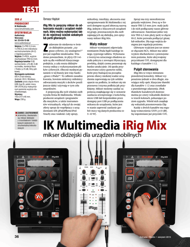 TEST 399 zł PRODUCENT IK Multimedia www.ikmultimedia.com DYSTRYBUCJA Audiostacja Warszawa tel. 22-616-13-86 www.audiostacja.pl Wejścia: 2×TRS 3,5 mm, 1×TRS 6,3 mm mikrofonowo/instrumentalne (Hi-Z) z regulacją poziomu. Wyjścia: 2×RCA, wyjście słuchawkowe TRS 6,3 mm. Regulacja kanałów 1 i 2: wzmocnienie ±15 dB, 0 dB na środku, korekcja Bass i Treble (±15 dB, filtry półkowe). Wymagania systemowe: iOS 4.3 lub nowszy, A ndroid, OS X, Windows. Zasilanie: przez złącze micro USB (typ D), pobór mocy 5W (10 W przy maksymalnym poziomie wyjścia słuchawkowego). Wymiary: 110×217×46 mm. Waga: 230 g. Z AKRES ZASTOSOWAŃ przenośny, dwukanałowy mikser didżejski z crossfaderem i dodatkowym wejściem instrumentalno/mikrofonowym Tomasz Hajduk iRig Mix to poręczny mikser do odtwarzania muzyki z urządzeń mobilnych, który można wykorzystać także do rejestracji ścieżek wokalnych lub partii gitarowych. Z adawane do niedawna w świecie didżejskim pytanie „czy grasz cyfrowo, czy analogowo?” jest już zupełnie nieaktualne. Wiadomo powszechnie, że płyty CD i winyle są dla wielbicieli klasycznego podejścia, a cała reszta didżejów tworzy miksy z wykorzystaniem plików cyfrowych. Obecnie modnym pytaniem w tej branży jest więc hasło: „grasz z iPada?”. To całkiem zasadna kwestia, bowiem niektórzy miłośnicy odtwarzania muzyki z decków poszli jeszcze dalej i używają w tym celu smartfonów. Z propozycją dla tych właśnie osób wyszła firma IK Multimedia. Włoski producent urządzeń i programów dla muzyków, a także instrumentów wirtualnych, włączył do swojej oferty sprzęt do współpracy z urządzeniami iOS (iPad/iPhone/iPod Touch) oraz Android. Cały sprzęt, mikrofony, interfejsy, akcesoria oraz oprogramowanie IK Multimedia z tej serii dostępne są pod zbiorczą nazwą iRig. Jednym z kluczowych urządzeń tej grupy, przeznaczonym dla osób zajmujących się didżejką, jest opisywany mikser iRig Mix. Mały mikser Mikser wymiarami odpowiada rozmiarom iPada bądź każdego innego, typowego tabletu. Wykonana z tworzywa sztucznego obudowa została pokryta z zewnątrz błyszczącą powłoką, dzięki czemu prezentuje się bardzo atrakcyjnie. Od spodu przymocowano cztery gumowe nóżki, które przy budzącej na początku pewne obawy niedużej wadze urządzenia zapewniają na tyle solidne oparcie na podłożu, że mikser się nie przesuwa i trzyma podłoża jak przyklejony. Mikser możemy zasilać za pomocą znajdującego się w zestawie zasilacza zewnętrznego z końcówką micro USB lub bezpośrednio przez dostępny port USB po podłączeniu miksera do urządzenia, które jest w stanie zapewnić zasilanie (pobór mocy wg danych producenta to 5–10 W). Sprzęt ma trzy stereofoniczne gniazda wejściowe. Dwa są w formacie TRS 3,5 mm (tzw. mały jack) i do nich podłączamy nasze główne odtwarzacze. Natomiast jedno wejście TRS 6,3 mm (duży jack) to złącze Hi-Z, które pozwala podłączyć gitarę lub mikrofon. Dla tego wejścia dostępna jest regulacja poziomu. Głównym wyjściem jest tor stereo ze złączami RCA. Mikser ma także wyjście słuchawkowe z potencjometrem poziomu, które aktywujemy przyciskami CUE, dostępnymi dla każdego z kanałów 1 i 2. Pulpit sterowania iRig Mix to wręcz miniatura prawdziwej konsolety. Mikser wyposażono jednak w dwa długie, stawiające miły opór, klasyczne tłumiki dla kanałów 1 i 2 oraz crossfader z prawdziwego zdarzenia. Obok tłumików kanałowych dostrzec można po cztery wskaźniki diodowe w trzech kolorach, pokazujące poziom sygnału. Wśród nich znajduje się wskaźnik przesterowania Clip. Każdy z dwóch kanałów ma regulację wzmocnienia GAIN (±15 dB). Są wspomniane już przyciski CUE, IK Multimedia iRig Mix mikser didżejski dla urządzeń mobilnych 36 Estrada i Studio • sierpień 2015 kierujące sygnał kanału do wyjścia słuchawkowego, a także dwupasmowa sekcja korekcji półkowej dla niskich i wysokich tonów. Filtry działają w zakresie ±15 dB, z częstotliwościami granicznymi 80 Hz (Bass) oraz 8 kHz (Treble). Całość sekcji regulatorów uzupełnia potencjometr sygnału wyjściowego MASTER. Jedno lub dwa urządzenia Interesująco zaprojektowano system konfiguracji torów wejściowych i wyjściowych. Służą do tego przełączniki INPUT i X-SYNC. Pierwszym określamy, czy będziemy miksować z jednego, czy dwóch urządzeń. W ustawieniu dla dwóch urządzeń system działa tradycyjnie, regulatory kanałów działają niezależnie dla każdego wejścia. Jeśli wybierzemy pojedyncze urządzenie, do wejścia 1 należy podać jednym przewodem sygnał monofoniczny z dwóch kanałów aplikacji. Tym sposobem możemy sterować kanałami aplikacji didżejskiej w jednym iUrządzeniu za pomocą regulatorów każdego z kanałów miksera. Warunek: aplikacja musi być kompatybilna z mikserem, więc najlepiej jeśli będzie to program IK Multimedia DJ Rig Free. Dla gitarzysty, dla didżeja Przełącznik X-SYNC uruchamia lub wyłącza synchronizację. W ustawieniu OFF sygnał z wejścia 3 (gitarowo-mikrofonowe) można przetwarzać w czasie rzeczywistym w aplikacji urządzenia podłączonego do wejścia 1. Komunikacja z programem działa dwukierunkowo. W tym samym czasie do wejścia 2 można podłączyć drugie iUrządzenie, na przykład z podkładem muzycznym. W praktyce oznacza to, że można odtworzyć podkłady na torze 2, jednocześnie grając na gitarze albo śpiewając z wykorzystaniem wejścia 3 i efektów w urządzeniu iOS podłączonym do wejścia 1. W ustawieniu po włączeniu X-Sync sygnał z wejścia 1 trafia do wyjścia 2 i odwrotnie. Dzięki temu – dysponując odpowiednią aplikacją – mamy możliwość wzajemnej synchronizacji utworów w dwóch wirtualnych odtwarzaczach. Sygnał z wejścia gitarowo-mikrofonowego 3 trafia wówczas na tor Master, co umożliwia korzystanie z mikrofonu w czasie odtwarzania muzyki. Takie ustawienie zapewnia nam konfigurację typowo didżejską, p