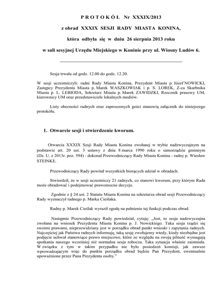 P R O T O K Ó Ł Nr XXXIX/2013 z obrad XXXIX SESJI RADY MIASTA KONINA, która odbyła się w dniu 26 sierpnia 2013 roku w sali sesyjnej Urzędu Miejskiego w Koninie przy ul. Wiosny Ludów 6. _______________________________________________________ Sesja trwała od godz. 12.00 do godz. 12.20. W sesji uczestniczyli: radni Rady Miasta Konina, Prezydent Miasta p. Józef NOWICKI, Zastępcy Prezydenta Miasta p. Marek WASZKOWIAK i p. S. LOREK, Z-ca Skarbnika Miasta p. L. LEBIODA, Sekretarz Miasta p. Marek ZAWIDZKI, Rzecznik prasowy UM, kierownicy UM oraz przedstawiciele lokalnych mediów. Listy obecności radnych oraz zaproszonych gości stanowią załącznik do niniejszego protokółu. 1. Otwarcie sesji i stwierdzenie kworum. Otwarcia XXXIX Sesji Rady Miasta Konina zwołanej w trybie nadzwyczajnym na podstawie art. 20 ust. 3 ustawy z dnia 8 marca 1990 roku o samorządzie gminnym (Dz. U. z 2013r. poz. 594) - dokonał Przewodniczący Rady Miasta Konina - radny p. Wiesław STEINKE. Przewodniczący Rady powitał wszystkich biorących udział w obradach. Stwierdził, że w sesji uczestniczy 21 radnych, co stanowi kworum, przy którym Rada może obradować i podejmować prawomocne decyzje. Zgodnie z § 24 ust. 2 Statutu Miasta Konina na sekretarza obrad sesji Przewodniczący Rady wyznaczył radnego p. Marka Cieślaka. Radny p. Marek Cieślak wyraził zgodę na pełnienie tej funkcji podczas obrad. Następnie Przewodniczący Rady powiedział, cytuję: „Jest, to sesja nadzwyczajna zwołana na wniosek Prezydenta Miasta Konina p. J. Nowickiego. Taka sesja rządzi się swoimi prawami, nieprzewidziany jest w porządku obrad punkt wnioski i zapytania radnych. Najczęściej jak Państwa radnych informuję, taką sesję zwołujemy wtedy, kiedy niezbędne jest podjęcie uchwał stanowiące prawo miejscowe, które ze względu na swoją pilność wymagają spotkania naszego wcześniej niż normalna sesja robocza. Taka sytuacja właśnie zaistniała. W związku z tym w takim przypadku nie było posiedzeń komisji, jak zawsze wprowadzającym więc do punktu porządku obrad będzie Pan Prezydent, ewentualnie upoważnione przez Pana Prezydenta osoby.” Przewodniczący Rady stwierdził, że realizowany będzie następujący: porządek obrad: 1. Otwarcie sesji i stwierdzenie kworum. 2. Podjęcie uchwały w sprawie zmian w budżecie miasta Konina na 2013 rok (druk nr 669). 3. Podjęcie uchwały w sprawie zatwierdzenia do realizacji projektu pt. „Objazd Europy z Jules Varnes i naszymi przyjaciółmi partnerami” nr wniosku 2013-1-ES1-COM0673068 6 w ramach programu „Uczenie się przez całe życie” program Comenius Partnerskie Projekty Szkół (druk nr 666). 4. Zamknięcie obrad XXXIX Sesji Rady Miasta Konina. 2. Podjęcie uchwały w sprawie zmian w budżecie miasta Konina na 2013 rok (druk nr 669). Realizując kolejny punkt porządku obrad Przewodniczący Rady przypomniał, iż projekt uchwały oznaczony numerem druku 669 radni otrzymali. Dodał, że 21 sierpnia radni otrzymali autopoprawkę do projektu uchwały. Następnie Przewodniczący Rady poprosił o zabranie głosu Prezydenta Miasta p. J. Nowickiego i omówienie projektu uchwały. Głos zabrał Prezydent Miasta Konina p. J. NOWICKI, cytuję: „Konieczność wystąpienia z prośbą o zwołanie sesji nadzwyczajnej wynika z faktu, iż mamy w tej chwili taką oto sytuację, że pozostaje nam dwa dni na podpisanie umowy na przebudowę ulic na osiedlu Przydziałki - II etap. Tam są między innymi ulica Bursztynowa, ulica Brylantowa i inne, które w tym II etapie mieszczą się. Natomiast wynik przetargu jest inny niż kwota, która została zabezpieczona w budżecie. Zresztą jak zapewne Państwo radni, Wysoka Rada pamięta, często jest tak, że dla wprowadzenia zadania określamy kwotę, która potem wymaga uzupełnienia. W tym przypadku mamy do czynienia z taką sytuacją, że te środki, które wcześniej były zabezpieczone na ewentualną przebudowę ulicy Romana Dmowskiego w Koninie, one nie zostały wykorzystane w związku z tym, że ten projekt nie został wpisany w dofinansowanie w ramach tzw. „schetynówek”, stąd nasza propozycja, by z budżetu powiatu kwotę 703.798 zł w dziale 600 Transport i łączność - wydatki majątkowe - zadanie pn. „Przebudowa ulicy Romana Dmowskiego w Koninie”, zmniejszyć plan wydatków o taką kwotę i jednocześnie w budżecie gminy zwiększyć plan wydatków o kwotę 703.798 zł w dziale 600 Transport i łączność - wydatki majątkowe na zadanie pn. „Budowa ulic na osiedlu Przydziałki - etap II. W tym również są środki w ramach ustawy prawo ochrony środowiska 87.800 zł. Wysoka Rado bardzo proszę o zaakceptowanie tej propozycji. Tak, jak powiedziałem na wstępie decyzja Wysokiej Rady, będzie stanowiła podstawę do podpisania umowy na wykonawstwo tych ważnych zadań inwestycyjnych, które wcześniej znajdowały się w naszym planie. Pozostałe sprawy dotyczące druku 669 zostały Państwu radnym doręczone i nie będę ich szczegółowo omawiał. 2 Jednocześnie Panie Przewodniczący, Wysoka Rado, chciałbym do tego druku 669 zgłosić kolejną autopoprawkę, dotyczy ona budżetu gminy, polegającą na tym, że zmniejsza się plan wydatków o kwotę 30 tys. zł w dziale 758 - różne rozliczenia. Rozdysponowuje się rezerwę ogólną i zwiększa się plan wydatków o kwotę 30 tys. zł w dziale 900 - gospodarka komunalna i ochrona środowiska na zadanie inwestycyjne pn. „Opracowanie dokumentacji projektowo – wykonawczej na nowy przebieg cieku wodnego odprowadzającego wody deszczowe z terenów inwestycyjnych w obrębie Międzylesie”. Wysoka Rado bardzo proszę o przyjęcie tych dwóch autopoprawek. Dziękuję bardzo.” Przewodniczący Rady otworzył dyskusję nad projektem uchwały. Jako pierwszy głos zabrał radny p. Mateusz CIEŚLAK, cytuję: „Panie Prezydencie czy mógłbym prosić o takie podsumowanie, w takim razie, jaka kwota została na ulicę Dmowskiego, bo troszeczkę się