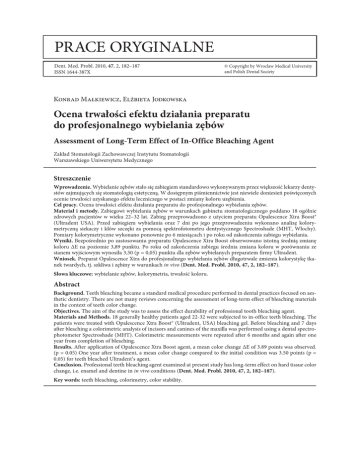 182 K. Małkiewicz, E. Jodkowska prace oryginalne Dent. Med. Probl. 2010, 47, 2, 182–187 ISSN 1644-387X © Copyright by Wroclaw Medical University and Polish Dental Society Konrad Małkiewicz, Elżbieta Jodkowska Ocena trwałości efektu działania preparatu do profesjonalnego wybielania zębów Assessment of Long-Term Effect of In-Office Bleaching Agent Zakład Stomatologii Zachowawczej Instytutu Stomatologii Warszawskiego Uniwersytetu Medycznego Streszczenie Wprowadzenie. Wybielanie zębów stało się zabiegiem standardowo wykonywanym przez większość lekarzy dentystów zajmujących się stomatologią estetyczną. W dostępnym piśmiennictwie jest niewiele doniesień poświęconych ocenie trwałości uzyskanego efektu leczniczego w postaci zmiany koloru uzębienia. Cel pracy. Ocena trwałości efektu działania preparatu do profesjonalnego wybielania zębów. Materiał i metody. Zabiegowi wybielania zębów w warunkach gabinetu stomatologicznego poddano 18 ogólnie zdrowych pacjentów w wieku 22–32 lat. Zabieg przeprowadzono z użyciem preparatu Opalescence Xtra Boost® (Ultradent USA). Przed zabiegiem wybielania oraz 7 dni po jego przeprowadzeniu wykonano analizę kolorymetryczną siekaczy i kłów szczęki za pomocą spektrofotometru dentystycznego Spectroshade (MHT, Włochy). Pomiary kolorymetryczne wykonano ponownie po 6 miesiącach i po roku od zakończenia zabiegu wybielania. Wyniki. Bezpośrednio po zastosowaniu preparatu Opalescence Xtra Boost obserwowano istotną średnią zmianę koloru ∆E na poziomie 3,89 punktu. Po roku od zakończenia zabiegu średnia zmiana koloru w porównaniu ze stanem wyjściowym wynosiła 3,50 (p = 0,05) punktu dla zębów wybielanych preparatem firmy Ultradent. Wniosek. Preparat Opalescence Xtra do profesjonalnego wybielania zębów długotrwale zmienia kolorystykę tkanek twardych, tj. szkliwa i zębiny w warunkach in vivo (Dent. Med. Probl. 2010, 47, 2, 182–187). Słowa kluczowe: wybielanie zębów, kolorymetria, trwałość koloru. Abstract Background. Teeth bleaching became a standard medical procedure performed in dental practices focused on aesthetic dentistry. There are not many reviews concerning the assessment of long-term effect of bleaching materials in the context of teeth color change. Objectives. The aim of the study was to assess the effect durability of professional tooth bleaching agent. Materials and Methods. 18 generally healthy patients aged 22-32 were subjected to in-office teeth bleaching. The patients were treated with Opalescence Xtra Boost® (Ultradent, USA) bleaching gel. Before bleaching and 7 days after bleaching a colorimetric analysis of incisors and canines of the maxilla was performed using a dental spectrophotometer Spectroshade (MHT). Colorimetric measurements were repeated after 6 months and again after one year from completion of bleaching. Results. After application of Opalescence Xtra Boost agent, a mean color change ∆E of 3.89 points was observed. (p = 0.05) One year after treatment, a mean color change compared to the initial condition was 3.50 points (p = 0.05) for teeth bleached Ultradent’s agent. Conclusion. Professional teeth bleaching agent examined at present study has long-term effect on hard tissue color change, i.e. enamel and dentine in in vivo conditions (Dent. Med. Probl. 2010, 47, 2, 182–187). Key words: teeth bleaching, colorimetry, color stability. Ocena trwałości efektu działania preparatu do profesjonalnego wybielania zębów Profesjonalne wybielanie zębów stało się zabiegiem wykonywanym standardowo przez lekarzy dentystów. Zabiegowi temu poddają się coraz częściej pacjenci oczekujący natychmiastowej poprawy estetyki uzębienia. Publikowane wyniki badań poświęconych bezpieczeństwu środków utleniających, działających w warunkach jamy ustnej na twarde tkanki zębów sugerują, że zabieg ten jest bezpieczny, mimo że w warunkach doświadczalnych powoduje zmiany mikrotwardości szkliwa i zębiny [1–3] oraz obrazu histologicznego tkanek twardych zębów [4–6]. Badania prowadzone nad efektywnością działania preparatów wybielających poświęcone są przede wszystkim obserwacji zmiany koloru zębów w porównaniu do barwy wyjściowej. Obserwacje są prowadzone różnymi metodami, poczynając od bezpośredniej oceny wizualnej koloru zębów, przez ocenę fotografii wykonywanych w określonych warunkach ekspozycji i przedziałach czasowych, kończąc na zastosowaniu optycznych urządzeń pomiarowych, takich jak: kamery cyfrowe, kolorymetry, spektrofotometry. Mimo prób standaryzacji, ocena wizualna barwy obserwowanego przedmiotu nie jest ani obiektywna, ani powtarzalna, w dużej mierze zależy od obserwatora i warunków, w których wykonuje się badanie [7, 8]. Od około 10 lat są zatem opracowywane metody analizy kolorymetrycznej uzębienia, wykorzystujące różne rodzaje urządzeń pomiarowych, w tym coraz częściej stosowane spektrofotometry [9–11]. Niektóre z tych urządzeń zostały opracowane na potrzeby stomatologii, umożliwiając analizę parametrów opisujących kolor zębów w warunkach klinicznych, tj. w jamie ustnej pacjenta. Urządzenia te dokonują pomiaru fali światła odbitego od badanego przedmiotu, dzięki czemu pozwalają określić jego: jasność L*, barwę c* oraz jej nasycenie h*. Chociaż skala L*c*h* pozwala na określenie kolorystyki uzębienia za pomocą wartości liczbowych, do badania efektów działania środków wybielających jest najczęściej stosowana skala CIE L*a*b*, w której kolor jest opisany przez parametr jasności L*, stopień nasycenia barwami zieloną (+a*) lub czerwoną (-a) oraz niebieską (+b*) lub żółtą (b*). Przyjmuje się, że miarą działania środków utleniających na twarde tkanki zębów jest wzrost jasności (ΔL) i spadek nasycenia barwą żółtą ocenianych struktur [12, 13]. Całkowita zmiana koloru badanego przedmiotu; ΔE opisana jest wzorem: 2 2 2 1/2 ∆E = ((∆L) + (∆a) + (