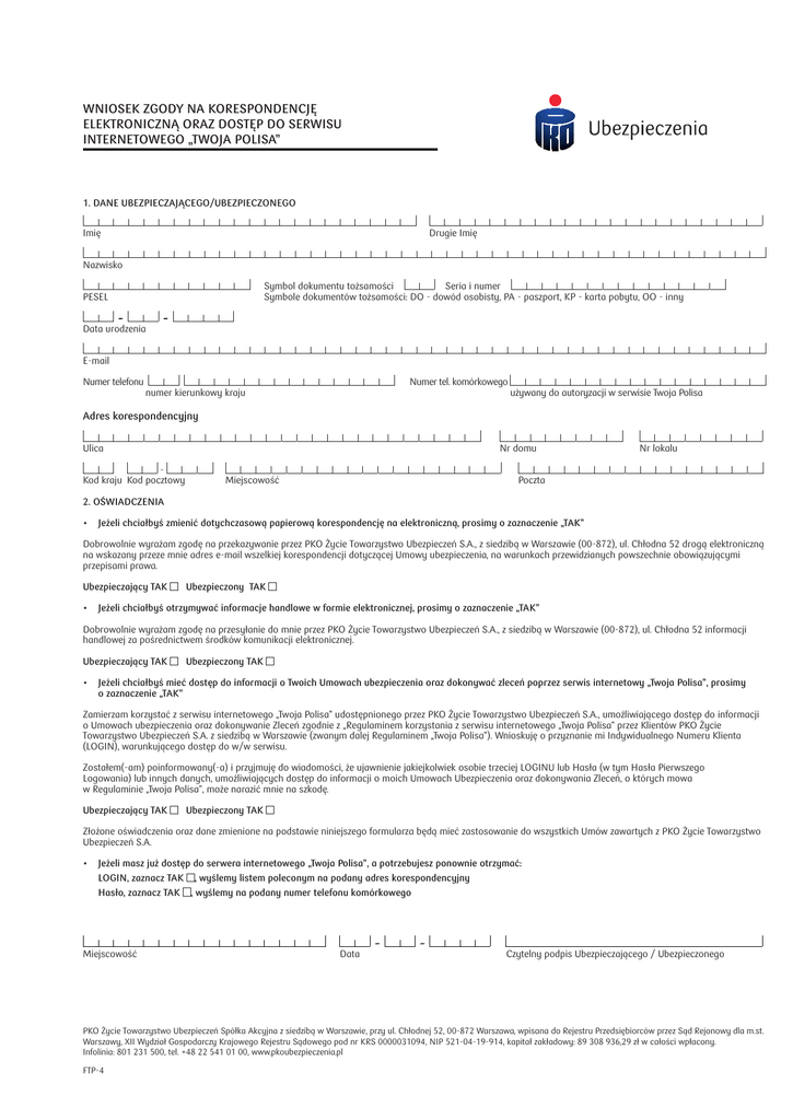 Wniosek zgody na korespondencję elektroniczną oraz dostęp do serwisu internetowego „Twoja Polisa” 1. dane ubezpieczającego/ubezpieczonego Imię Drugie Imię Nazwisko PESEL – Data urodzenia Symbol dokumentu tożsamości Seria i numer Symbole dokumentów tożsamości: DO - dowód osobisty, PA - paszport, KP - karta pobytu, OO - inny – E-mail Numer telefonu numer kierunkowy kraju Numer tel. komórkowego używany do autoryzacji w serwisie Twoja Polisa Adres korespondencyjny Ulica Kod kraju Kod pocztowy Nr domu Miejscowość Nr lokalu Poczta 2. oświadczenia • Jeżeli chciałbyś zmienić dotychczasową papierową korespondencję na elektroniczną, prosimy o zaznaczenie „TAK” Dobrowolnie wyrażam zgodę na przekazywanie przez PKO Życie Towarzystwo Ubezpieczeń S.A., z siedzibą w Warszawie (00-872), ul. Chłodna 52 drogą elektroniczną na wskazany przeze mnie adres e-mail wszelkiej korespondencji dotyczącej Umowy ubezpieczenia, na warunkach przewidzianych powszechnie obowiązującymi przepisami prawa. Ubezpieczający TAK Ubezpieczony TAK • Jeżeli chciałbyś otrzymywać informacje handlowe w formie elektronicznej, prosimy o zaznaczenie „TAK” Dobrowolnie wyrażam zgodę na przesyłanie do mnie przez PKO Życie Towarzystwo Ubezpieczeń S.A., z siedzibą w Warszawie (00-872), ul. Chłodna 52 informacji handlowej za pośrednictwem środków komunikacji elektronicznej. Ubezpieczający TAK Ubezpieczony TAK • Jeżeli chciałbyś mieć dostęp do informacji o Twoich Umowach ubezpieczenia oraz dokonywać zleceń poprzez serwis internetowy „Twoja Polisa”, prosimy o zaznaczenie „TAK” Zamierzam korzystać z serwisu internetowego „Twoja Polisa” udostępnionego przez PKO Życie Towarzystwo Ubezpieczeń S.A., umożliwiającego dostęp do informacji o Umowach ubezpieczenia oraz dokonywanie Zleceń zgodnie z „Regulaminem korzystania z serwisu internetowego „Twoja Polisa” przez Klientów PKO Życie Towarzystwo Ubezpieczeń S.A. z siedzibą w Warszawie (zwanym dalej Regulaminem „Twoja Polisa”). Wnioskuję o przyznanie mi Indywidualnego Numeru Klienta (LOGIN), warunkującego dostęp do w/w serwisu. Zostałem(-am) poinformowany(-a) i przyjmuję do wiadomości, że ujawnienie jakiejkolwiek osobie trzeciej LOGINU lub Hasła (w tym Hasła Pierwszego Logowania) lub innych danych, umożliwiających dostęp do informacji o moich Umowach Ubezpieczenia oraz dokonywania Zleceń, o których mowa w Regulaminie „Twoja Polisa”, może narazić mnie na szkodę. Ubezpieczający TAK Ubezpieczony TAK Złożone oświadczenia oraz dane zmienione na podstawie niniejszego formularza będą mieć zastosowanie do wszystkich Umów zawartych z PKO Życie Towarzystwo Ubezpieczeń S.A. • Jeżeli masz już dostęp do serwera internetowego „Twoja Polisa”, a potrzebujesz ponownie otrzymać: LOGIN, zaznacz TAK , wyślemy listem poleconym na podany adres korespondencyjny Hasło, zaznacz TAK , wyślemy na podany numer telefonu komórkowego Miejscowość Data – – Czytelny podpis Ubezpieczającego / Ubezpieczonego PKO Życie Towarzystwo Ubezpieczeń Spółka Akcyjna z siedzibą w Warszawie, przy ul. Chłodnej 52, 00-872 Warszawa, wpisana do Rejestru Przedsiębiorców przez Sąd Rejonowy dla m.st. Warszawy, XII Wydział Gospodarczy Krajowego Rejestru Sądowego pod nr KRS 0000031094, NIP 521-04-19-914, kapitał zakładowy: 89 308 936,29 zł w całości wpłacony. Infolinia: 801 231 500, tel. +48 22 541 01 00, www.pkoubezpieczenia.pl FTP-4