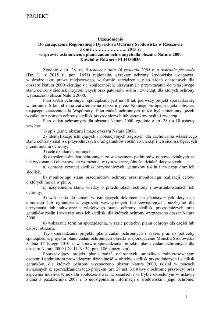 PROJEKT Uzasadnienie Do zarządzenia Regionalnego Dyrektora Ochrony Środowiska w Rzeszowie z dnia ………………….. 2015 r. w sprawie ustanowienia planu zadań ochronnych dla obszaru Natura 2000 Kościół w Równem PLH180036 Zgodnie z art. 28 ust. 5 ustawy z dnia 16 kwietnia 2004 r. o ochronie przyrody (Dz. U. z 2015 r., poz. 1651) regionalny dyrektor ochrony środowiska ustanawia, w drodze aktu prawa miejscowego, w formie zarządzenia, plan zadań ochronnych dla obszaru Natura 2000 kierując się koniecznością utrzymania i przywracania do właściwego stanu ochrony siedlisk przyrodniczych oraz gatunków roślin i zwierząt, dla których ochrony wyznaczono obszar Natura 2000. Plan zadań ochronnych sporządzany jest na 10 lat, pierwszy projekt sporządza się w terminie 6 lat od dnia zatwierdzenia obszaru przez Komisję Europejską jako obszaru mającego znaczenie dla Wspólnoty. Plan zadań ochronnych może być zmieniony, jeżeli wynika to z potrzeb ochrony siedlisk przyrodniczych lub gatunków roślin i zwierząt. Plan zadań ochronnych dla obszaru Natura 2000, zgodnie z art. 28 ust.10 ustawy zawiera: 1) opis granic obszaru i mapę obszaru Natura 2000; 2) identyfikację istniejących i potencjalnych zagrożeń dla zachowania właściwego stanu ochrony siedlisk przyrodniczych oraz gatunków roślin i zwierząt i ich siedlisk będących przedmiotami ochrony; 3) cele działań ochronnych; 4) określenie działań ochronnych ze wskazaniem podmiotów odpowiedzialnych za ich wykonanie i obszarów ich wdrażania, w tym w szczególności działań dotyczących: a) ochrony czynnej siedlisk przyrodniczych, gatunków roślin i zwierząt oraz ich siedlisk, b) monitoringu stanu przedmiotów ochrony oraz monitoringu realizacji celów, o których mowa w pkt 3, c) uzupełnienia stanu wiedzy o przedmiotach ochrony i uwarunkowaniach ich ochrony; 5) wskazania do zmian w istniejących dokumentach planistycznych dotyczące eliminacji lub ograniczenia zagrożeń wewnętrznych lub zewnętrznych, niezbędne dla utrzymania lub odtworzenia właściwego stanu ochrony siedlisk przyrodniczych oraz gatunków roślin i zwierząt oraz ich siedlisk, dla których ochrony wyznaczono obszar Natura 2000 6) wskazanie terminu sporządzenia, w razie potrzeby, planu ochrony dla części lub całości obszaru. Tryb sporządzania projektu planu zadań ochronnych i zakres prac na potrzeby sporządzania projektu planu zadań ochronnych określa rozporządzenie Ministra Środowiska z dnia 17 lutego 2010 r. w sprawie sporządzania projektu planu zadań ochronnych dla obszaru Natura 2000 (Dz. U. Nr 34, poz. 186 z późn. zm). Sporządzający projekt planu zadań ochronnych umożliwia zainteresowanym osobom i podmiotom prowadzącym działalność w obrębie siedlisk przyrodniczych i siedlisk gatunków, dla których ochrony wyznaczono obszar Natura 2000, udział w pracach związanych ze sporządzaniem tego projektu (art. 28 ust. 3 ustawy o ochronie przyrody) oraz zapewnia możliwość udziału społeczeństwa, na zasadach i w trybie określonym w ustawie z dnia 3 października 2008 r. o udostępnianiu informacji o środowisku i jego ochronie, 1 PROJEKT udziale społeczeństwa w ochronie środowiska oraz o ocenach oddziaływania na środowisko (Dz. U. z 2013 r. poz. 1235, ze zm.), w postępowaniu, którego przedmiotem jest sporządzenie projektu (art. 28 ust. 4 ustawy o ochronie przyrody). Projekty planów zadań ochronnych zamieszcza się w publicznie dostępnych wykazach (art. 21 ust. 2 pkt 24 lit. a ustawy z dnia 3 października 2008 r. o udostępnianiu informacji o środowisku i jego ochronie, udziale społeczeństwa w ochronie środowiska oraz o ocenach oddziaływania na środowisko - Dz. U. 2013 poz. 1235 z późn. zm.). Projekt planu wymaga uzgodnienia z wojewodą (art. 59 ust. 2 ustawy z dnia 23 stycznia 2009 r. o wojewodzie i administracji rządowej w województwie, Dz. U. Nr 31, poz. 206) i może być przedmiotem opiniowania przez regionalną radę ochrony przyrody (art. 97 ust. 3 pkt 2 ustawy o ochronie przyrody). Obszar Natura 2000 Kościół w Równem PLH180036 (zwany dalej Obszarem), jako obszar mający znaczenie dla Wspólnoty zatwierdzono decyzją Komisji Europejskiej 2011/64/UE decyzja Komisji z dnia 10 stycznia 2011 r. w sprawie przyjęcia na mocy dyrektywy Rady 92/43/EWG czwartego zaktualizowanego wykazu terenów mających znaczenie dla Wspólnoty składających się na kontynentalny region biogeograficzny, notyfikowana jako dokument nr C(2010) 9669; Dziennik Urzędowy Unii Europejskiej L 33/146 z 08.02.2011). Aktualny status prawny, powierzchnia obszaru oraz jego współrzędne geograficzne określa Decyzja Wykonawcza Komisji (UE) 2015/69 z dnia 3 grudnia 2014 r. w sprawie przyjęcia ósmego zaktualizowanego wykazu terenów mających znaczenie dla Wspólnoty składających się na kontynentalny region biogeograficzny (notyfikowana jako dokument nr C (2014)9072). Obszar ten obejmuje neogotycki kościół z 1905 roku wraz z najbliższym otoczeniem. Usytuowany jest w miejscowości Równe, w gminie Dukla powiatu krośnieńskiego, w województwie podkarpackim. Świątynia znajduje się w centrum wsi na niewielkim wzniesieniu w pobliżu ruchliwej drogi krajowej nr 19. Sąsiedztwo, poza zwartą zabudową wsi, stanowią otwarte tereny rolnicze, a w dalszej odległości lasy usytuowane na pasmach wzniesień ciągnących się równoleżnikowo na północ i południe od Obszaru. Od strony zachodniej w odległości około 700 m znajduje się zadrzewiona dolina Jasiołki. Jako przedmiot ochrony Obszaru jego Standardowy Formularz Danych (SDF) wymienia wyłącznie nocka dużego Myotis myotis. Kolonia rozrodcza (letnia) nietoperzy znalazła schronienie na strychu kościoła. Plan zadań ochronnych dla obszaru mającego znaczenie dla Wspólnoty – projektowanego Specjalnego Obszaru Ochrony Siedlisk Natura 2000 Kościół w Równem, został sporządzony z uwzględnieniem wymagań określonych w art. 28 ust. 10 ustawy z dn