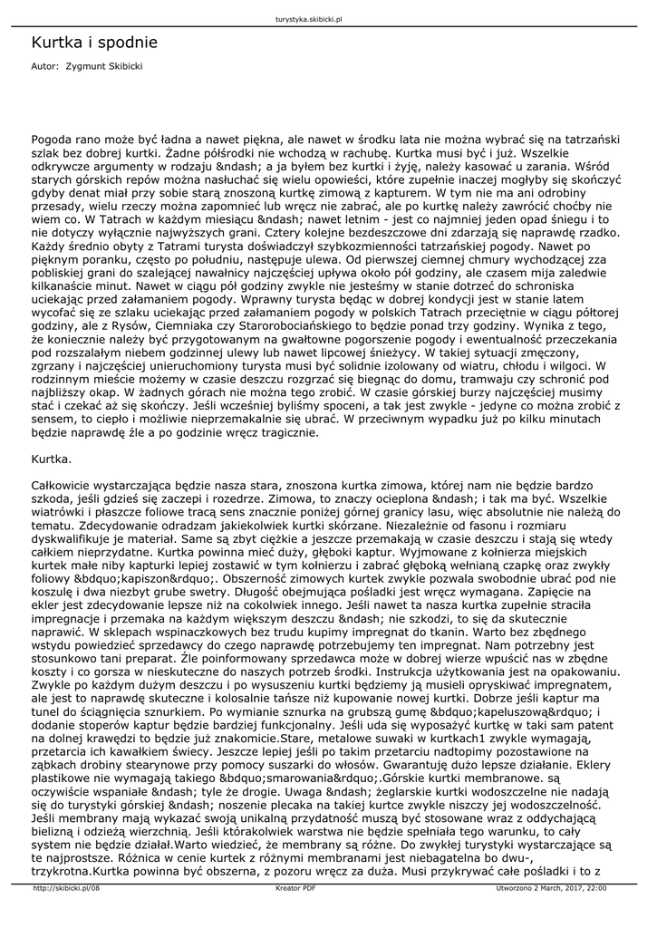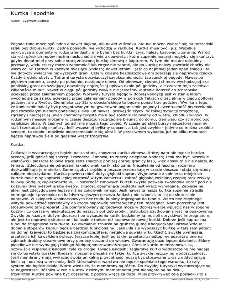 turystyka.skibicki.pl Kurtka i spodnie Autor: Zygmunt Skibicki Pogoda rano może być ładna a nawet piękna, ale nawet w środku lata nie można wybrać się na tatrzański szlak bez dobrej kurtki. Żadne półśrodki nie wchodzą w rachubę. Kurtka musi być i już. Wszelkie odkrywcze argumenty w rodzaju – a ja byłem bez kurtki i żyję, należy kasować u zarania. Wśród starych górskich repów można nasłuchać się wielu opowieści, które zupełnie inaczej mogłyby się skończyć gdyby denat miał przy sobie starą znoszoną kurtkę zimową z kapturem. W tym nie ma ani odrobiny przesady, wielu rzeczy można zapomnieć lub wręcz nie zabrać, ale po kurtkę należy zawrócić choćby nie wiem co. W Tatrach w każdym miesiącu – nawet letnim - jest co najmniej jeden opad śniegu i to nie dotyczy wyłącznie najwyższych grani. Cztery kolejne bezdeszczowe dni zdarzają się naprawdę rzadko. Każdy średnio obyty z Tatrami turysta doświadczył szybkozmienności tatrzańskiej pogody. Nawet po pięknym poranku, często po południu, następuje ulewa. Od pierwszej ciemnej chmury wychodzącej zza pobliskiej grani do szalejącej nawałnicy najczęściej upływa około pół godziny, ale czasem mija zaledwie kilkanaście minut. Nawet w ciągu pół godziny zwykle nie jesteśmy w stanie dotrzeć do schroniska uciekając przed załamaniem pogody. Wprawny turysta będąc w dobrej kondycji jest w stanie latem wycofać się ze szlaku uciekając przed załamaniem pogody w polskich Tatrach przeciętnie w ciągu półtorej godziny, ale z Rysów, Ciemniaka czy Starorobociańskiego to będzie ponad trzy godziny. Wynika z tego, że koniecznie należy być przygotowanym na gwałtowne pogorszenie pogody i ewentualność przeczekania pod rozszalałym niebem godzinnej ulewy lub nawet lipcowej śnieżycy. W takiej sytuacji zmęczony, zgrzany i najczęściej unieruchomiony turysta musi być solidnie izolowany od wiatru, chłodu i wilgoci. W rodzinnym mieście możemy w czasie deszczu rozgrzać się biegnąc do domu, tramwaju czy schronić pod najbliższy okap. W żadnych górach nie można tego zrobić. W czasie górskiej burzy najczęściej musimy stać i czekać aż się skończy. Jeśli wcześniej byliśmy spoceni, a tak jest zwykle - jedyne co można zrobić z sensem, to ciepło i możliwie nieprzemakalnie się ubrać. W przeciwnym wypadku już po kilku minutach będzie naprawdę źle a po godzinie wręcz tragicznie. Kurtka. Całkowicie wystarczająca będzie nasza stara, znoszona kurtka zimowa, której nam nie będzie bardzo szkoda, jeśli gdzieś się zaczepi i rozedrze. Zimowa, to znaczy ocieplona – i tak ma być. Wszelkie wiatrówki i płaszcze foliowe tracą sens znacznie poniżej górnej granicy lasu, więc absolutnie nie należą do tematu. Zdecydowanie odradzam jakiekolwiek kurtki skórzane. Niezależnie od fasonu i rozmiaru dyskwalifikuje je materiał. Same są zbyt ciężkie a jeszcze przemakają w czasie deszczu i stają się wtedy całkiem nieprzydatne. Kurtka powinna mieć duży, głęboki kaptur. Wyjmowane z kołnierza miejskich kurtek małe niby kapturki lepiej zostawić w tym kołnierzu i zabrać głęboką wełnianą czapkę oraz zwykły foliowy „kapiszon”. Obszerność zimowych kurtek zwykle pozwala swobodnie ubrać pod nie koszulę i dwa niezbyt grube swetry. Długość obejmująca pośladki jest wręcz wymagana. Zapięcie na ekler jest zdecydowanie lepsze niż na cokolwiek innego. Jeśli nawet ta nasza kurtka zupełnie straciła impregnacje i przemaka na każdym większym deszczu – nie szkodzi, to się da skutecznie naprawić. W sklepach wspinaczkowych bez trudu kupimy impregnat do tkanin. Warto bez zbędnego wstydu powiedzieć sprzedawcy do czego naprawdę potrzebujemy ten impregnat. Nam potrzebny jest stosunkowo tani preparat. Źle poinformowany sprzedawca może w dobrej wierze wpuścić nas w zbędne koszty i co gorsza w nieskuteczne do naszych potrzeb środki. Instrukcja użytkowania jest na opakowaniu. Zwykle po każdym dużym deszczu i po wysuszeniu kurtki będziemy ją musieli opryskiwać impregnatem, ale jest to naprawdę skuteczne i kolosalnie tańsze niż kupowanie nowej kurtki. Dobrze jeśli kaptur ma tunel do ściągnięcia sznurkiem. Po wymianie sznurka na grubszą gumę „kapeluszową” i dodanie stoperów kaptur będzie bardziej funkcjonalny. Jeśli uda się wyposażyć kurtkę w taki sam patent na dolnej krawędzi to będzie już znakomicie.Stare, metalowe suwaki w kurtkach1 zwykle wymagają, przetarcia ich kawałkiem świecy. Jeszcze lepiej jeśli po takim przetarciu nadtopimy pozostawione na ząbkach drobiny stearynowe przy pomocy suszarki do włosów. Gwarantuję dużo lepsze działanie. Eklery plastikowe nie wymagają takiego „smarowania”.Górskie kurtki membranowe. są oczywiście wspaniałe – tyle że drogie. Uwaga – żeglarskie kurtki wodoszczelne nie nadają się do turystyki górskiej – noszenie plecaka na takiej kurtce zwykle niszczy jej wodoszczelność. Jeśli membrany mają wykazać swoją unikalną przydatność muszą być stosowane wraz z oddychającą bielizną i odzieżą wierzchnią. Jeśli którakolwiek warstwa nie będzie spełniała tego warunku, to cały system nie będzie działał.Warto wiedzieć, że membrany są różne. Do zwykłej turystyki wystarczające są te najprostsze. Różnica w cenie kurtek z różnymi membranami jest niebagatelna bo dwu-, trzykrotna.Kurtka powinna być obszerna, z pozoru wręcz za duża. Musi przykrywać całe pośladki i to z http://skibicki.pl/08 Kreator PDF Utworzono 2 March, 2017, 22:00 turystyka.skibicki.pl niewielkim zapasem. Rękawy powinny być na tyle długie, że podniesienie rąk do pionu nie może odsłaniać pośladków. Próbę tą wykonujemy po ubraniu całego kompletu odzieży. Kaptur – najlepiej z daszkiem, powinien osłaniać brodę i mieć ściągacz ze stoperami, aby móc zamknąć go wokół oczu i nosa. Kaptury tych kurtek nie mają ocieplenia i dlatego potrze