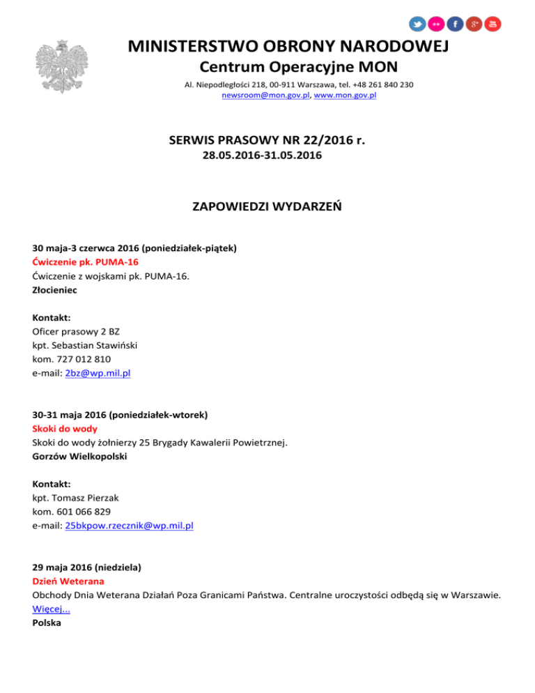 MINISTERSTWO OBRONY NARODOWEJ Centrum Operacyjne MON Al. Niepodległości 218, 00-911 Warszawa, tel. +48 261 840 230 [email protected], www.mon.gov.pl SERWIS PRASOWY NR 22/2016 r. 28.05.2016-31.05.2016 ZAPOWIEDZI WYDARZEŃ 30 maja-3 czerwca 2016 (poniedziałek-piątek) Ćwiczenie pk. PUMA-16 Ćwiczenie z wojskami pk. PUMA-16. Złocieniec Kontakt: Oficer prasowy 2 BZ kpt. Sebastian Stawiński kom. 727 012 810 e-mail: [email protected] 30-31 maja 2016 (poniedziałek-wtorek) Skoki do wody Skoki do wody żołnierzy 25 Brygady Kawalerii Powietrznej. Gorzów Wielkopolski Kontakt: kpt. Tomasz Pierzak kom. 601 066 829 e-mail: [email protected] 29 maja 2016 (niedziela) Dzień Weterana Obchody Dnia Weterana Działań Poza Granicami Państwa. Centralne uroczystości odbędą się w Warszawie. Więcej... Polska Kontakt: Newsroom MON e-mail: [email protected] 2-5 czerwca 2016 (czwartek-niedziela) Targi Pro Defense Jedyne targi proobronne w Polsce połączone z Kongresem Organizacji Proobronnych, w którym wezmą udział przedstawiciele organizacji z krajów członkowskich NATO. Więcej... Ostróda (CTK Expo-Mazury, ul. Grunwaldzka 55) Kontakt: Artur Wróbel kom. 722 389 596 e-mail: [email protected] Targi Pro Defense Dagmara Alsztyniuk tel. 667 779 330 e-mail: [email protected] 7-17 czerwca 2016 Ćwiczenie Anakonda 16 Najważniejsze szkolenie polskich Sił Zbrojnych, w którym po raz trzeci wezmą udział żołnierze krajów NATO i Partnerstwa dla Pokoju. Warszawa Kontakt: Rzecznik prasowy DO ppłk Piotr Walatek kom. 607 388 937 e-mail: [email protected] 23 czerwca 2016 (czwartek) Akredytacje na szczyt NATO Akredytacje dla dziennikarzy na lipcowy szczyt NATO w Warszawie trwają do 23 czerwca. Więcej... Warszawa Kontakt: Joanna Wajda Tel.: +48 22 523 71 83 Email: [email protected] KRONIKA 20 maja 2016 (piątek) Specjalsi świętowali w Krakowie Wojska Specjalne po raz kolejny świętowały przypadającą na 24 maja rocznicę uzyskania statusu odrębnego Rodzaju Sił Zbrojnych, W krakowskim Muzeum Lotnictwa Polskiego w piątek 20 maja br. zaprezentowali się komandosi wszystkich jednostek wchodzących w skład Wojsk Specjalnych. Więcej... 23 maja 2016 (poniedziałek) Polscy żołnierze na zawodach W poniedziałek 23 maja po raz kolejny rozpoczęły się w Danii międzynarodowe zawody użyteczno-bojowe pk. Nordic Tank Challenge (NTC). Pierwszy raz w historii tych zawodów, zorganizowanych przez 1Batalion Czołgów z Jutlandzkiego Pułku Dragonów z m. Holstebro, biorą udział reprezentanci z 34 Brygady Kawalerii Pancernej z Żagania. Więcej... 23 maja 2016 (wtorek) Minister Macierewicz z wizytą w Atenach Rozwój współpracy dwustronnej, sytuacja bezpieczeństwa w Europie oraz kwestie związane ze zbliżającym się szczytem NATO – to główne tematy poruszane podczas spotkania ministrów obrony Polski i Grecji. Grecja zadeklarowała zgodę na utrzymanie sankcji dla Rosji i poparcie dla postulatów Polski na szczycie NATO w Warszawie. Więcej... 24 maja 2016 (wtorek) Spotkanie szefa MON z mediami na PGE Narodowy Dzisiejsza prezentacja wyszkolenia to tylko fragment działań Żandarmerii Wojskowej. Działań, które mają skutecznie zagwarantować bezpieczeństwo wszystkim uczestnikom szczytu oraz wyeliminować potencjalne zagrożenia – powiedział we wtorek minister obrony narodowej Antoni Macierewicz po obejrzeniu prezentacji wyszkolenia żołnierzy ŻW. Więcej...