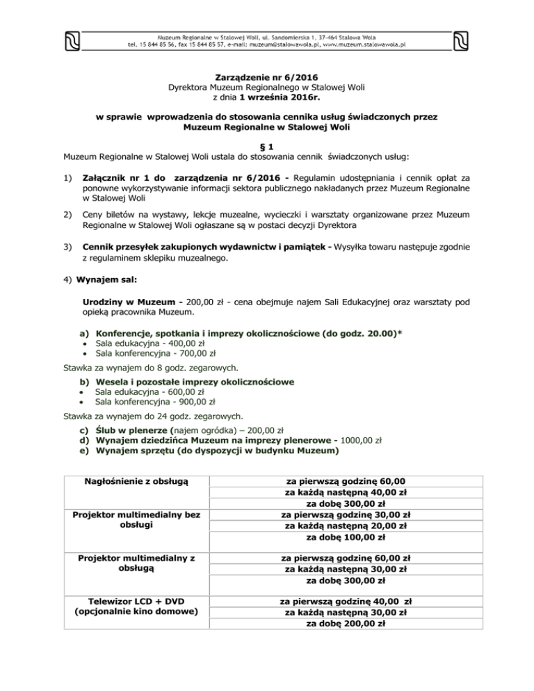 Zarządzenie nr 6/2016 Dyrektora Muzeum Regionalnego w Stalowej Woli z dnia 1 września 2016r. w sprawie wprowadzenia do stosowania cennika usług świadczonych przez Muzeum Regionalne w Stalowej Woli §1 Muzeum Regionalne w Stalowej Woli ustala do stosowania cennik świadczonych usług: 1) Załącznik nr 1 do zarządzenia nr 6/2016 - Regulamin udostępniania i cennik opłat za ponowne wykorzystywanie informacji sektora publicznego nakładanych przez Muzeum Regionalne w Stalowej Woli 2) Ceny biletów na wystawy, lekcje muzealne, wycieczki i warsztaty organizowane przez Muzeum Regionalne w Stalowej Woli ogłaszane są w postaci decyzji Dyrektora 3) Cennik przesyłek zakupionych wydawnictw i pamiątek - Wysyłka towaru następuje zgodnie z regulaminem sklepiku muzealnego. 4) Wynajem sal: Urodziny w Muzeum - 200,00 zł - cena obejmuje najem Sali Edukacyjnej oraz warsztaty pod opieką pracownika Muzeum. a) Konferencje, spotkania i imprezy okolicznościowe (do godz. 20.00)* Sala edukacyjna - 400,00 zł Sala konferencyjna - 700,00 zł Stawka za wynajem do 8 godz. zegarowych. b) Wesela i pozostałe imprezy okolicznościowe Sala edukacyjna - 600,00 zł Sala konferencyjna - 900,00 zł Stawka za wynajem do 24 godz. zegarowych. c) Ślub w plenerze (najem ogródka) – 200,00 zł d) Wynajem dziedzińca Muzeum na imprezy plenerowe - 1000,00 zł e) Wynajem sprzętu (do dyspozycji w budynku Muzeum) Nagłośnienie z obsługą Projektor multimedialny bez obsługi za pierwszą godzinę 60,00 za każdą następną 40,00 zł za dobę 300,00 zł za pierwszą godzinę 30,00 zł za każdą następną 20,00 zł za dobę 100,00 zł Projektor multimedialny z obsługą za pierwszą godzinę 60,00 zł za każdą następną 30,00 zł za dobę 300,00 zł Telewizor LCD + DVD (opcjonalnie kino domowe) za pierwszą godzinę 40,00 zł za każdą następną 30,00 zł za dobę 200,00 zł 5) Sesje zdjęciowe w Muzeum. Sesja na wystawach w Muzeum przy ul. Sandomierskiej 1 - 150,00 zł (3 godz. zegarowe) Sesja na dziedzińcu Muzeum „Plenerowa Galeria Rzeźb" przy ul. Sandomierskiej 1 - 50,00 zł Sesja na wystawach w Muzeum i na dziedzińcu przy ul. Sandomierskiej - 180,00 zł. Sesja Specjalna - na życzenie klienta istnieje możliwość udostępnienia wybranej ekspozycji poza godzinami pracy Muzeum - 300,00 zł Sesje realizowane są w godzinach pracy Muzeum, po uprzedniej rezerwacji. §2 Wszystkie ceny są cenami brutto. §3 W przypadku zdjęć wykonywanych na zlecenie przez Muzeum negatywy pozostają w zasobach Muzeum §4 1. Dyrektor Muzeum może udzielić następujących rabatów od obowiązujących kwot dot. cennika stanowiącego załącznik nr 1 do niniejszego zarządzenia w wysokości: a) klienci indywidualni – 20 % b) pracownicy Muzeum Regionalnego w Stalowej Woli – 70 % 2. Uczniowie i studenci uprawnieni są do zniżki w wysokości 50%. 3. Dyrektor ustala stały rabat dla pracowników Muzeum Regionalnego w Stalowej Woli na zakup wydawnictw oraz pozostałych towarów po cenie zakupu. §5 Na wszystkie inne usługi, nie wymienione w cenniku stosuje się ceny umowne. §6 W uzasadnionych przypadkach Dyrektor Muzeum Regionalnego może odstąpić od pobrania opłaty w zamian za wykonanie na rzecz Muzeum innych usług lub przekazanie nieodpłatnie wydawnictw itp. §7 Traci moc zarządzenie nr 28/2013 z dnia 16 grudnia 2013 r. §8 Zarządzenie wchodzi w życie z dniem 1 września 2016 r. Dyrektor Muzeum Regionalnego w Stalowej Woli Lucyna Mizera Załącznik nr 1 do zarządzenia nr 6/2016 Regulamin udostępniania i cennik opłat za ponowne wykorzystywanie informacji sektora publicznego nakładanych przez Muzeum Regionalne w Stalowej Woli §1 Udostępnienie przez Muzeum Regionalne w Stalowej Woli fotografii, materiałów archiwalnych lub innych informacji sektora publicznego w rozumieniu ustawy z dnia 25 lutego 2016 r. o ponownym wykorzystywaniu informacji sektora publicznego ( Dz. U. z 2016 r. poz.352) we wszelkiego rodzaju publikacjach oraz dla celów badań naukowych, a także wydawanie zgody na reprodukowanie wizerunków dzieł i zgody na filmowanie, następuje na zasadach określonych niniejszym regulaminem, przy uwzględnieniu przepisów ww. ustawy jak również Rozporządzenia Ministra Kultury i Dziedzictwa Narodowego z dnia 5 lipca 2016 r. w sprawie maksymalnych stawek opłat za ponowne wykorzystywanie informacji sektora publicznego nakładanych przez muzea państwowe i muzea samorządowe. §2 1. Udostępnianie i przekazywanie informacji sektora publicznego w celu ponownego wykorzystywania następuje na podstawie pisemnego zamówienia skierowanego pocztą elektroniczną lub pocztą tradycyjną do Dyrektora Muzeum Regionalnego w Stalowej Woli. 2. Pisemny wniosek o którym mowa w pkt. 1 powinien zawierać wszystkie informacje niezbędne do identyfikacji osoby zamawiającej oraz przedmiotu zamówienia, w tym w szczególności: imię i nazwisko lub nazwę firmy, adres do korespondencji, telefon kontaktowy, adres e-mail oraz informacje o planowanym wykorzystaniu informacji sektora publicznego, w tym rodzaj kopii oraz zakres rozpowszechniania materiału oraz w przypadku fotografii rodzaj i format zdjęcia. §3 1. Stawki opłat wynoszą w przypadku udostępniania lub przekazywania informacji, o których mowa w § 1: 1) za pośrednictwem systemu teleinformatycznego – od 50 zł do 118 zł za jednorazowe udostępnienie; 2) w postaci kopii (reprodukcji) cyfrowej – od 30 zł do 172 zł za jeden skan lub fotografię cyfrową zapisane na nośniku cyfrowym; 3) w postaci fotografii lub skanu: a) za sztukę w formacie nie większym niż 50 x 60 cm – od 30 zł do 168 zł, b) za 1 m2 w formacie większym niż określony w lit. a – 513 zł; 4) w postaci papierowej: a) za jedną stronę odbitki lub wydruku kolorowego: I. w formacie A4 – od 5 zł do 33 zł, II. w formacie A3 – od 10 zł do 61 zł, b) za jedną stronę odbitki lub wydruku czarno-białego: I. w formacie A4 – od 0,30 zł do 25 zł, II. w formacie A3 – od 0,4