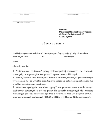 ………………………………………….. ………………………………………………… Imię i nazwisko miejscowośd i data …………………………………………………………… Miejsce zamieszkania Dyrektor Miejskiego Ośrodka Pomocy Rodzinie ul. Strzelców Bytomskich 16 41-902 Bytom OŚWIADCZENIA Ja niżej podpisana/podpisany* legitymująca/legitymujący* się dowodem osobistym seria…………………. nr …………………………….wydanym przez…………………………………………………………………………………………………………………. oświadczam, że: 1. Posiadam/nie posiadam* pełną zdolnośd/pełnej zdolności* do czynności prawnych, korzystam/nie korzystam* z pełni praw publicznych. 2. Byłam/byłem* nie byłam/nie byłem* skazana/skazany* prawomocnym wyrokiem sądu za umyślne przestępstwo ścigane z oskarżenia publicznego lub umyślne przestępstwo skarbowe. 3. Wyrażam zgodę/nie wyrażam zgody* na przetwarzanie moich danych osobowych zawartych w ofercie pracy dla potrzeb niezbędnych dla realizacji niniejszego procesu rekrutacji, zgodnie z ustawą z dnia 29 sierpnia 1997r. o ochronie danych osobowych ( DZ. U. z 2002r. nr 101, poz. 926 z późn. zm. ). ………………………………………………………. Podpis * niepotrzebne skreślid
