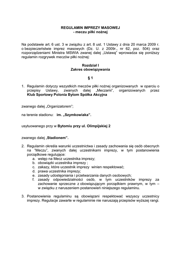 REGULAMIN IMPREZY MASOWEJ - meczu piłki nożnej Na podstawie art. 6 ust. 3 w związku z art. 8 ust. 1 Ustawy z dnia 20 marca 2009 r. o bezpieczeństwie imprez masowych (Dz. U. z 2009r., nr 62, poz. 504) oraz rozporządzeniami Ministra MSWIA zwanej dalej „Ustawą” wprowadza się poniższy regulamin rozgrywek meczów piłki nożnej: Rozdział I Zakres obowiązywania §1 1. Regulamin dotyczy wszystkich meczów piłki nożnej organizowanych w oparciu o przepisy Ustawy, zwanych dalej „Meczami”, organizowanych przez Klub Sportowy Polonia Bytom Spółka Akcyjna zwanego dalej „Organizatorem”; na terenie stadionu: im. „Szymkowiaka”. usytuowanego przy w Bytomiu przy ul. Olimpijskiej 2 zwanego dalej „Stadionem”. 2. Regulamin określa warunki uczestnictwa i zasady zachowania się osób obecnych na ”Meczu”, zwanych dalej uczestnikami imprezy, w tym postanowienia porządkowe regulujące: a. wstęp na Mecz uczestnika imprezy; b. obowiązki uczestnika imprezy ; c. zakazy, które uczestnik imprezy winien respektować; d. prawa uczestnika imprezy; e. zasady udostępniania i przetwarzania danych osobowych; f. zasady odpowiedzialności osób, w tym uczestników imprezy za zachowanie sprzeczne z obowiązującym porządkiem prawnym, w tym – w związku z naruszeniem postanowień niniejszego regulaminu. 3. Postanowienia regulaminu są obowiązani respektować wszyscy uczestnicy imprezy. Regulacje zawarte w regulaminie nie naruszają przepisów wyższej rangi. Rozdział II Wstęp i uczestnictwo w Meczu §2 1. Pozwolenie wejścia na teren Stadionu oraz możliwość pozostania na nim leży w gestii Organizatora, realizującego swe uprawnienia za pośrednictwem kierownika ds. bezpieczeństwa i podległych mu pracowników służb porządkowych oraz informacyjnych, odpowiednio oznakowanych, w tym w identyfikatory wydane przez organizatora imprezy masowej, umieszczone w widocznym miejscu. W okolicznościach określonych odrębnymi przepisami wiążące polecenia dla uczestnika imprezy mogą wydawać także funkcjonariusze Policji, Państwowej Straży Pożarnej, Straży Granicznej, Żandarmerii Wojskowej, a w razie potrzeby – przedstawiciele innych służb i organów do tego uprawnionych 2. Na teren Stadionu może wejść oraz następnie przebywać na jego terenie wyłącznie osoba, która : a. posiada dokument tożsamości, ważny bilet i nie jest w stanie wskazującym na spożycie alkoholu lub innego podobnie działającego środka b. nie znajduje się pod wpływem działania środków odurzających, psychotropowych lub innych działających podobnie; c. nie narusza przepisów prawa oraz postanowień regulaminu obiektu lub imprezy; d. posiada odpowiednie dokumenty wymienione w ust.3 e. nie posiada prawomocnych zakazów uczestnictwa w imprezach masowych organizowanych na Stadionie, f. znajduje się na liście autoryzowanej przez władze klubu drużyny gości – przepis dotyczy wyłącznie kibiców drużyny przyjezdnej. g. ukończyła 13 rok życia i będzie przebywała na imprezie masowej pod opieką opiekuna prawnego; h. dobrowolnie podda się systemowi identyfikacji w tym rejestracji swojego wizerunku oraz dokumentu tożsamości 3. Do wejścia i przebywania na terenie Stadionu uprawniają imiennie opisane, zgodnie z wymogami Ustawy, dokumenty wystawione przez Organizatora, tj.: a. bilet jednokrotnego wstępu na imprezę z kartą kibica b. karnet uprawniający do wielokrotnego wstępu na imprezę, c. zaproszenie lub inny dokument, z którego treści wynika uprawnienie osoby do wejścia i przebywania na terenie imprezy masowej, 4. Do wejścia na teren Obiektu dodatkowo uprawnia karta kibica w połączeniu z jednym z wymienionych w ust. 3 dokumentów. Karta kibica wydawana jest przez PZPN bądź zrzeszone w nim kluby oraz zrzeszone w PLP. 5. Do zakupu lub bezpłatnego otrzymania dokumentów, o których mowa w ust. 3, uprawnione są wyłącznie osoby posiadające kartę kibica wystawioną przez PZPN,PLP lub zrzeszone w niej kluby a w przypadku jej braku dokument tożsamości z nadanym numerem PESEL, zaś w przypadku obcokrajowców jakikolwiek inny powszechny dokument tożsamości. 6. Dokumenty, o których mowa w ust. 4 są imienne i nie podlegają przekazywaniu lub odsprzedaży. Rozdział III Obowiązki uczestnika Meczu §4 1. Uczestnik imprezy jest obowiązany: a. posiadać przy sobie i okazywać każdorazowo na żądanie służb organizatora dokument uprawniający do wejścia na Stadion oraz dokument tożsamości bądź kartę kibica; b. zajmować miejsce określone w dokumencie uprawniającym do wejścia na Stadion; c. zachowywać się w sposób zgodny z zasadami współżycia społecznego, w tym nie zagrażać bezpieczeństwu innych osób obecnych na Meczu przestrzegając postanowień regulaminów Stadionu i Imprezy Masowej; d. stosować się do zarządzeń i poleceń pracowników służby informacyjnej i porządkowej organizatora imprezy oraz spikera, a w przypadku interwencji funkcjonariuszy Policji, Państwowej Straży Pożarnej, Straży Granicznej, Żandarmerii Wojskowej lub pracowników innych uprawnionych służb i organów – do wykonywania ich poleceń; e. poddania się identyfikacji poprzez rejestrację przez wymienione służby ochrony wizerunku oraz dokumentu tożsamości f. nie zasłanianie twarzy w celu uniemożliwienia identyfikacji 2. Ze względów bezpieczeństwa Kibice zobowiązani są, na żądanie funkcjonariuszy i pracowników, o których mowa w ust. 1, zajmować miejsca inne niż określone w dokumencie uprawniającym do wejścia na Stadion. Rozdział IV Zakazy, które uczestnik imprezy winien respektować §5 1. Zabrania się posiadania i używania: a. przedmiotów niebezpiecznych, w tym szczególnie broni, w tym: palnej, białej, pneumatycznej, gazowej i innej nawet, gdy osoba jest uprawniona do jej posiadania. Przepis nie dotyczy funkcjonariuszy Policji oraz innych uprawnionych służb i organów w czasie wykonywania przez nich obowiązków służbowych; b. mate
